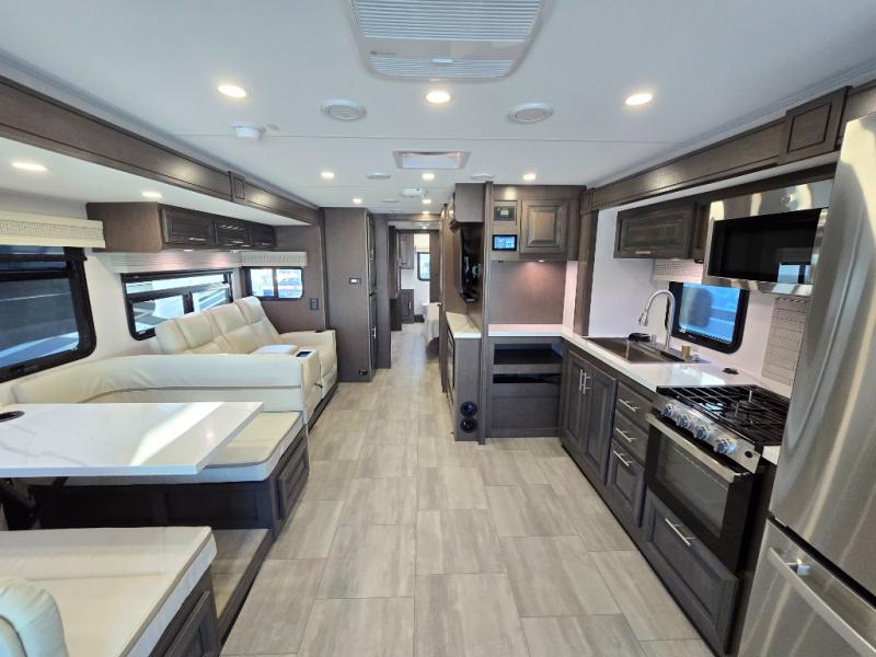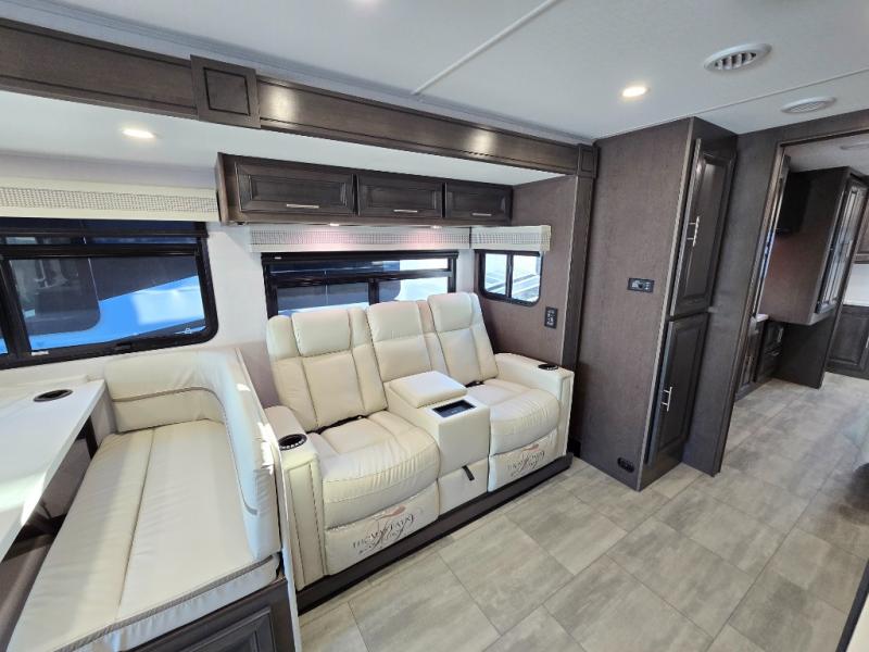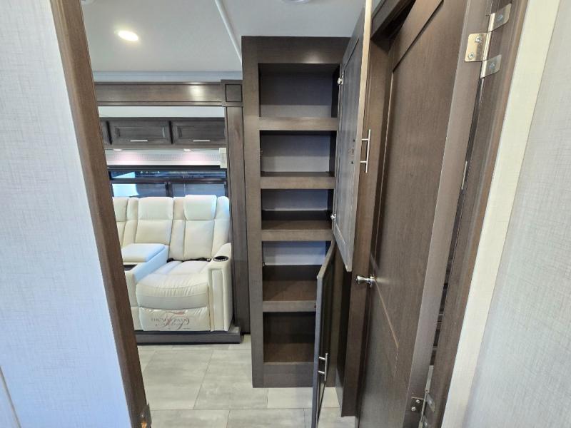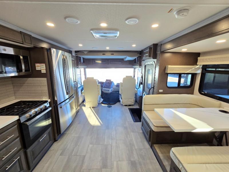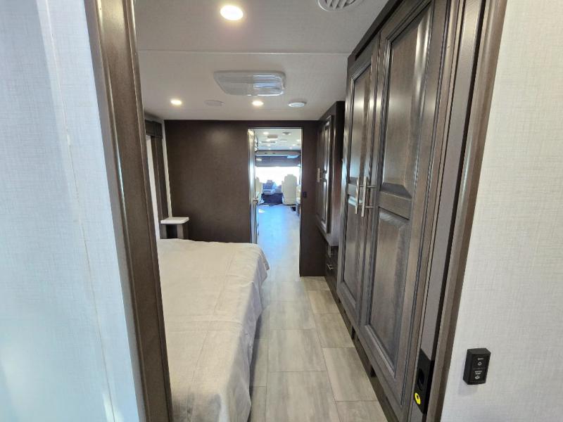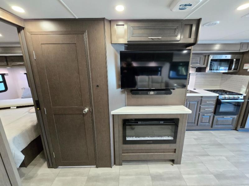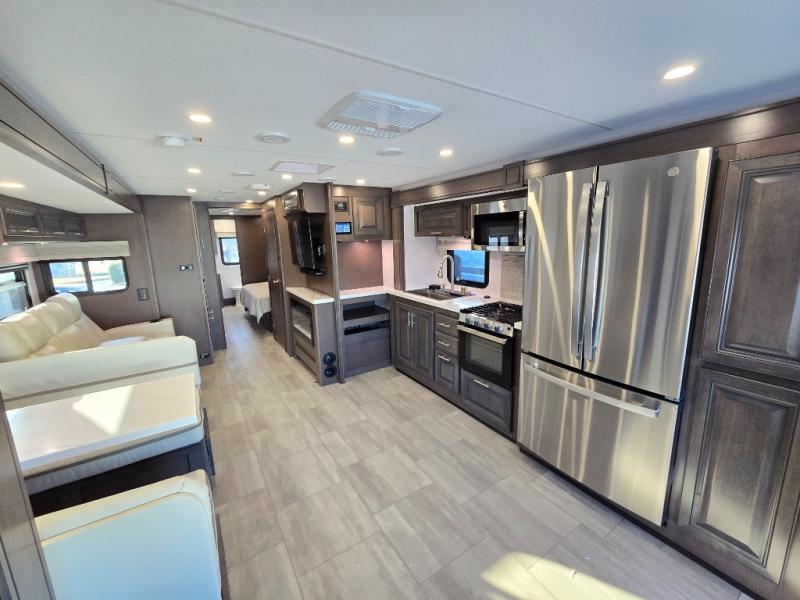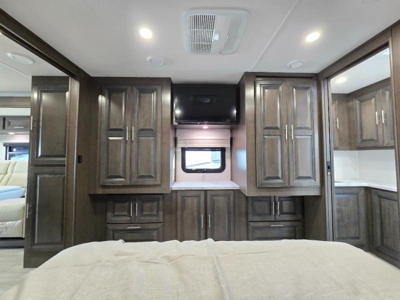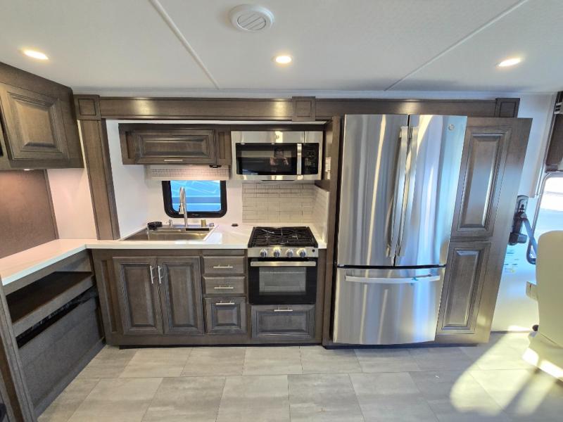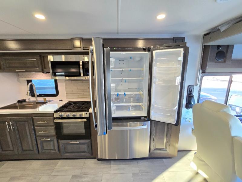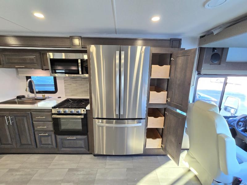 Three slides help to open up this motorhome! The kitchen slide features all of your essentials for cooking delicious meals and you even have a hutch with overhead cabinets to store all of your dishes. The Dream Dinette and Thomas Payne theater seating slide not only open up the living area but also provide comfortable places to eat meals and unwind in front of the 5,000 BTU fireplace and 40" LED TV after a long day of traveling. The half bathroom is close to the kitchen and living area, so you don't have to go far for a quick bathroom break. The master suite will have you feeling right at home with a 72" x 80" king bed slide to lay your head on at night with a dresser across from it that also has a 32" LED TV and wardrobes on either side of it with one of them with an optional washer and dryer. Plus, you even have access to the full rear bathroom which has a shower with a seat to freshen up in each morning!