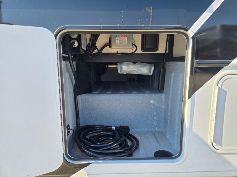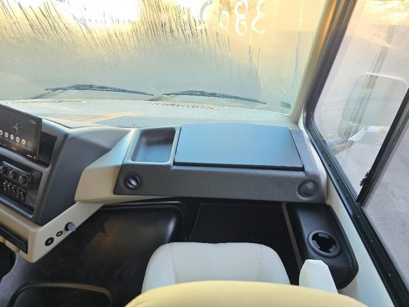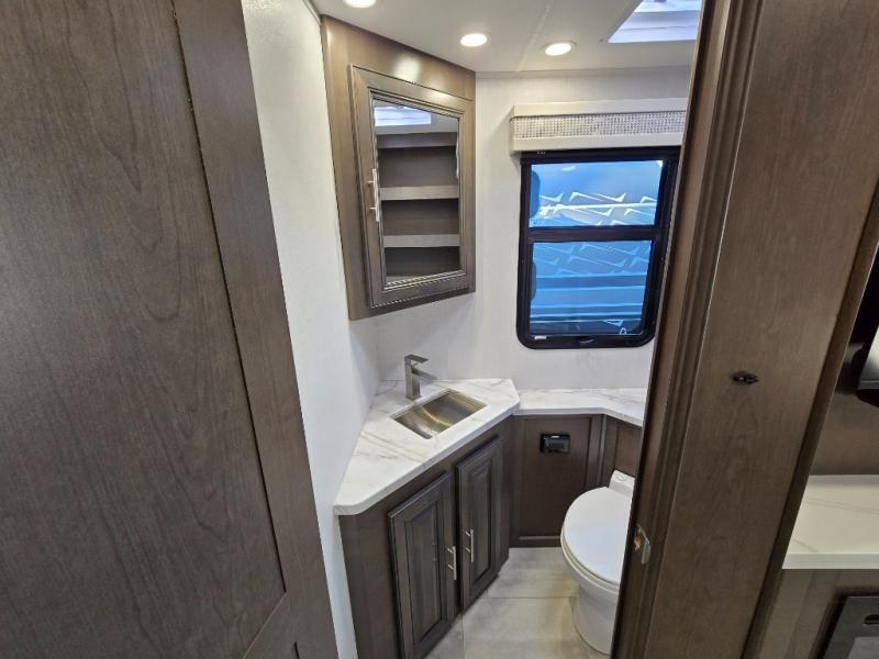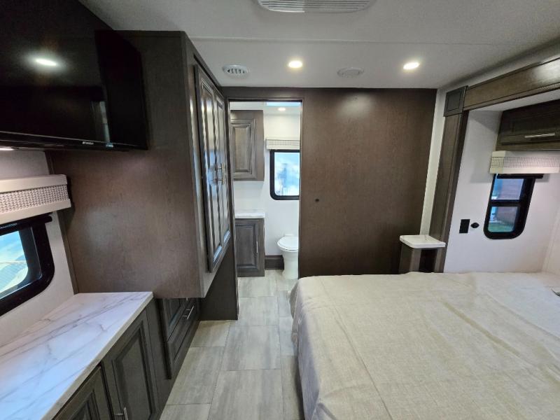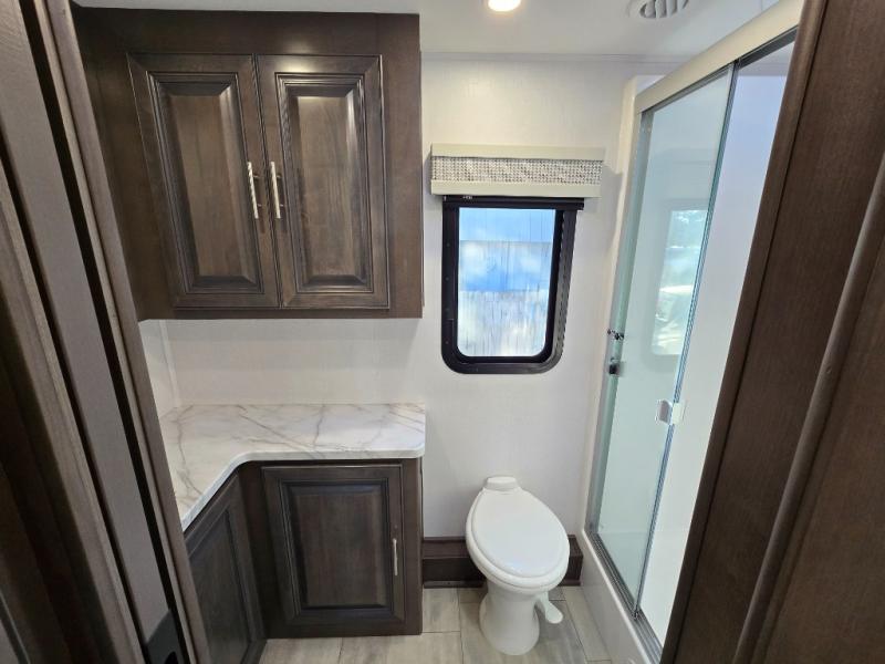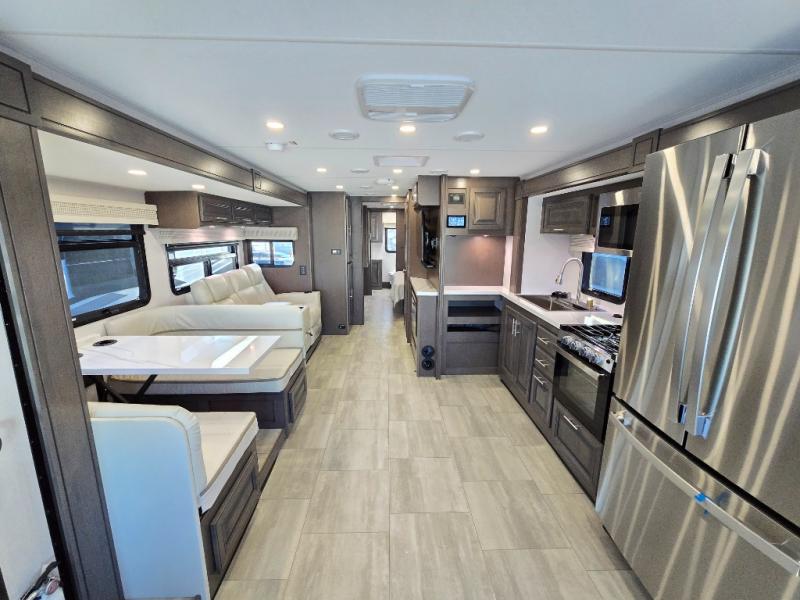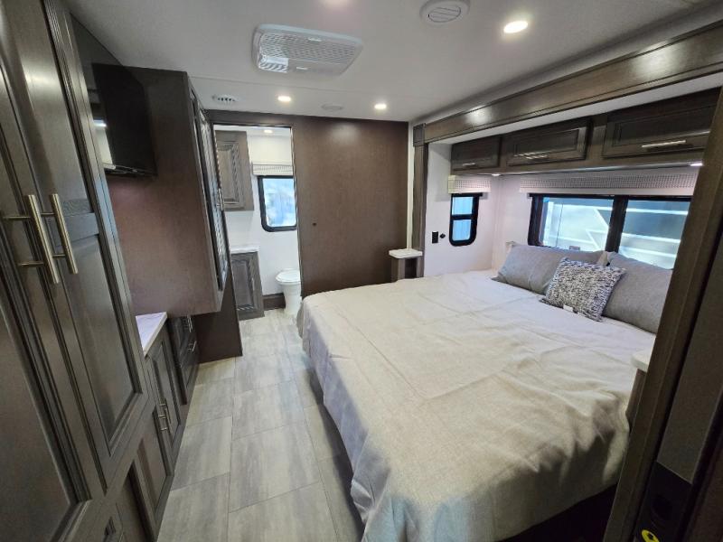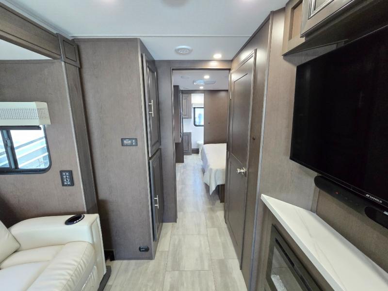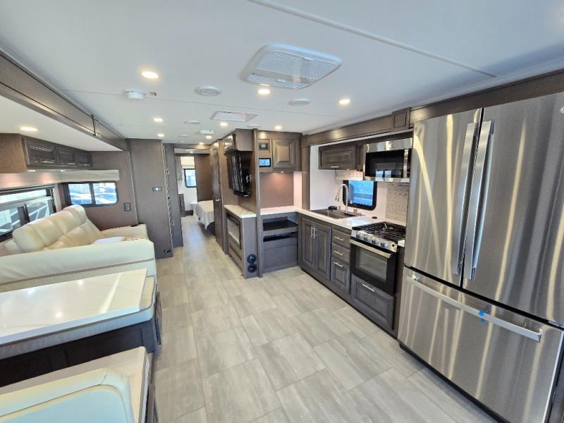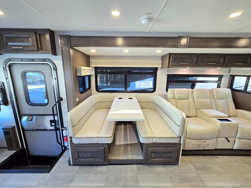 Three slides help to open up this motorhome! The kitchen slide features all of your essentials for cooking delicious meals and you even have a hutch with overhead cabinets to store all of your dishes. The Dream Dinette and Thomas Payne theater seating slide not only open up the living area but also provide comfortable places to eat meals and unwind in front of the 5,000 BTU fireplace and 40" LED TV after a long day of traveling. The half bathroom is close to the kitchen and living area, so you don't have to go far for a quick bathroom break. The master suite will have you feeling right at home with a 72" x 80" king bed slide to lay your head on at night with a dresser across from it that also has a 32" LED TV and wardrobes on either side of it with one of them with an optional washer and dryer. Plus, you even have access to the full rear bathroom which has a shower with a seat to freshen up in each morning!
