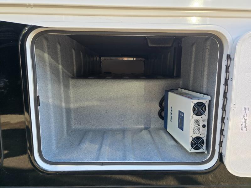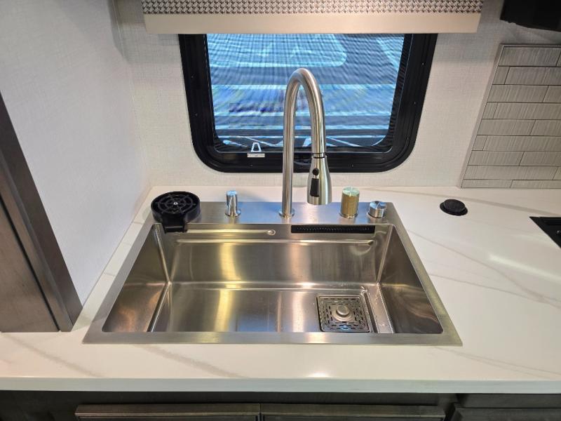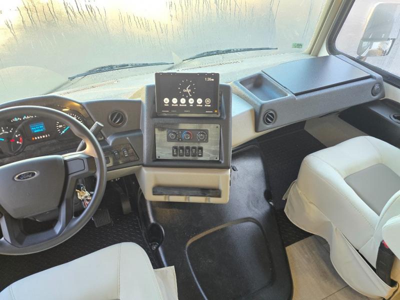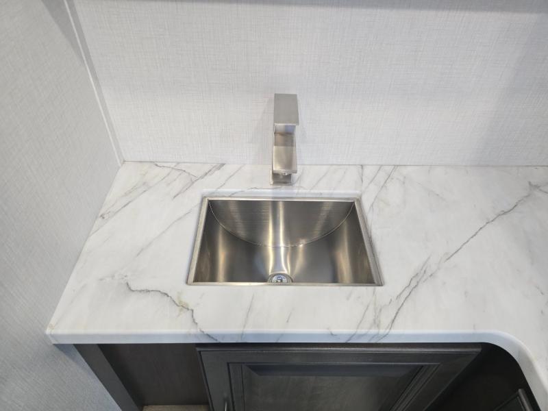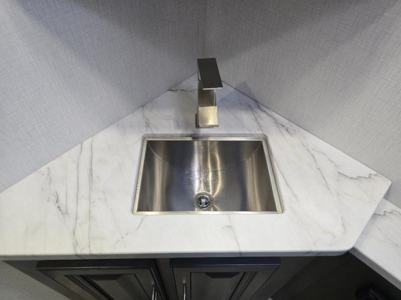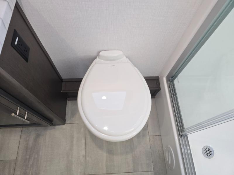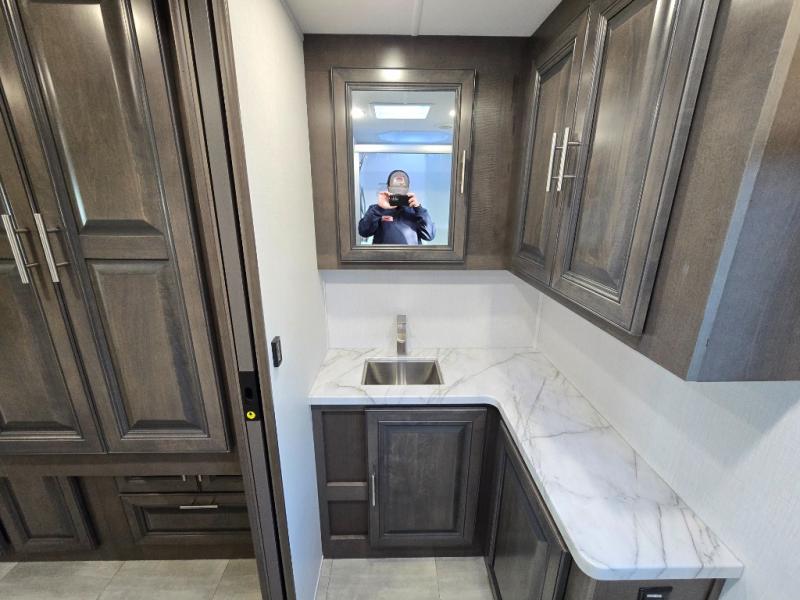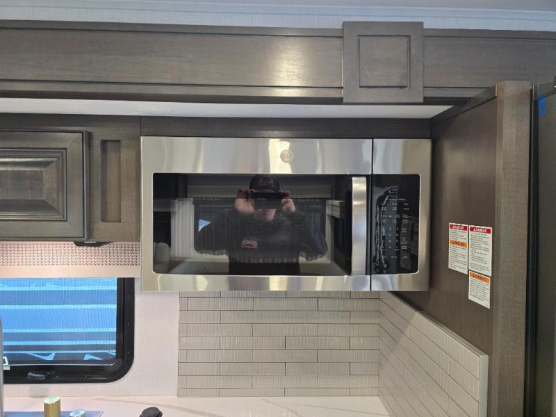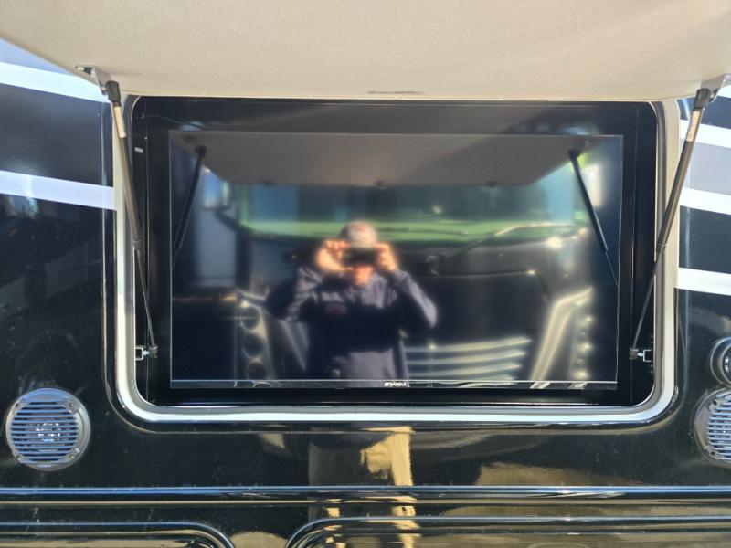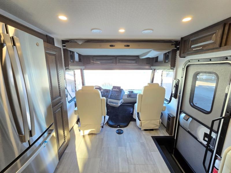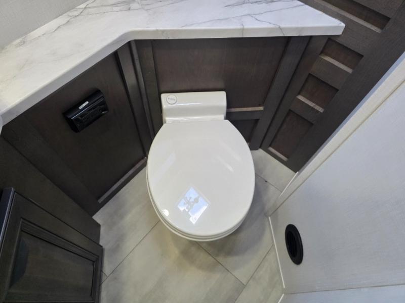Three slides help to open up this motorhome! The kitchen slide features all of your essentials for cooking delicious meals and you even have a hutch with overhead cabinets to store all of your dishes. The Dream Dinette and Thomas Payne theater seating slide not only open up the living area but also provide comfortable places to eat meals and unwind in front of the 5,000 BTU fireplace and 40" LED TV after a long day of traveling. The half bathroom is close to the kitchen and living area, so you don't have to go far for a quick bathroom break. The master suite will have you feeling right at home with a 72" x 80" king bed slide to lay your head on at night with a dresser across from it that also has a 32" LED TV and wardrobes on either side of it with one of them with an optional washer and dryer. Plus, you even have access to the full rear bathroom which has a shower with a seat to freshen up in each morning!