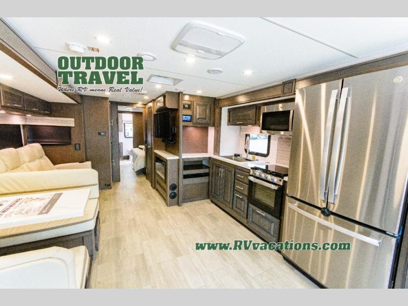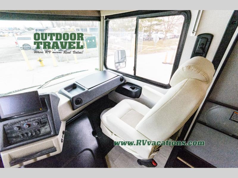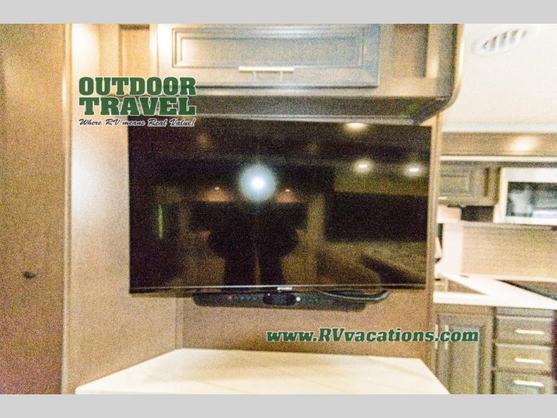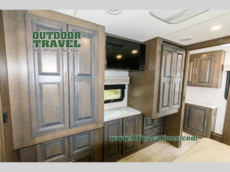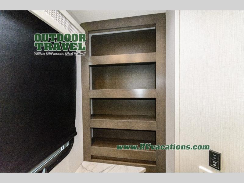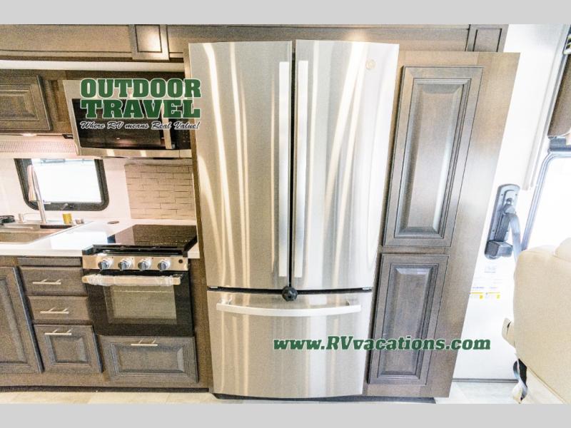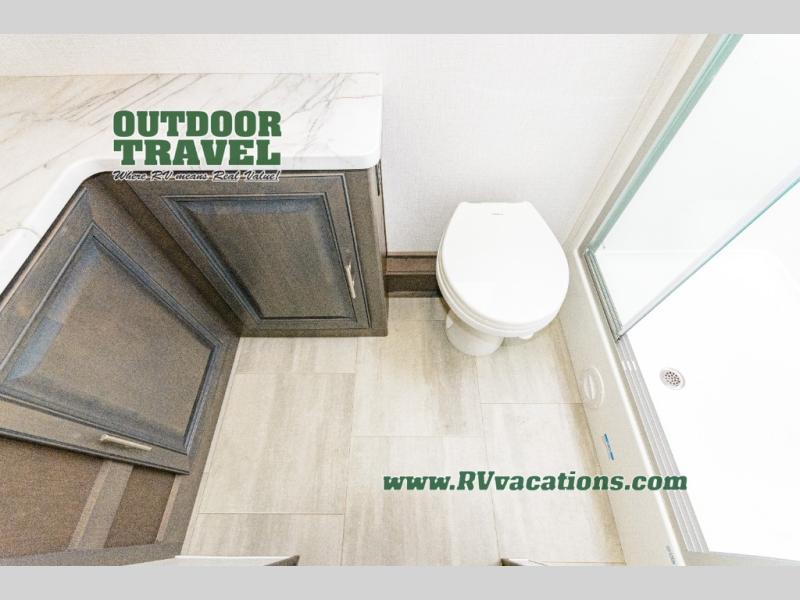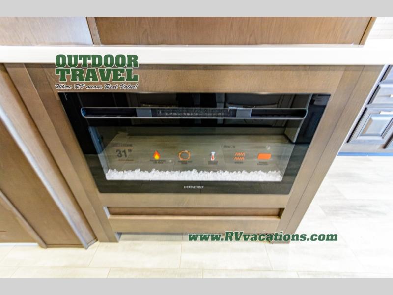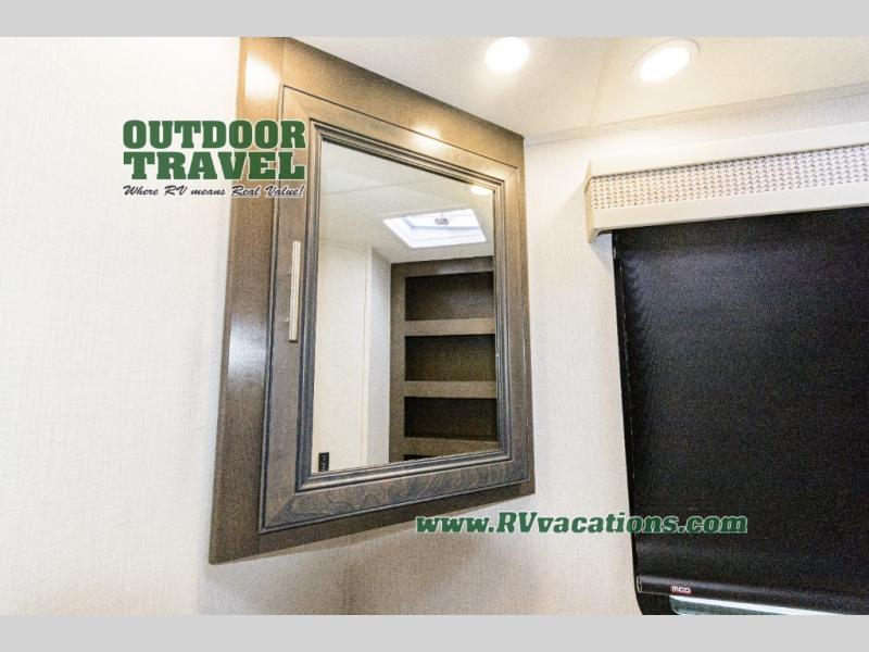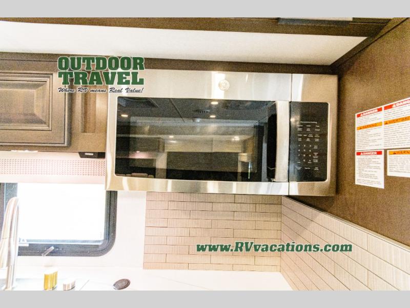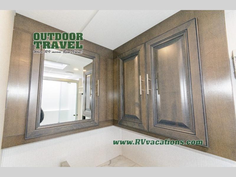 Three slides help to open up this motorhome! The kitchen slide features all of your essentials for cooking delicious meals and you even have a hutch with overhead cabinets to store all of your dishes. The Dream Dinette and Thomas Payne theater seating slide not only open up the living area but also provide comfortable places to eat meals and unwind in front of the 5,000 BTU fireplace and 40" LED TV after a long day of traveling. The half bathroom is close to the kitchen and living area, so you don't have to go far for a quick bathroom break. The master suite will have you feeling right at home with a 72" x 80" king bed slide to lay your head on at night with a dresser across from it that also has a 32" LED TV and wardrobes on either side of it with one of them with an optional washer and dryer. Plus, you even have access to the full rear bathroom which has a shower with a seat to freshen up in each morning!