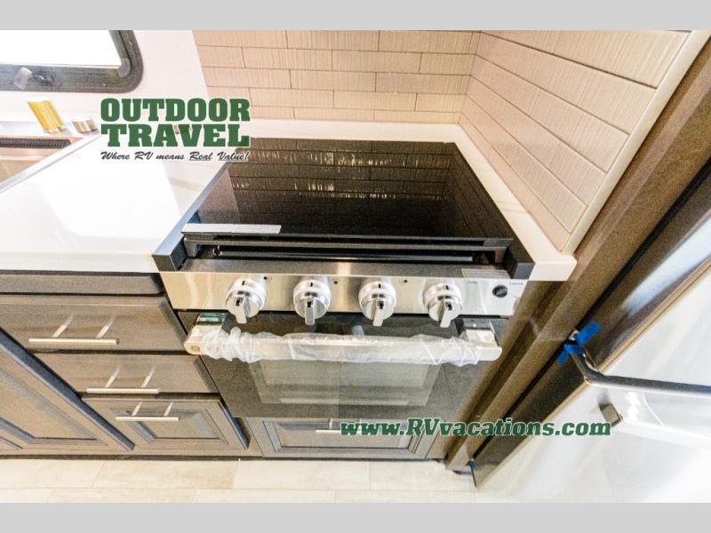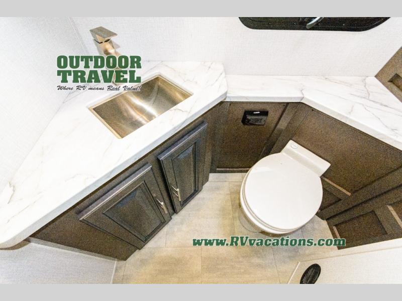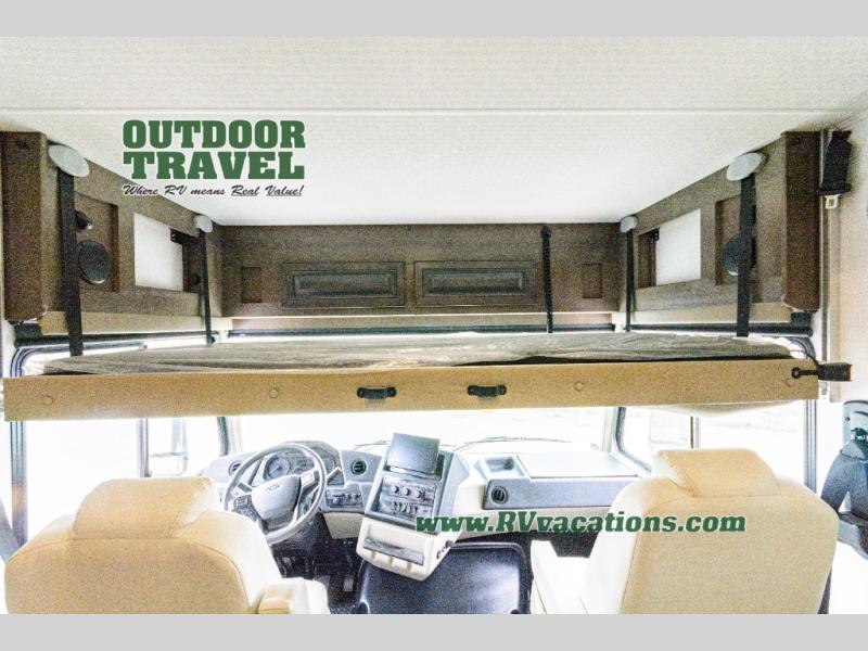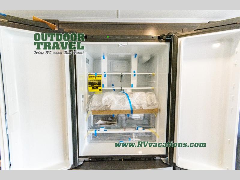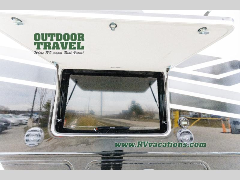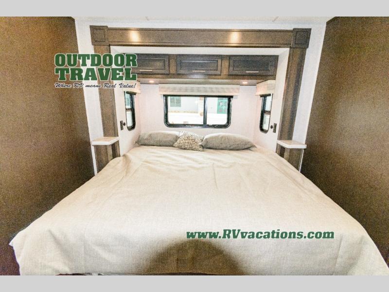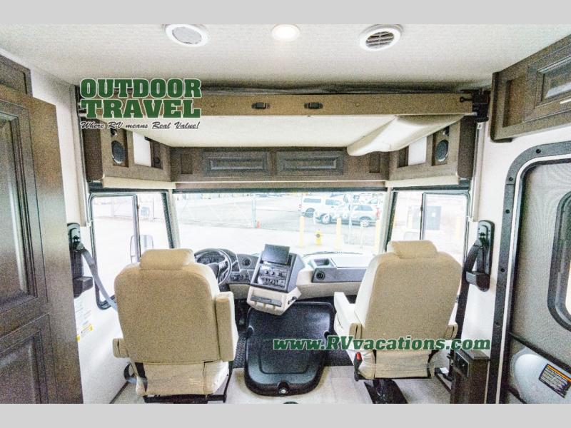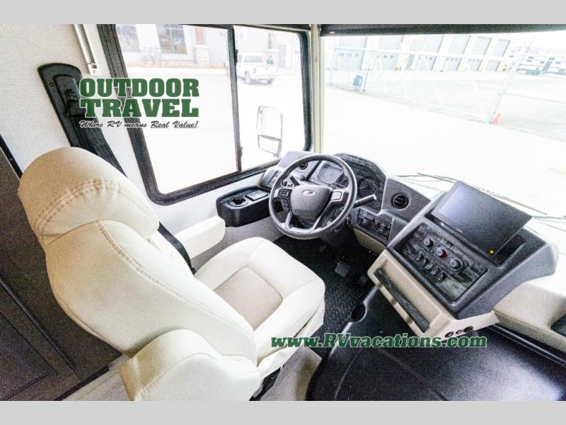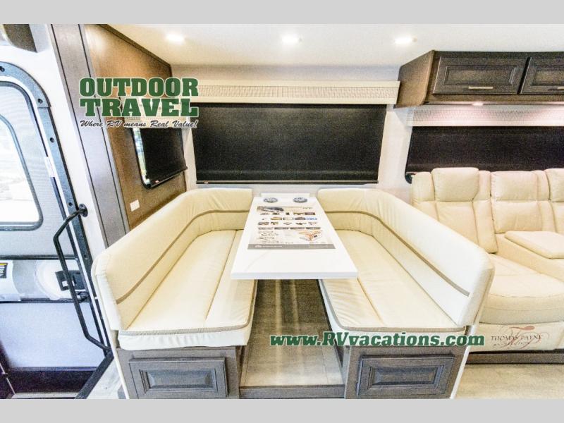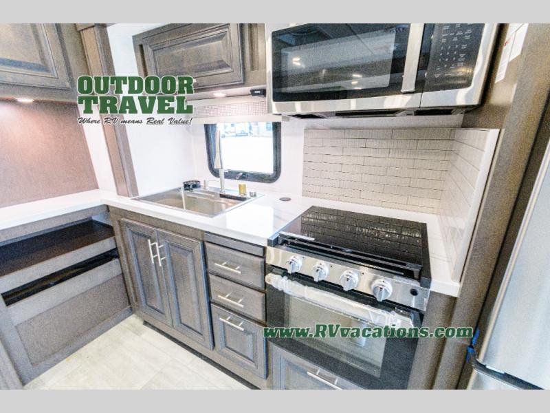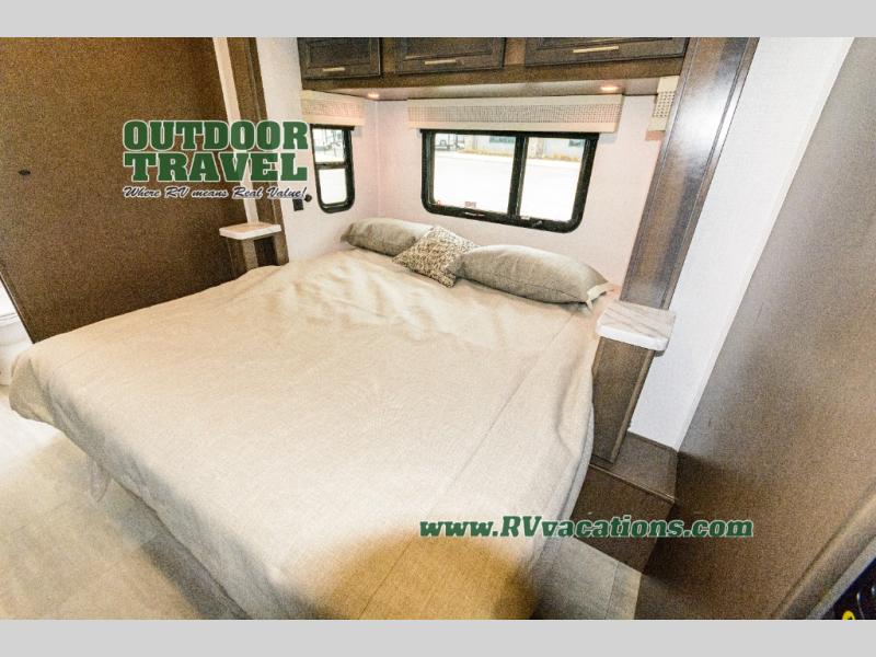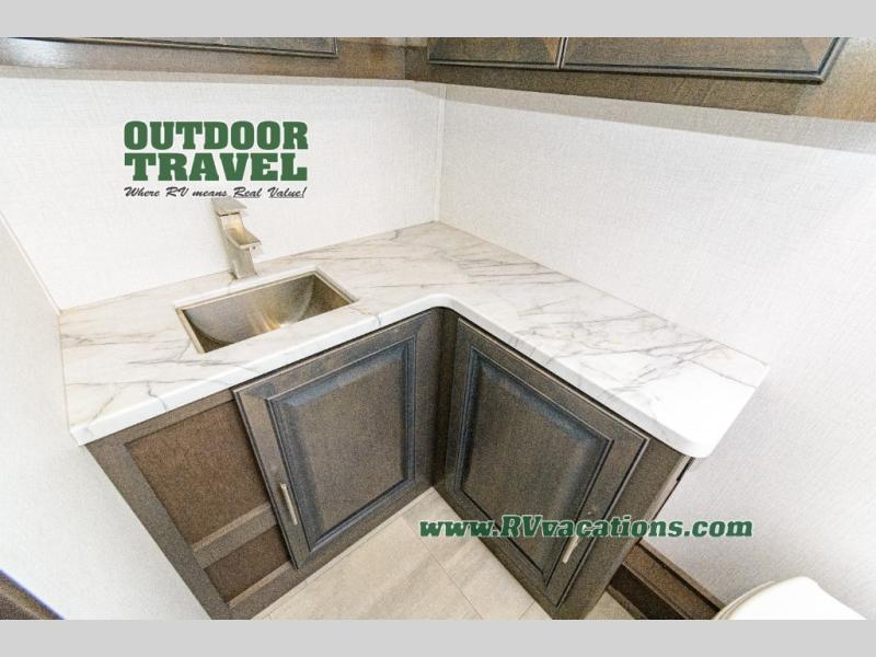 Three slides help to open up this motorhome! The kitchen slide features all of your essentials for cooking delicious meals and you even have a hutch with overhead cabinets to store all of your dishes. The Dream Dinette and Thomas Payne theater seating slide not only open up the living area but also provide comfortable places to eat meals and unwind in front of the 5,000 BTU fireplace and 40" LED TV after a long day of traveling. The half bathroom is close to the kitchen and living area, so you don't have to go far for a quick bathroom break. The master suite will have you feeling right at home with a 72" x 80" king bed slide to lay your head on at night with a dresser across from it that also has a 32" LED TV and wardrobes on either side of it with one of them with an optional washer and dryer. Plus, you even have access to the full rear bathroom which has a shower with a seat to freshen up in each morning!