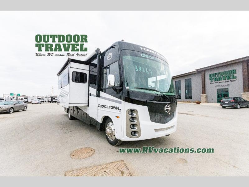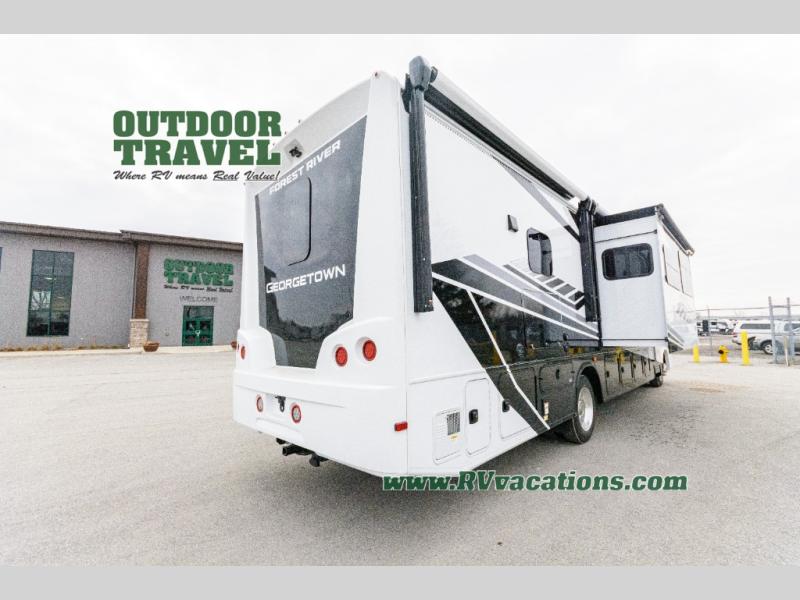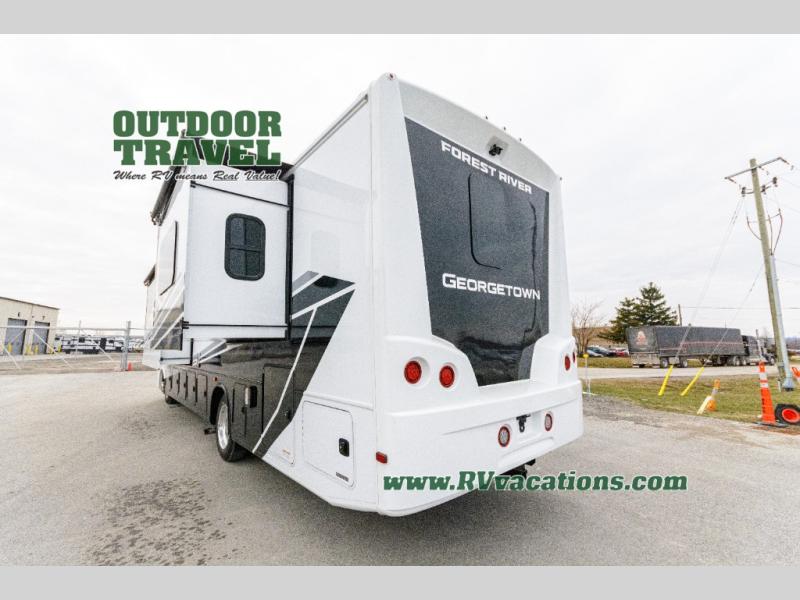 A spacious design and true luxury come together to create these Forest River Georgetown 5 Series Class A gas motorhomes! Their solid surface kitchen countertops, day and night shades throughout, and designer bedspread will have you feeling right at home. The color side and rear cameras help to prevent any dings or bumps while you travel, and the automatic hydraulic leveling jacks will keep your unit leveled wherever you set up. Durable construction consists of a crowned roof, 2" aluminum framed vacuum bonded gel coated sidewalls, plus high density block foam insulation that will allow you to travel at any time of the year. You will appreciate the 50 Amp service, two house batteries, and 6,000-watt Yamaha generator to keep you powered up. An outside shower is also included on all models, along with rotocast storage compartments with drains, a power awning, and so much more!