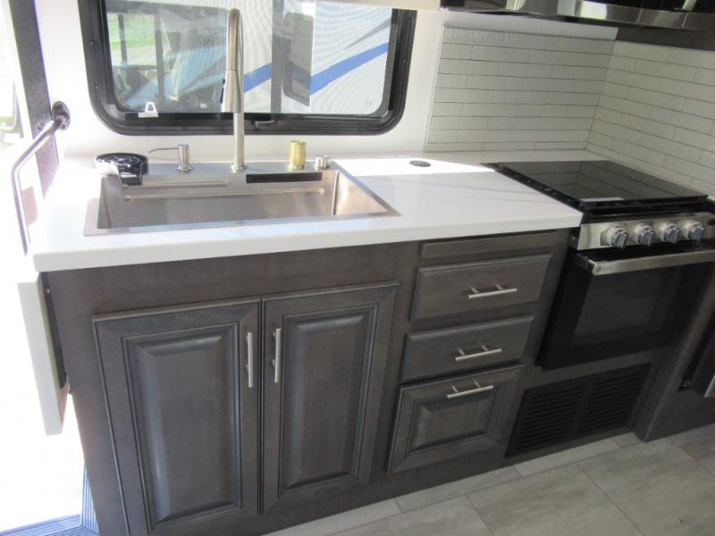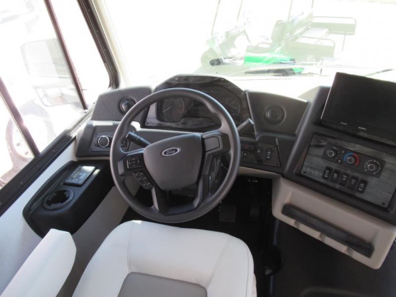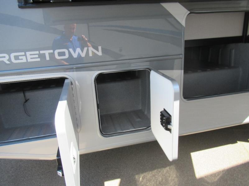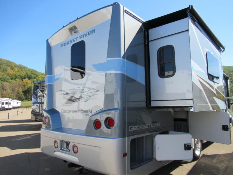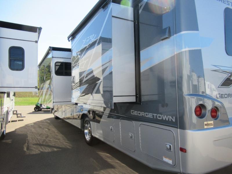 A spacious design and true luxury come together to create these Forest River Georgetown 5 Series Class A gas motorhomes! Their solid surface kitchen countertops, day and night shades throughout, and designer bedspread will have you feeling right at home. The color side and rear cameras help to prevent any dings or bumps while you travel, and the automatic hydraulic leveling jacks will keep your unit leveled wherever you set up. Durable construction consists of a crowned roof, 2" aluminum framed vacuum bonded gel coated sidewalls, plus high density block foam insulation that will allow you to travel at any time of the year. You will appreciate the 50 Amp service, two house batteries, and 6,000 watt Yamaha generator to keep you powered up. An outside shower is also included on all models, along with rotocast storage compartments with drains, a power awning, and so much more!