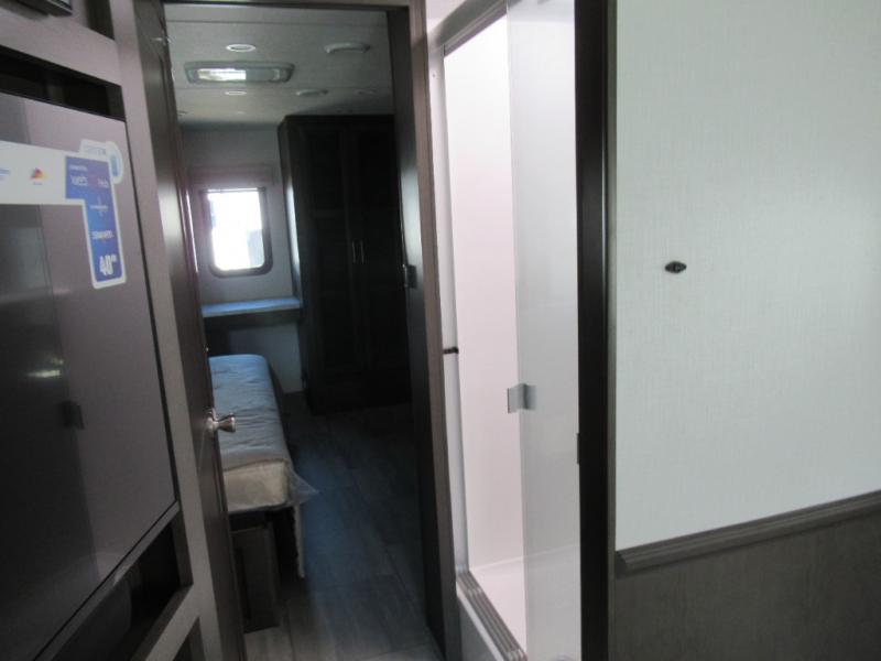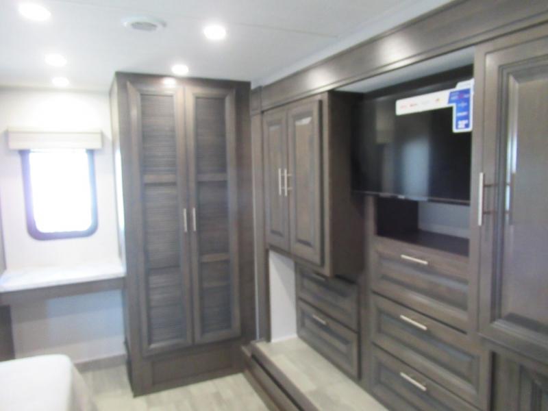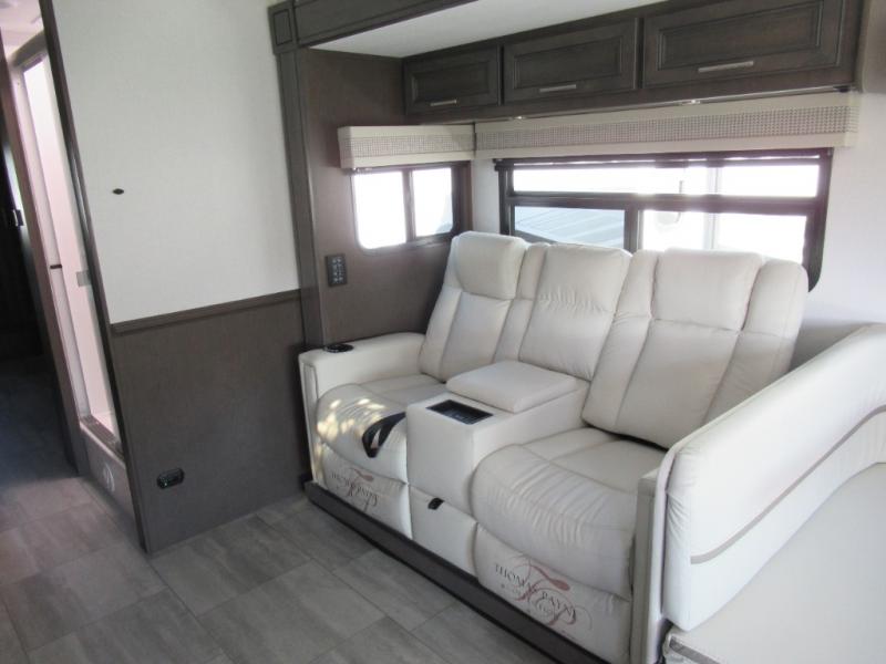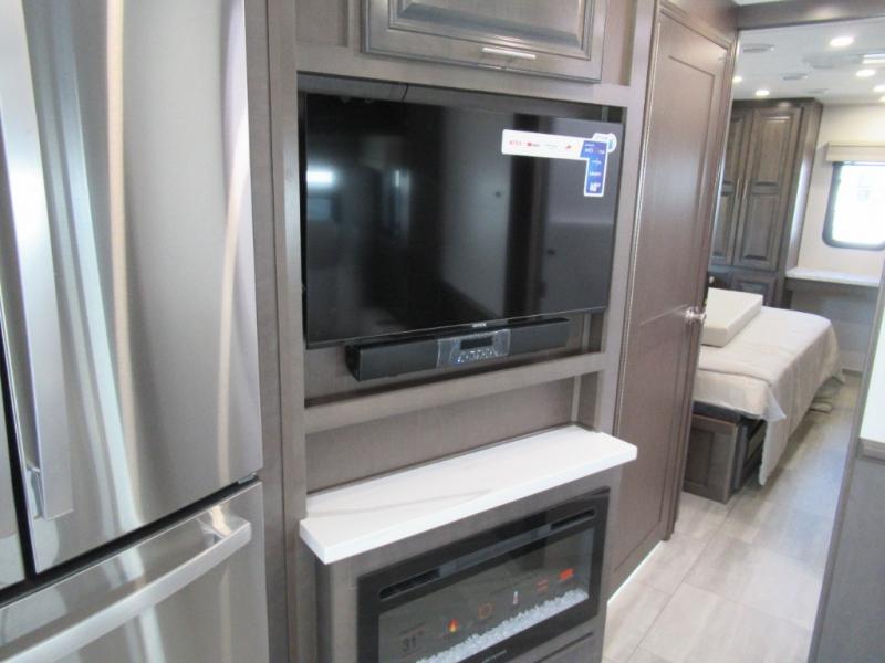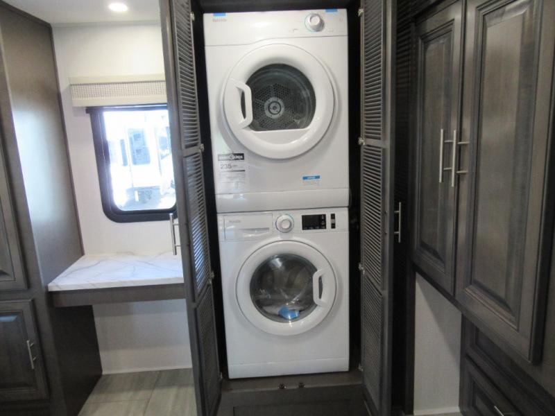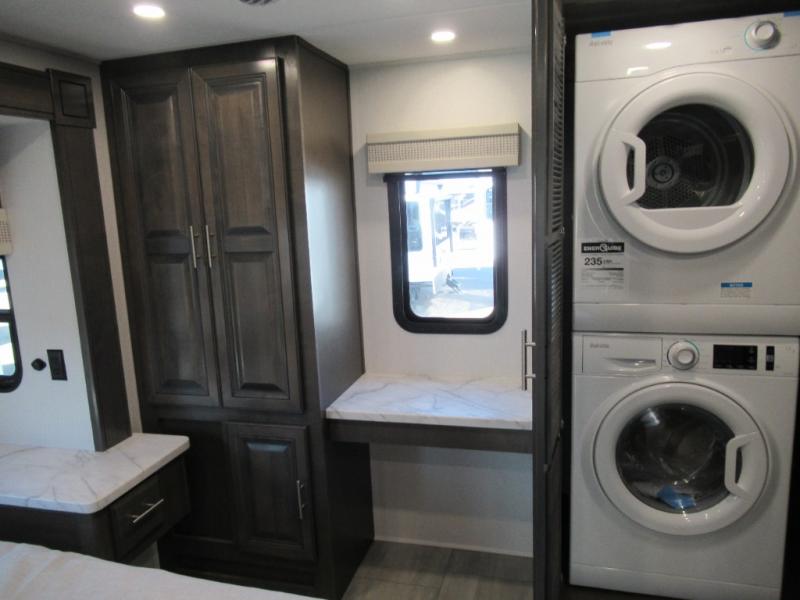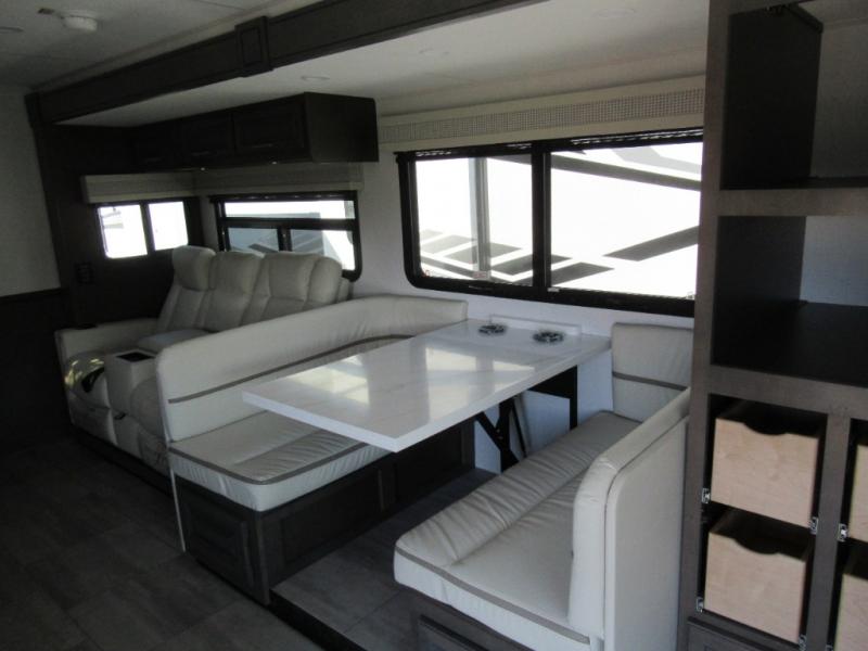You won't believe all that the rear private bedroom has to offer in this motorhome! It features a 72" x 80" king bed slide with overhead cabinets, a dresser with a 32" TV and overhead cabinets, wardrobes on either side of the dresser, and a desk with wardrobes on either. And one of the wardrobes features an optional stacked washer and dryer for convenience! The split-style bathroom makes it easy for one person to freshen up in the shower with a seat while another uses the private toilet and sink. After a long day of traveling, you can relax on either the Thomas Payne theater seating with heat and massage across from the 5,000 BTU fireplace with a 40" LED TV above it or play a game and eat a meal at the Dream Dinette. There is also a power front overhead bunk for more sleeping space!