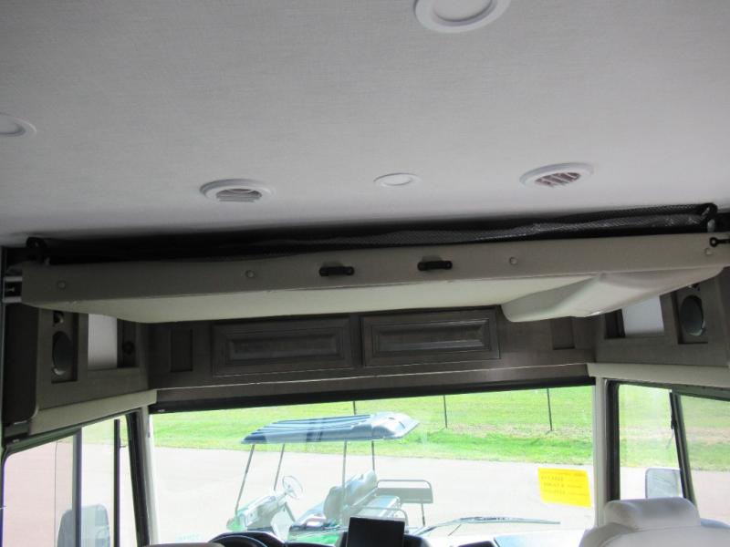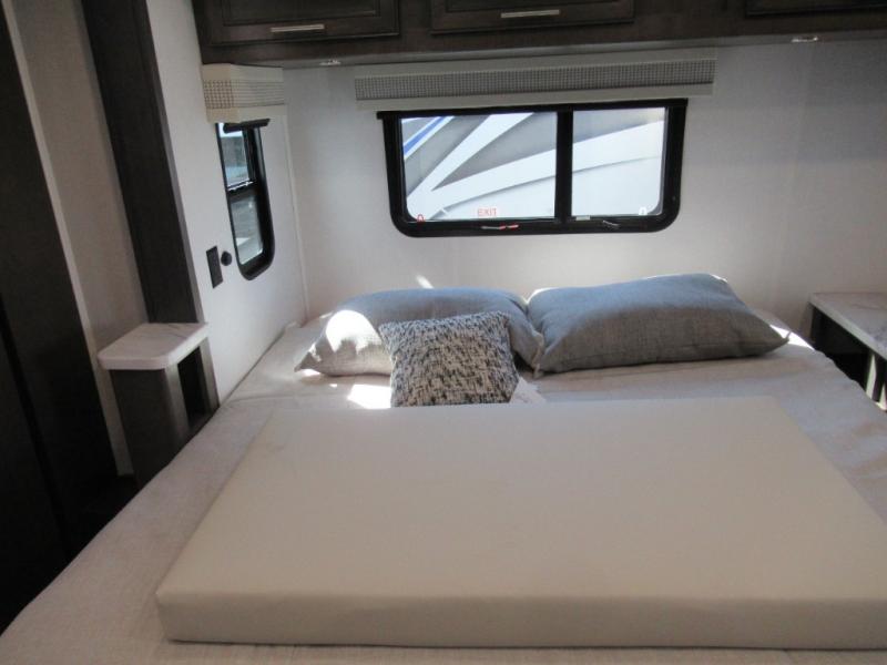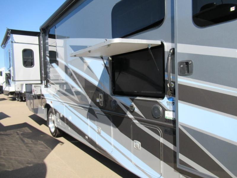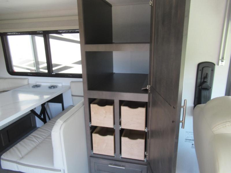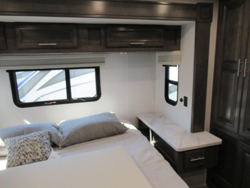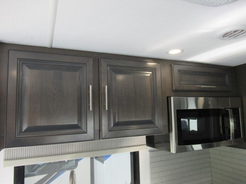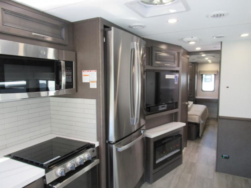 You won't believe all that the rear private bedroom has to offer in this motorhome! It features a 72" x 80" king bed slide with overhead cabinets, a dresser with a 32" TV and overhead cabinets, wardrobes on either side of the dresser, and a desk with wardrobes on either. And one of the wardrobes features an optional stacked washer and dryer for convenience! The split-style bathroom makes it easy for one person to freshen up in the shower with a seat while another uses the private toilet and sink. After a long day of traveling, you can relax on either the Thomas Payne theater seating with heat and massage across from the 5,000 BTU fireplace with a 40" LED TV above it or play a game and eat a meal at the Dream Dinette. There is also a power front overhead bunk for more sleeping space!