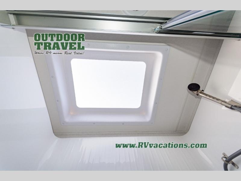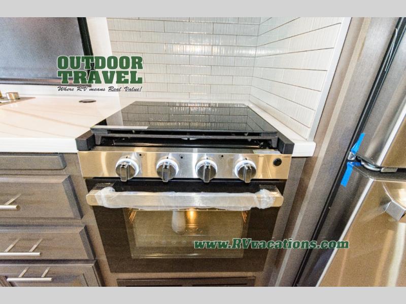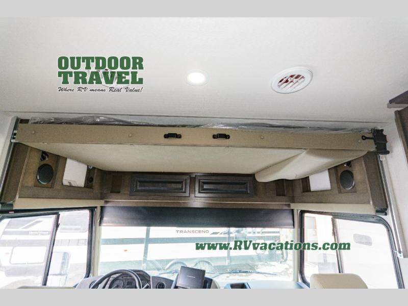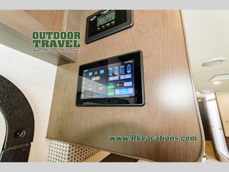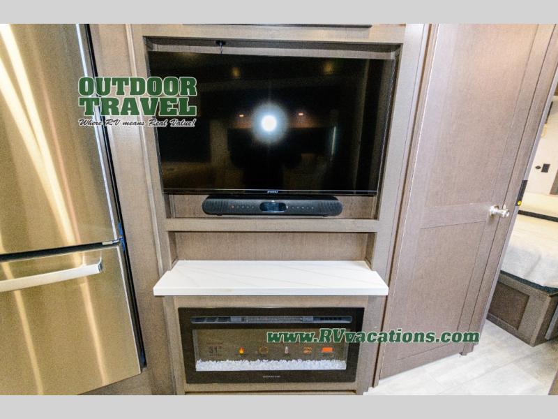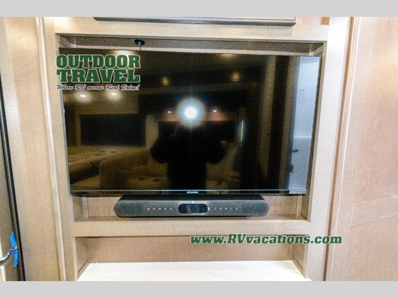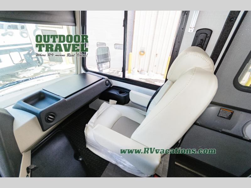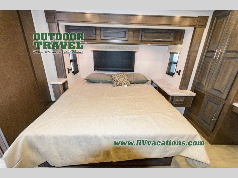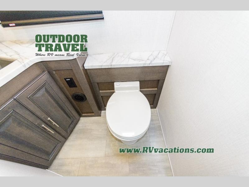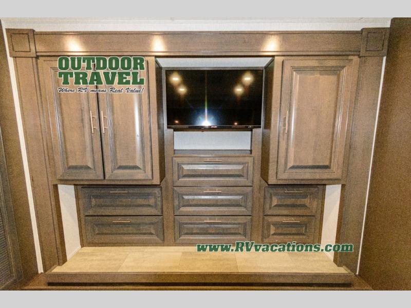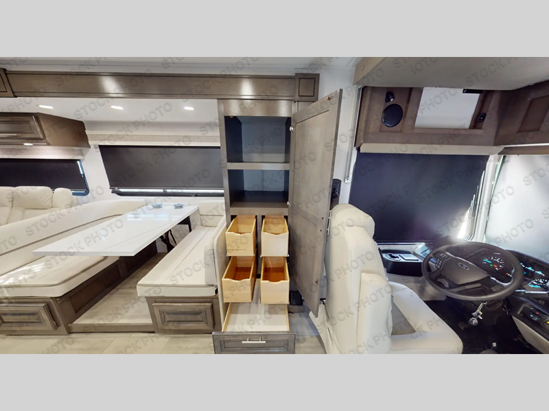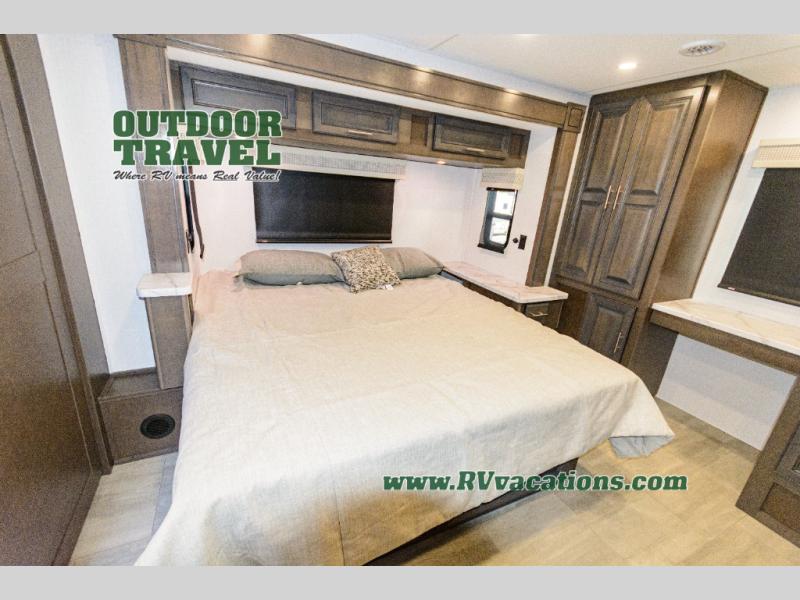 You won't believe all that the rear private bedroom has to offer in this motorhome! It features a 72" x 80" king bed slide with overhead cabinets, a dresser with a 32" TV and overhead cabinets, wardrobes on either side of the dresser, and a desk with wardrobes on either. And one of the wardrobes features an optional stacked washer and dryer for convenience! The split-style bathroom makes it easy for one person to freshen up in the shower with a seat while another uses the private toilet and sink. After a long day of traveling, you can relax on either the Thomas Payne theater seating with heat and massage across from the 5,000 BTU fireplace with a 40" LED TV above it or play a game and eat a meal at the Dream Dinette. There is also a power front overhead bunk for more sleeping space!
