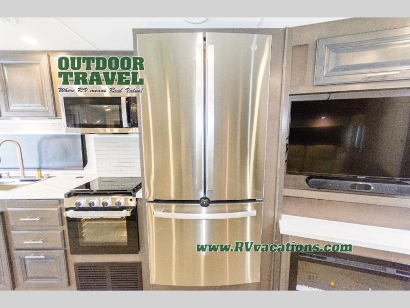A spacious design and true luxury come together to create these Forest River Georgetown 5 Series Class A gas motorhomes! Their solid surface kitchen countertops, day and night shades throughout, and designer bedspread will have you feeling right at home. The color side and rear cameras help to prevent any dings or bumps while you travel, and the automatic hydraulic leveling jacks will keep your unit leveled wherever you set up. Durable construction consists of a crowned roof, 2" aluminum framed vacuum bonded gel coated sidewalls, plus high density block foam insulation that will allow you to travel at any time of the year. You will appreciate the 50 Amp service, two house batteries, and 6,000 watt Yamaha generator to keep you powered up. An outside shower is also included on all models, along with rotocast storage compartments with drains, a power awning, and so much more!