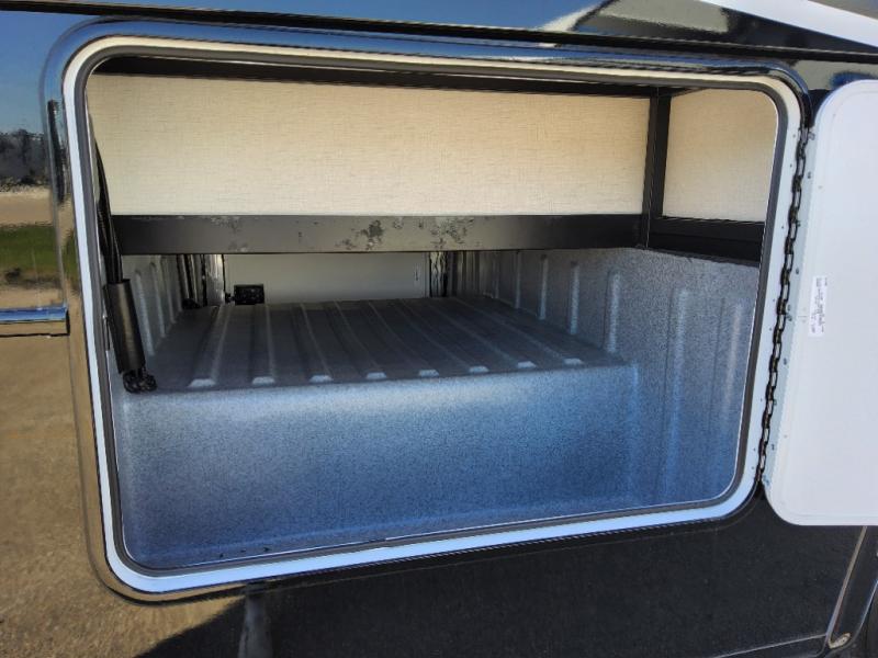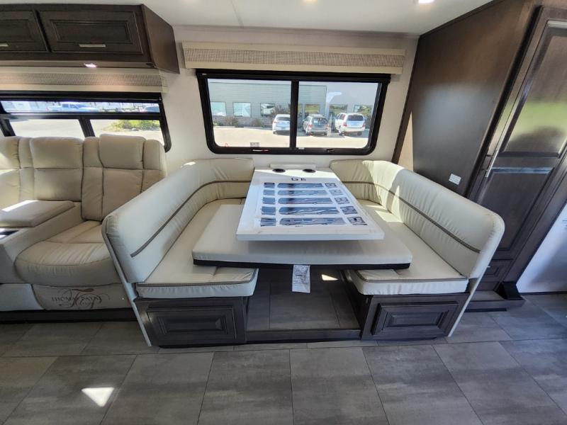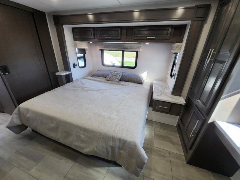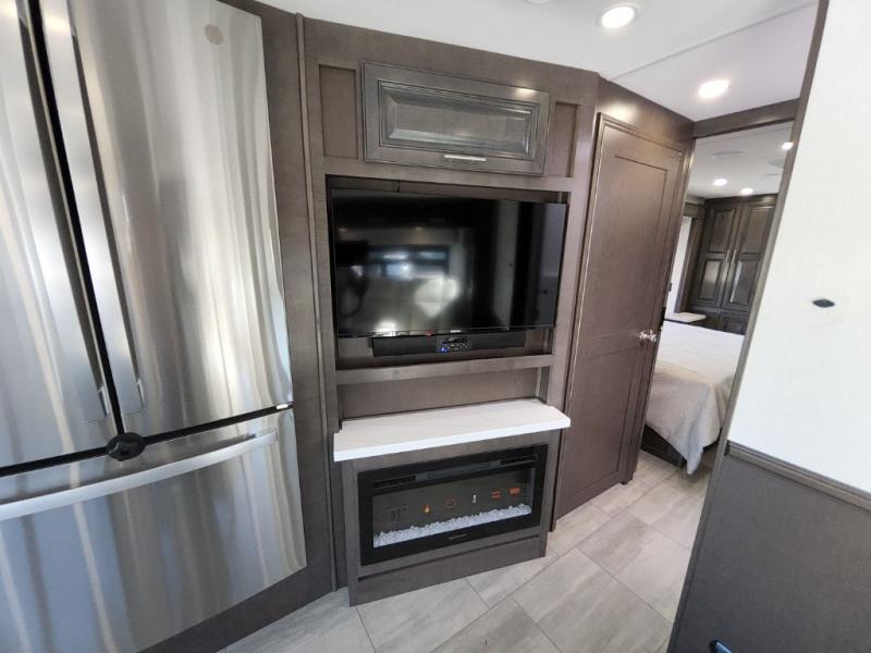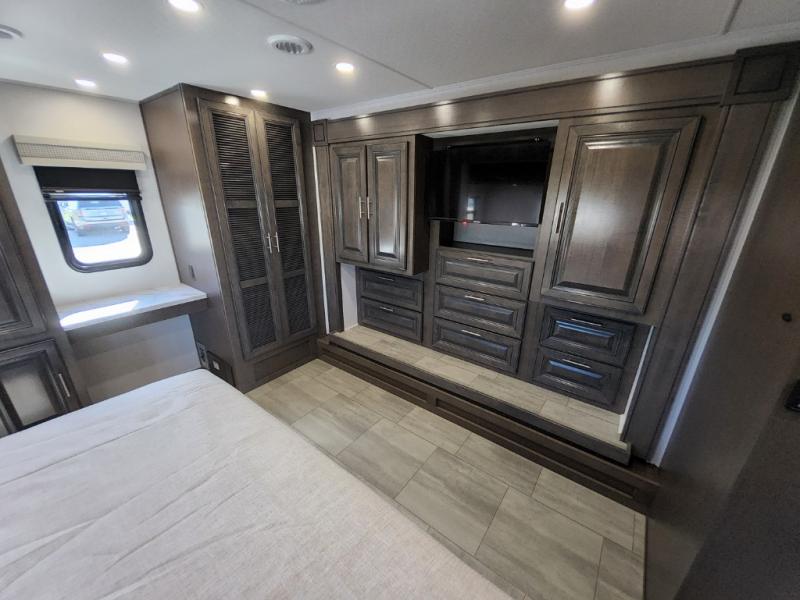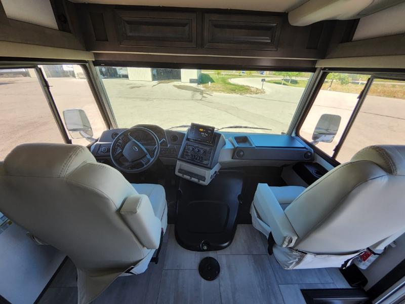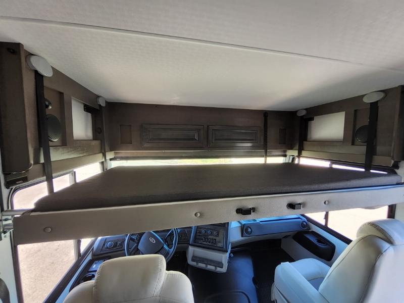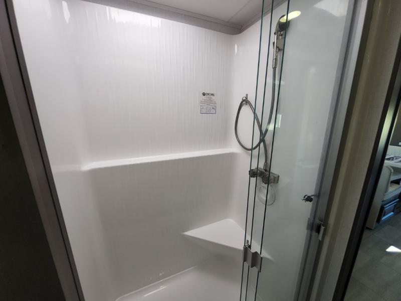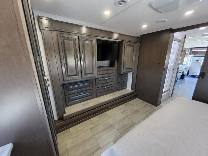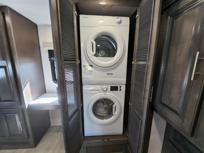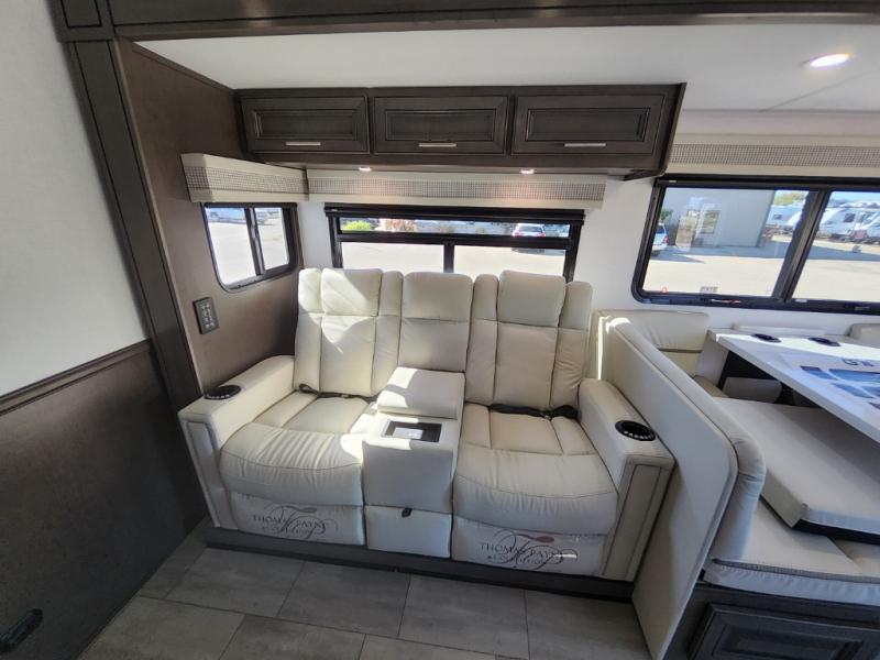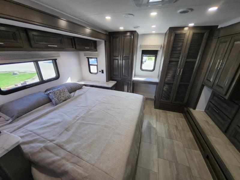 You won't believe all that the rear private bedroom has to offer in this motorhome! It features a 72" x 80" king bed slide with overhead cabinets, a dresser with a 32" TV and overhead cabinets, wardrobes on either side of the dresser, and a desk with wardrobes on either. And one of the wardrobes features an optional stacked washer and dryer for convenience! The split-style bathroom makes it easy for one person to freshen up in the shower with a seat while another uses the private toilet and sink. After a long day of traveling, you can relax on either the Thomas Payne theater seating with heat and massage across from the 5,000 BTU fireplace with a 40" LED TV above it or play a game and eat a meal at the Dream Dinette. There is also a power front overhead bunk for more sleeping space!