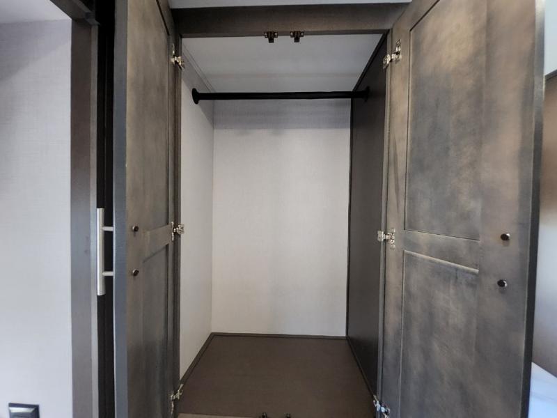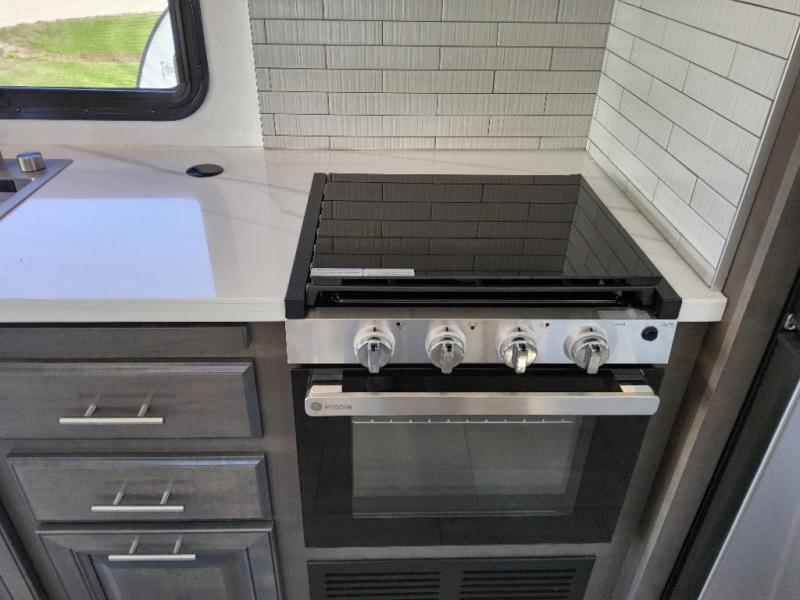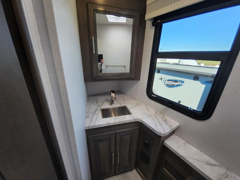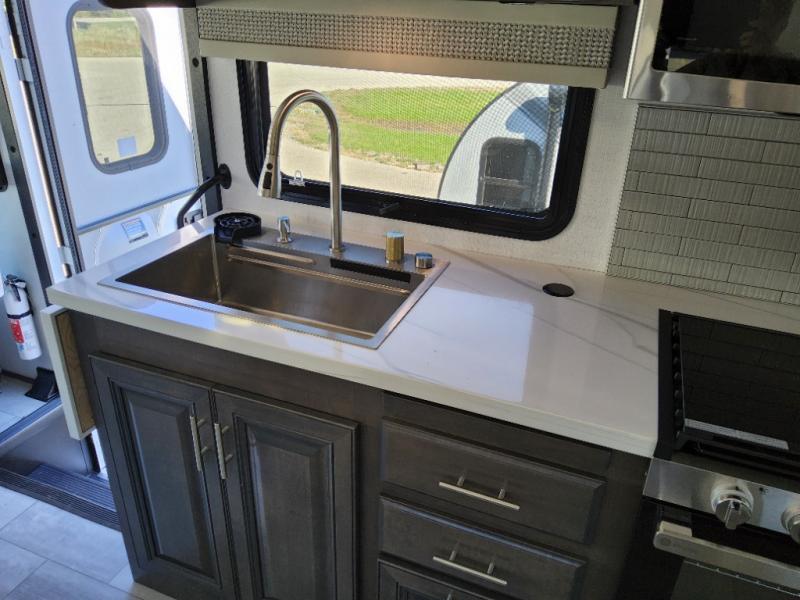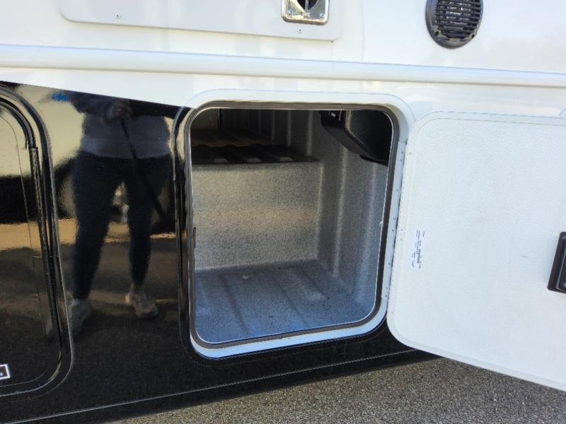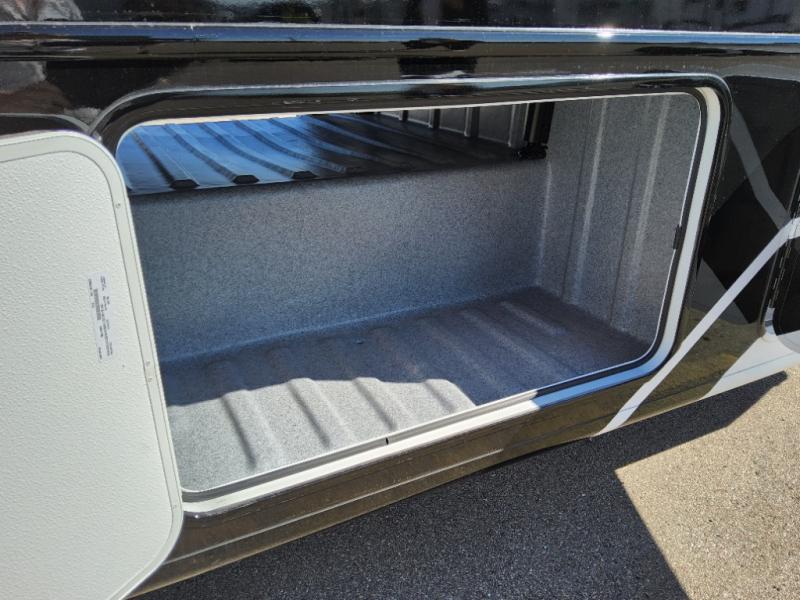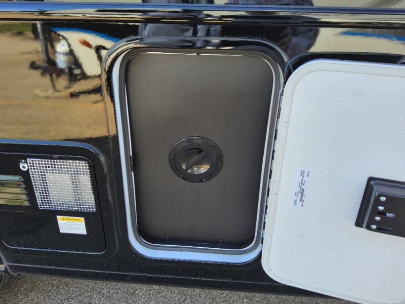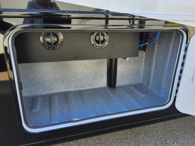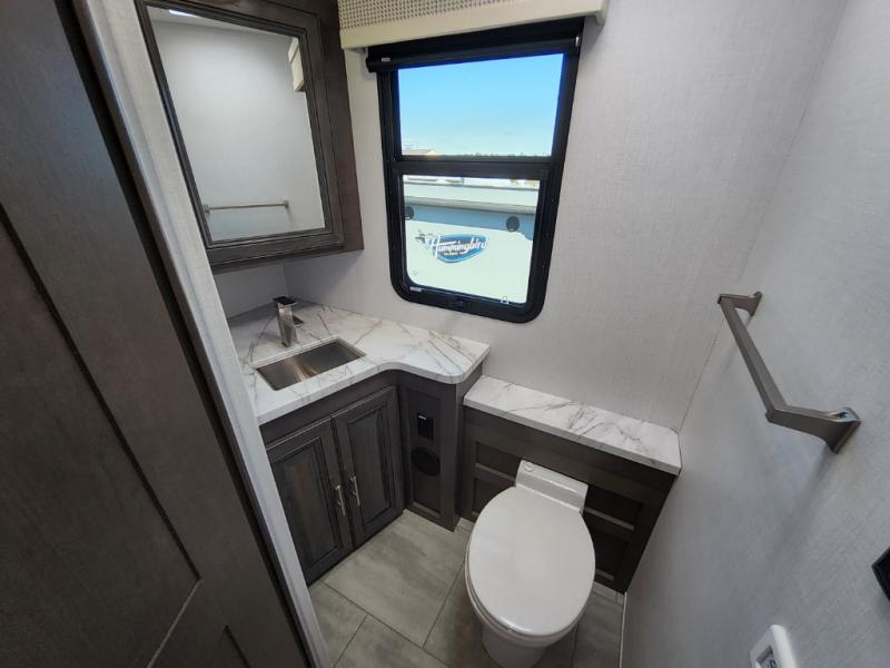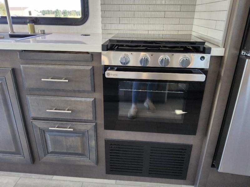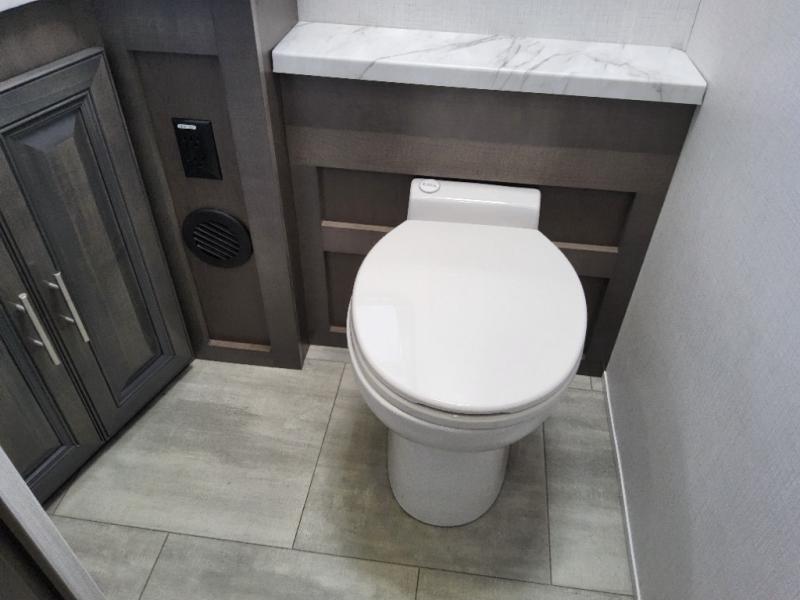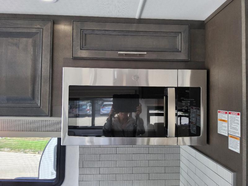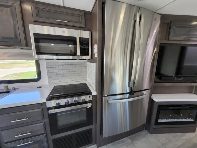 You won't believe all that the rear private bedroom has to offer in this motorhome! It features a 72" x 80" king bed slide with overhead cabinets, a dresser with a 32" TV and overhead cabinets, wardrobes on either side of the dresser, and a desk with wardrobes on either. And one of the wardrobes features an optional stacked washer and dryer for convenience! The split-style bathroom makes it easy for one person to freshen up in the shower with a seat while another uses the private toilet and sink. After a long day of traveling, you can relax on either the Thomas Payne theater seating with heat and massage across from the 5,000 BTU fireplace with a 40" LED TV above it or play a game and eat a meal at the Dream Dinette. There is also a power front overhead bunk for more sleeping space!