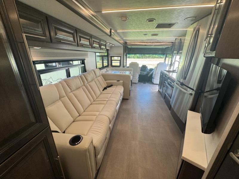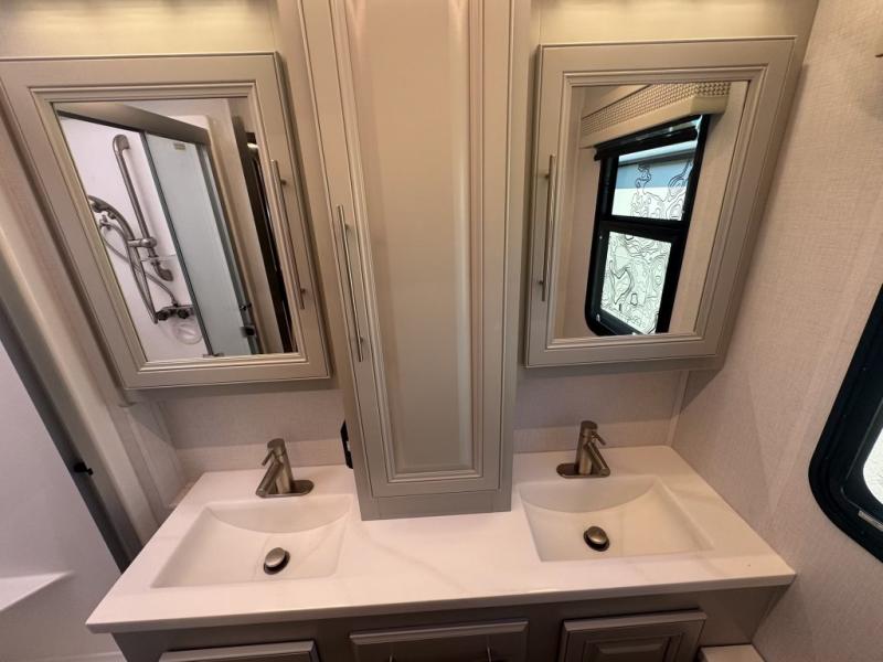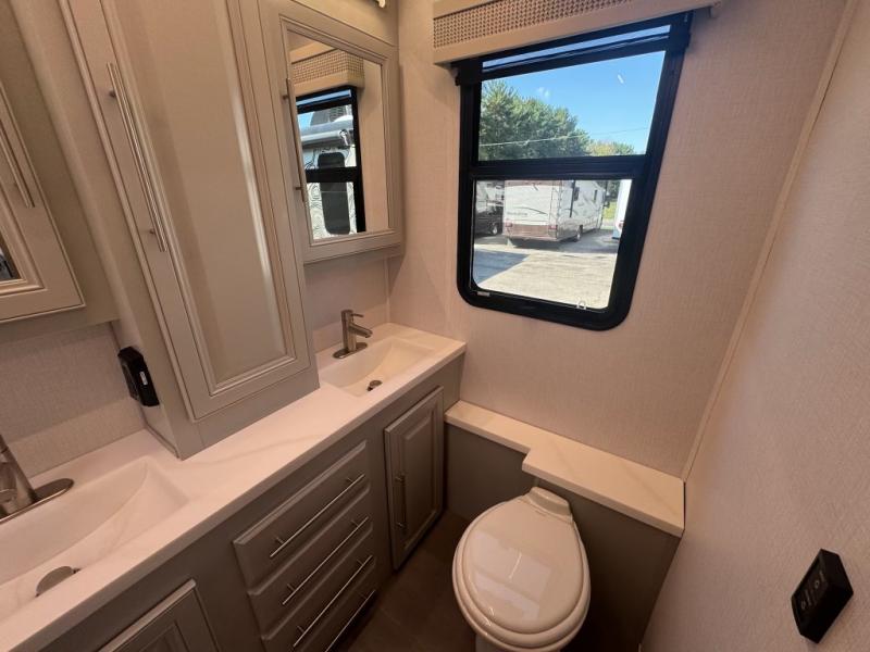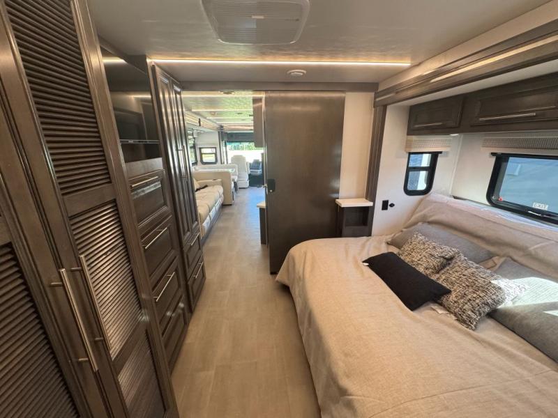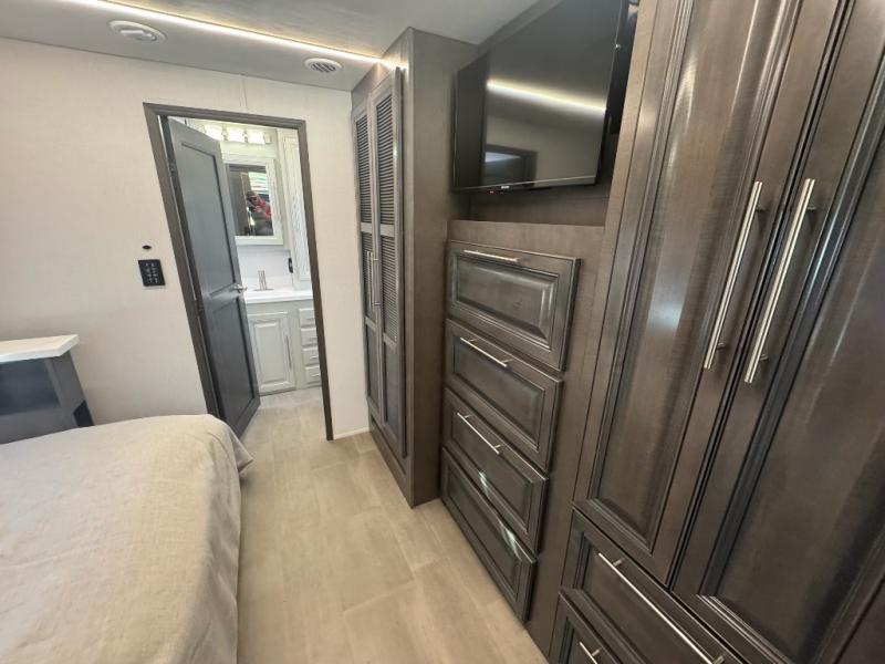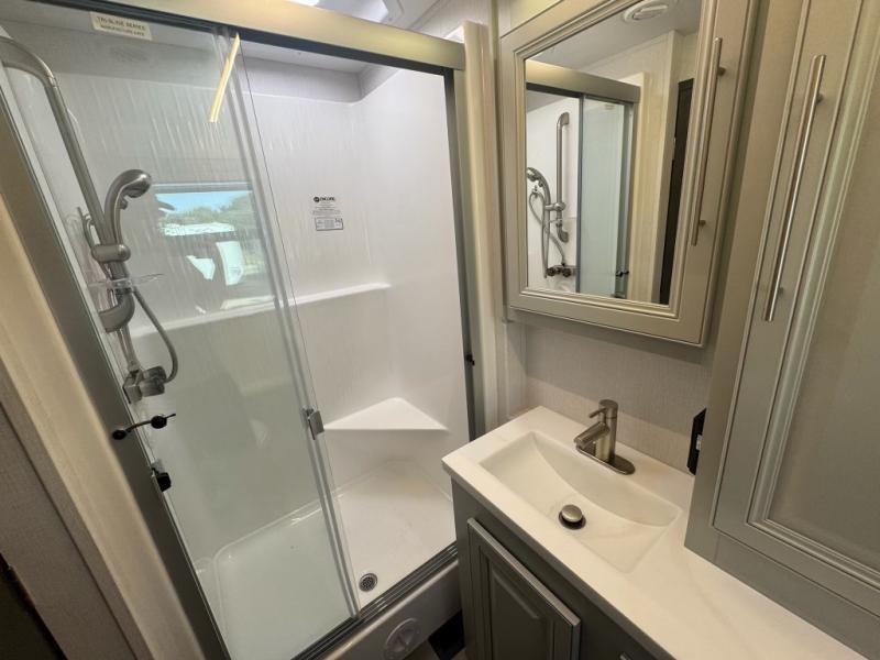 Comfort and convenience are found all throughout this motorhome! Starting with the full rear master bath that has a shower with a seat and a dual sink vanity, plus it leads into the private bedroom. Inside the bedroom is a 72" x 80" king bed slide with overhead cabinets across from a dresser with overhead cabinets and a 32" LED TV, a wardrobe, and another wardrobe that is prepped to add an optional stackable washer and dryer. The half bathroom is conveniently near the fully equipped kitchen so you can get back to creating your best home cooked meals fast. Relax in true comfort each night by either playing games at the booth dinette or on the theater seating that comes with power recline, heat, and massage!