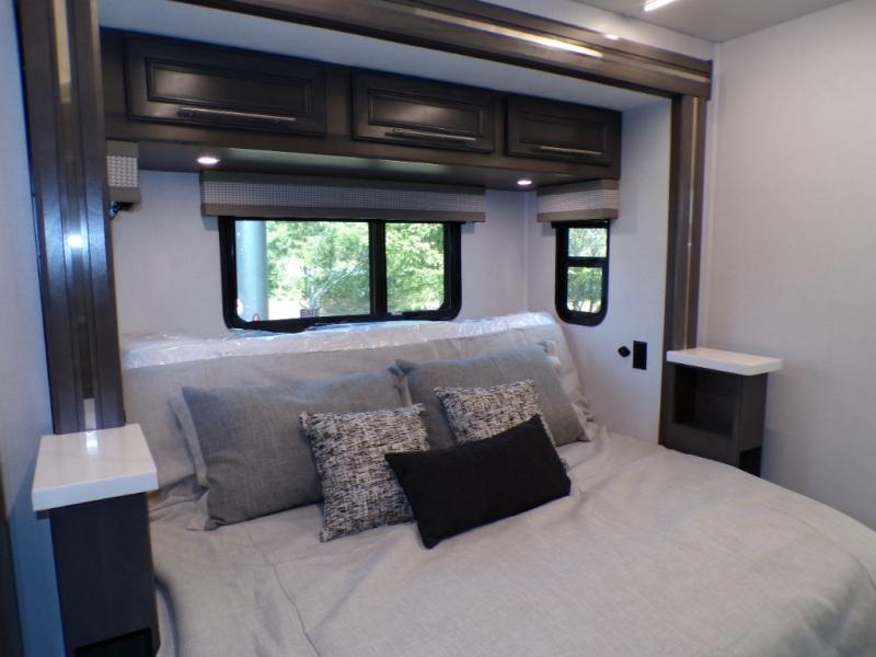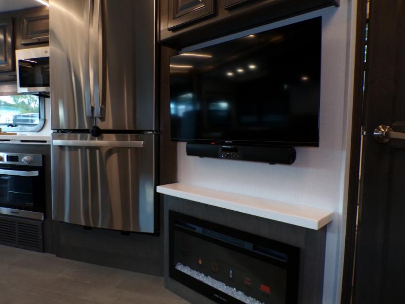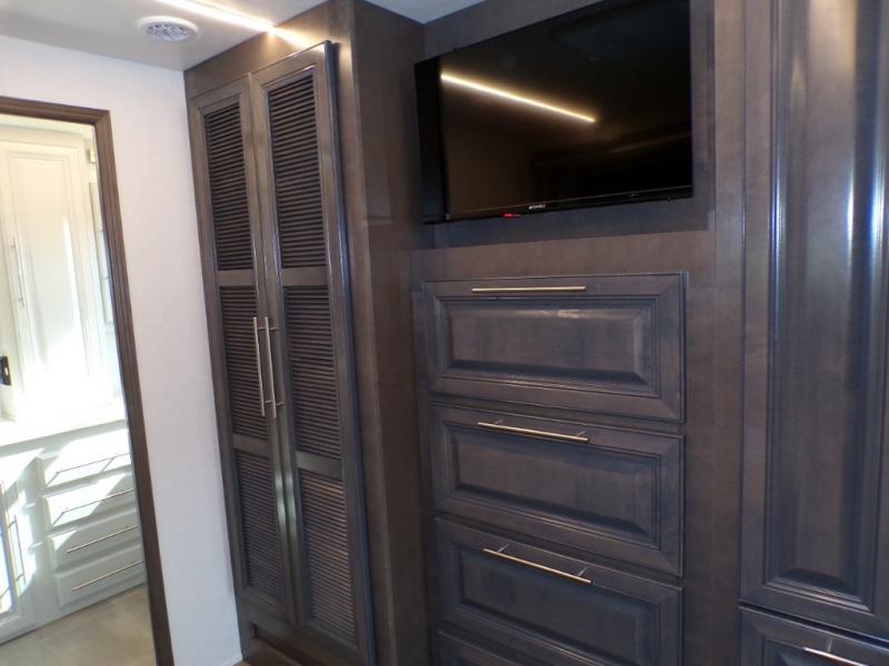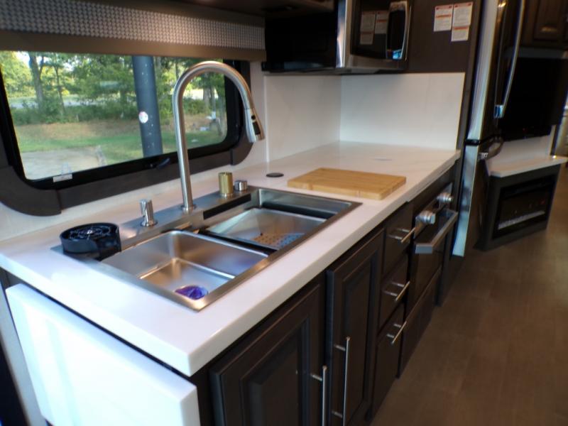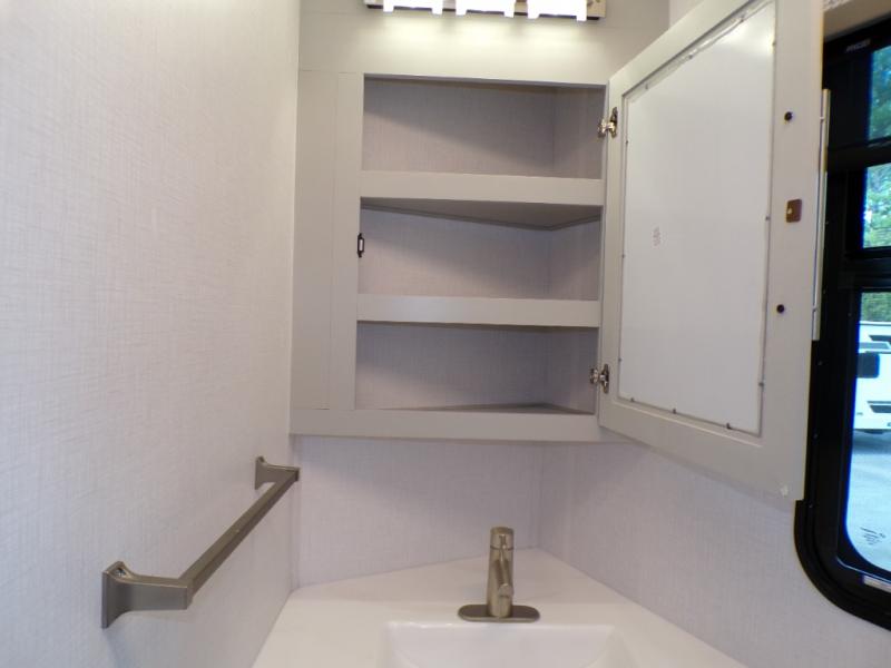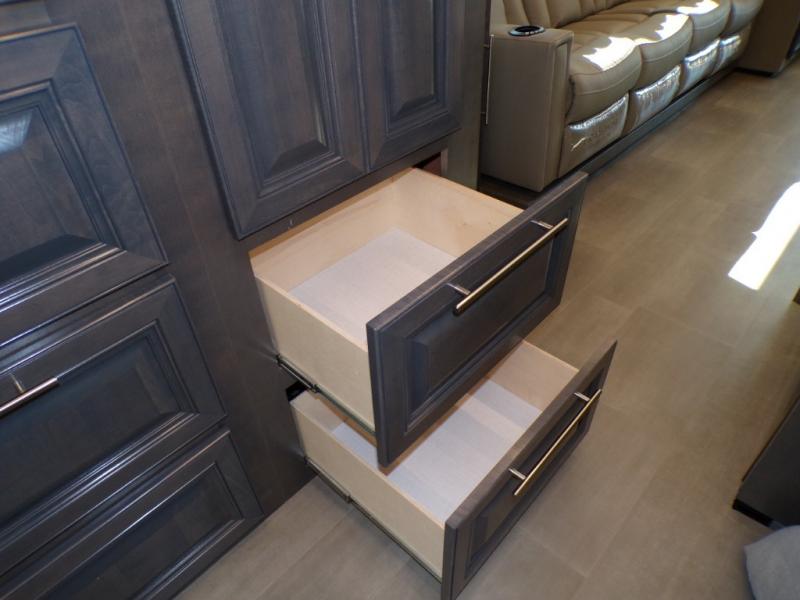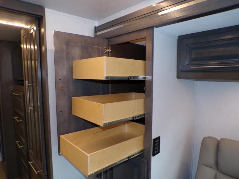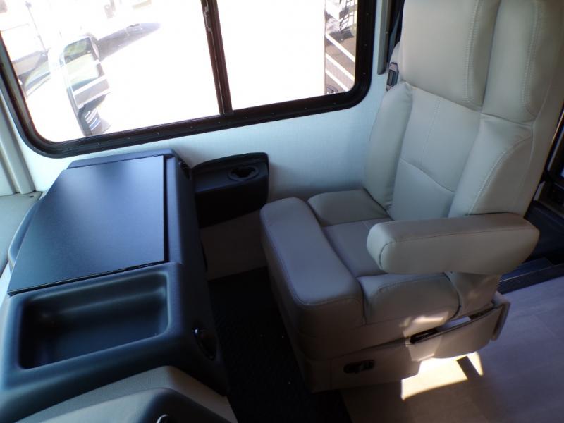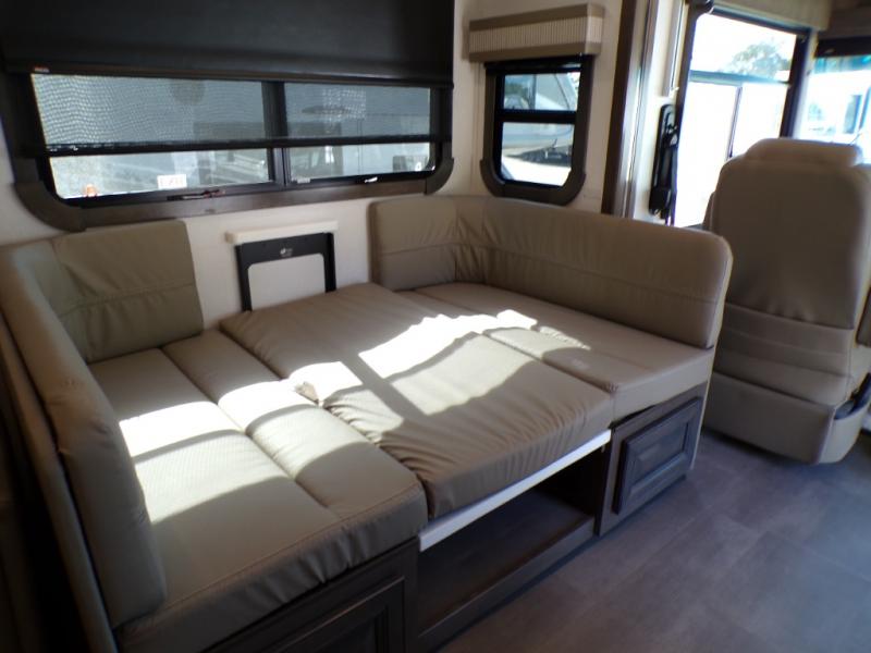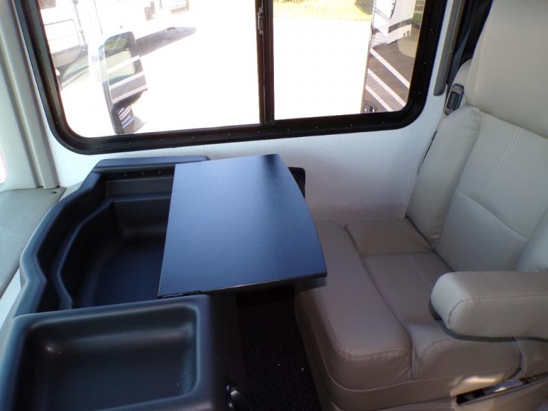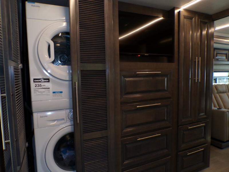 Comfort and convenience are found all throughout this motorhome! Starting with the full rear master bath that has a shower with a seat and a dual sink vanity, plus it leads into the private bedroom. Inside the bedroom is a 72" x 80" king bed slide with overhead cabinets across from a dresser with overhead cabinets and a 32" LED TV, a wardrobe, and another wardrobe that is prepped to add an optional stackable washer and dryer. The half bathroom is conveniently near the fully equipped kitchen so you can get back to creating your best home cooked meals fast. Relax in true comfort each night by either playing games at the booth dinette or on the theater seating that comes with power recline, heat, and massage!