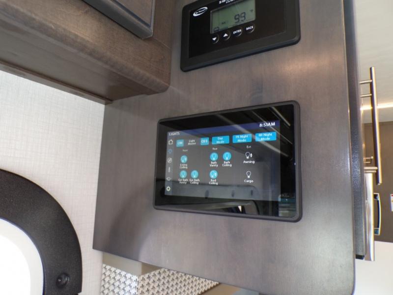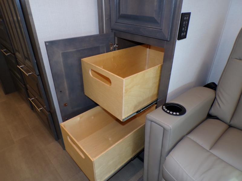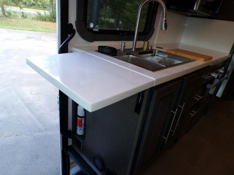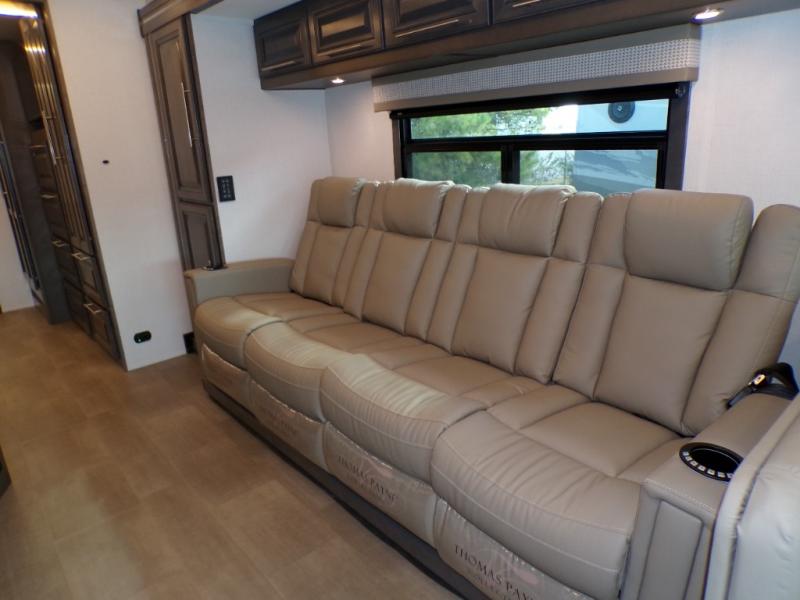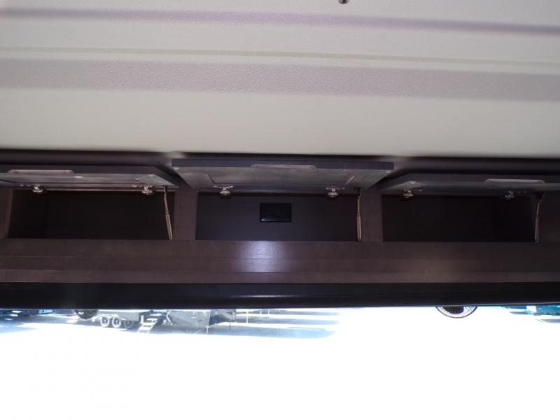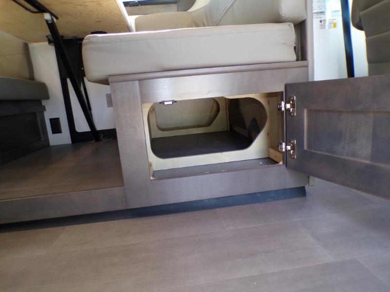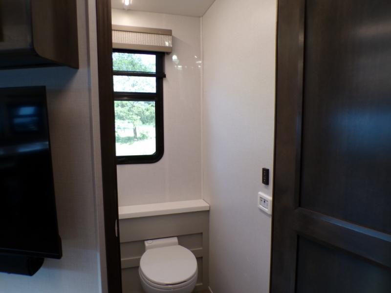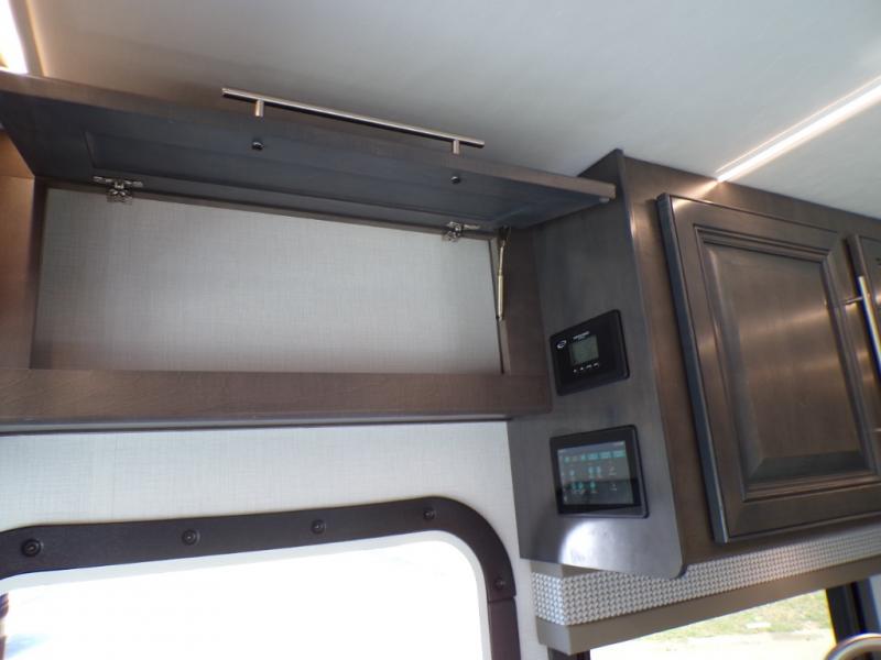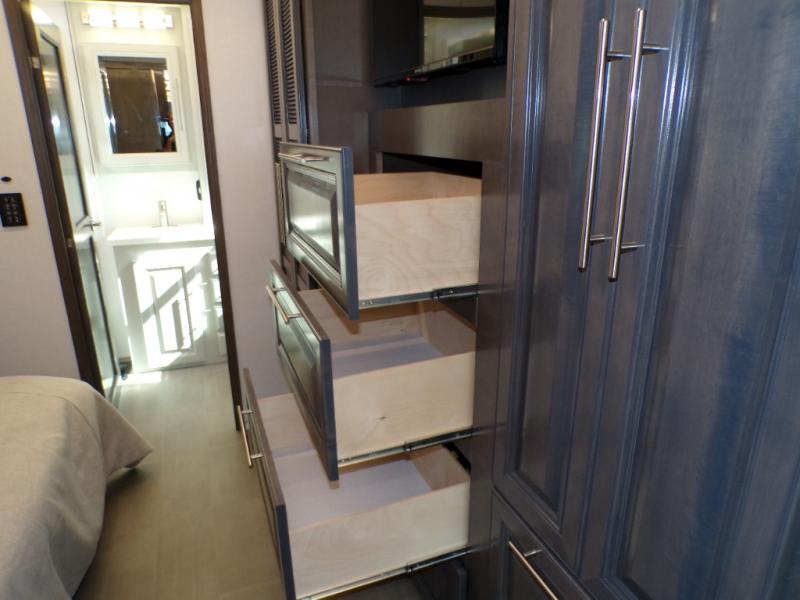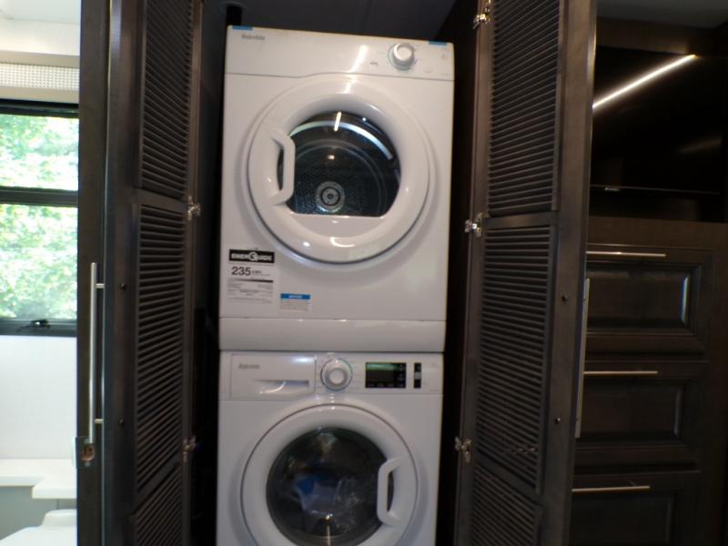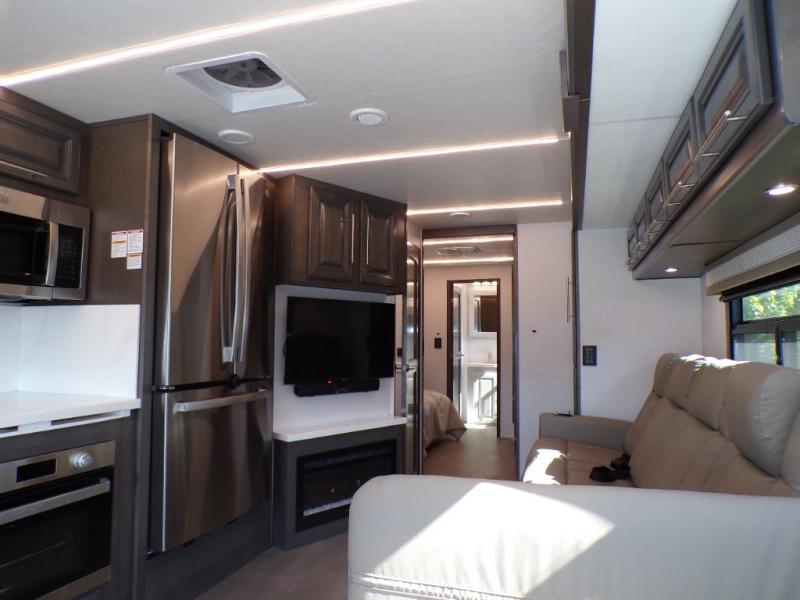 Comfort and convenience are found all throughout this motorhome! Starting with the full rear master bath that has a shower with a seat and a dual sink vanity, plus it leads into the private bedroom. Inside the bedroom is a 72" x 80" king bed slide with overhead cabinets across from a dresser with overhead cabinets and a 32" LED TV, a wardrobe, and another wardrobe that is prepped to add an optional stackable washer and dryer. The half bathroom is conveniently near the fully equipped kitchen so you can get back to creating your best home cooked meals fast. Relax in true comfort each night by either playing games at the booth dinette or on the theater seating that comes with power recline, heat, and massage!