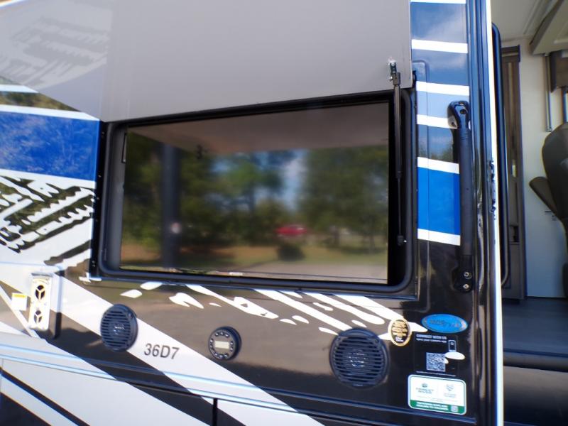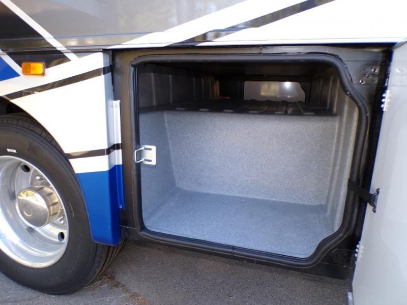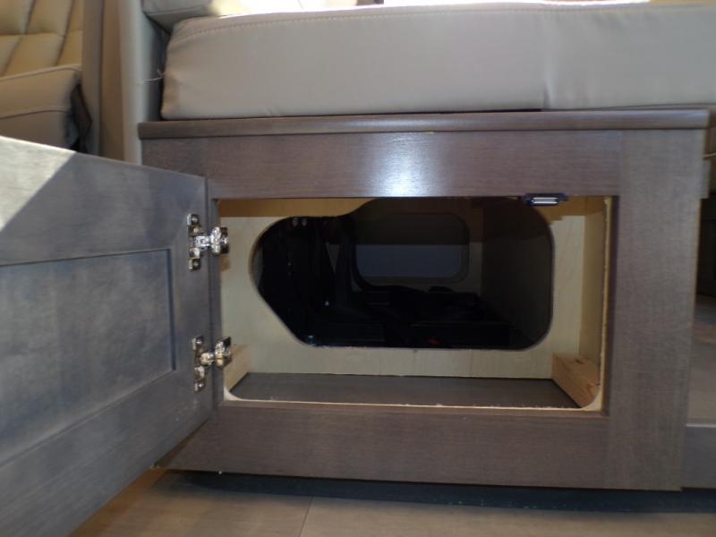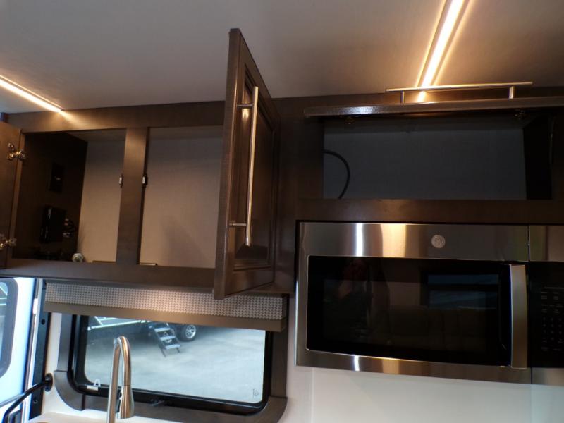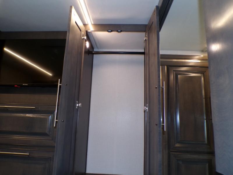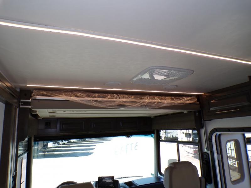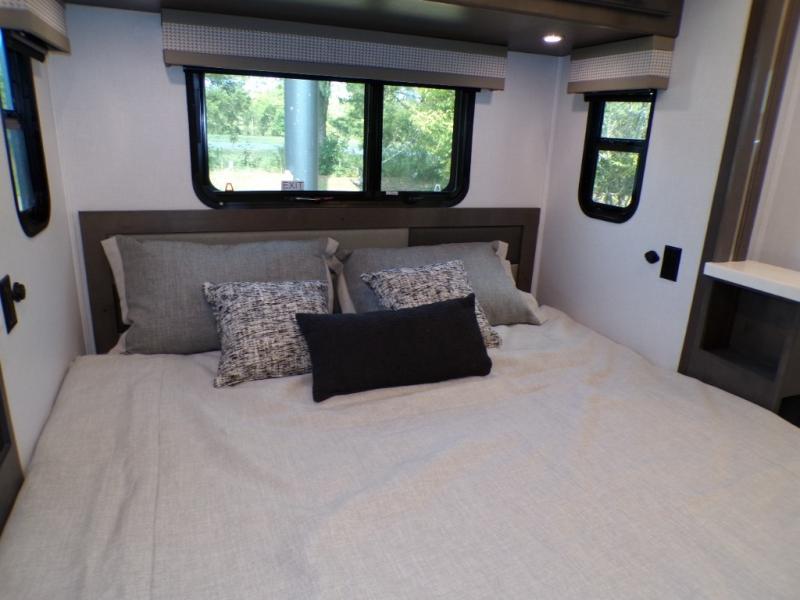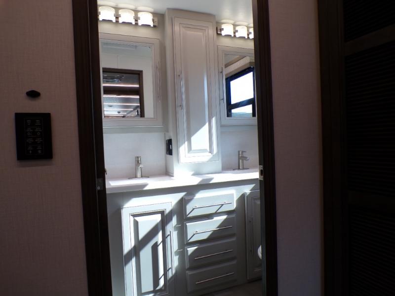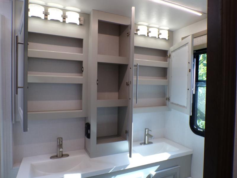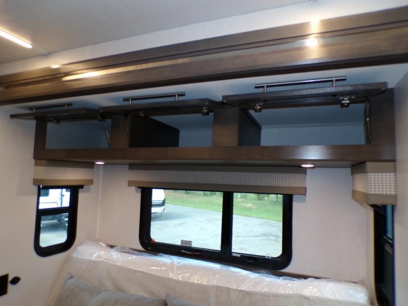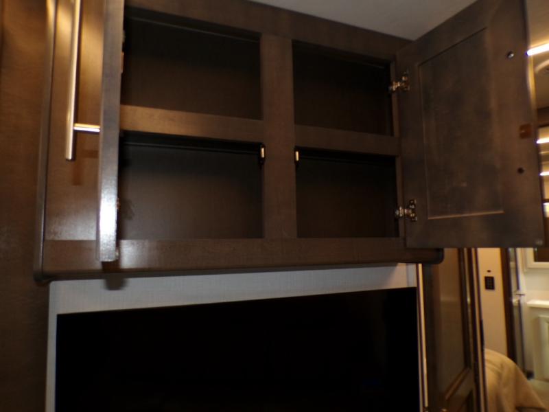 Comfort and convenience are found all throughout this motorhome! Starting with the full rear master bath that has a shower with a seat and a dual sink vanity, plus it leads into the private bedroom. Inside the bedroom is a 72" x 80" king bed slide with overhead cabinets across from a dresser with overhead cabinets and a 32" LED TV, a wardrobe, and another wardrobe that is prepped to add an optional stackable washer and dryer. The half bathroom is conveniently near the fully equipped kitchen so you can get back to creating your best home cooked meals fast. Relax in true comfort each night by either playing games at the booth dinette or on the theater seating that comes with power recline, heat, and massage!