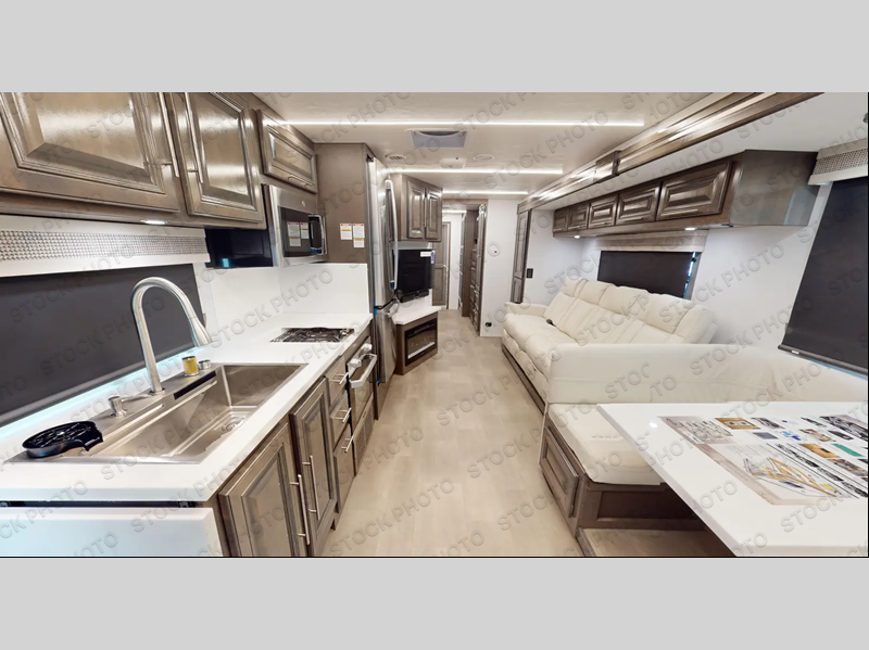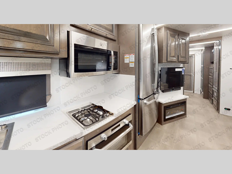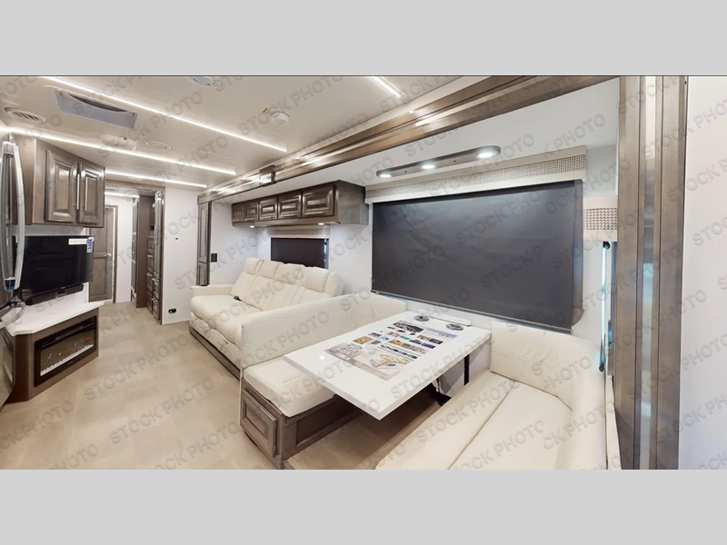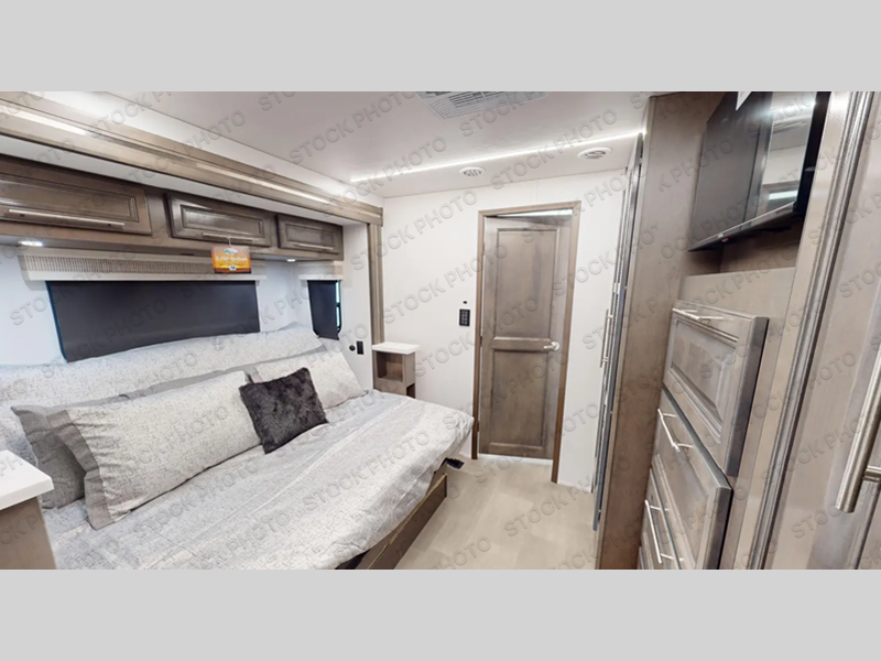 Comfort and convenience are found all throughout this motorhome! Starting with the full rear master bath that has a shower with a seat and a dual sink vanity, plus it leads into the private bedroom. Inside the bedroom is a 72" x 80" king bed slide with overhead cabinets across from a dresser with overhead cabinets and a 32" LED TV, a wardrobe, and another wardrobe that is prepped to add an optional stackable washer and dryer. The half bathroom is conveniently near the fully equipped kitchen so you can get back to creating your best home cooked meals fast. Relax in true comfort each night by either playing games at the booth dinette or on the theater seating that comes with power recline, heat, and massage!