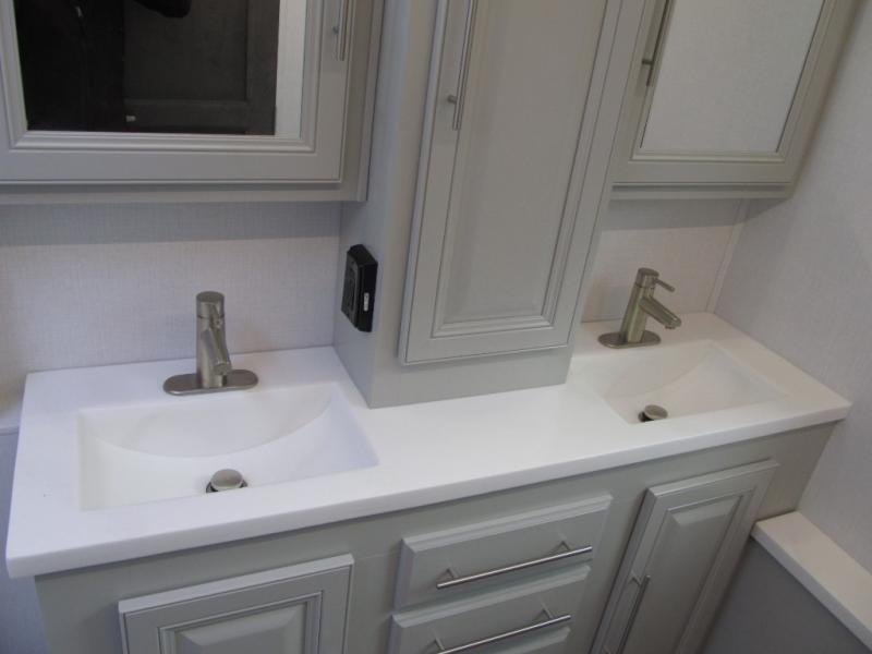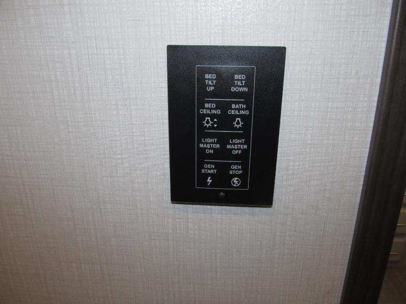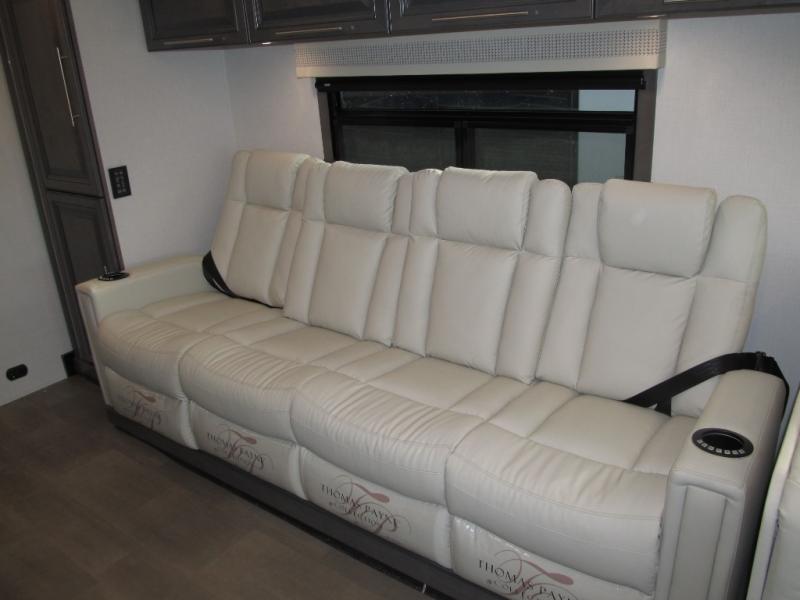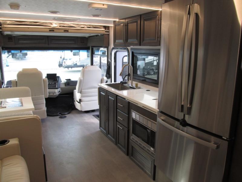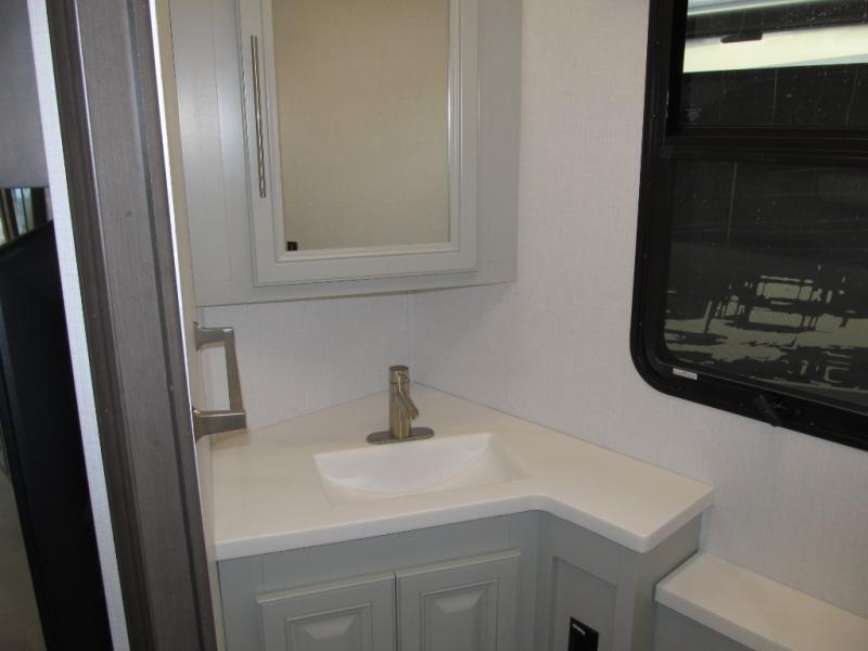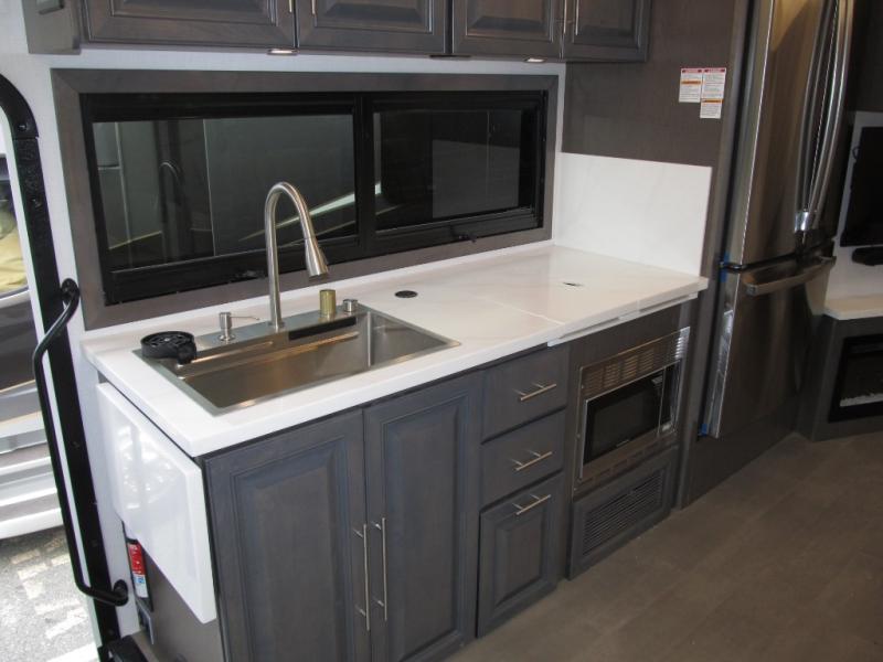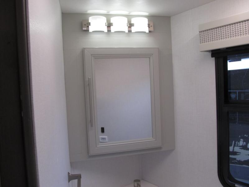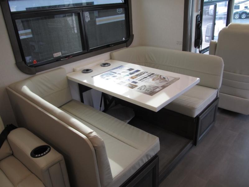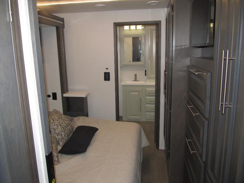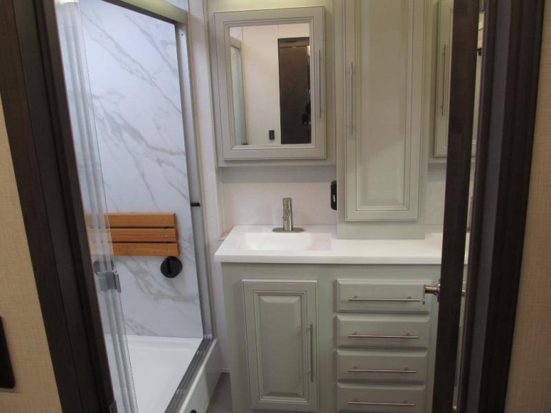 Comfort and convenience are found all throughout this motorhome! Starting with the full rear master bath that has a shower with a seat and a dual sink vanity, plus it leads into the private bedroom. Inside the bedroom is a 72" x 80" king bed slide with overhead cabinets across from a dresser with overhead cabinets and a 32" LED TV, a wardrobe, and another wardrobe that is prepped to add an optional stackable washer and dryer. The half bathroom is conveniently near the fully equipped kitchen so you can get back to creating your best home cooked meals fast. Relax in true comfort each night by either playing games at the booth dinette or on the theater seating that comes with power recline, heat, and massage!