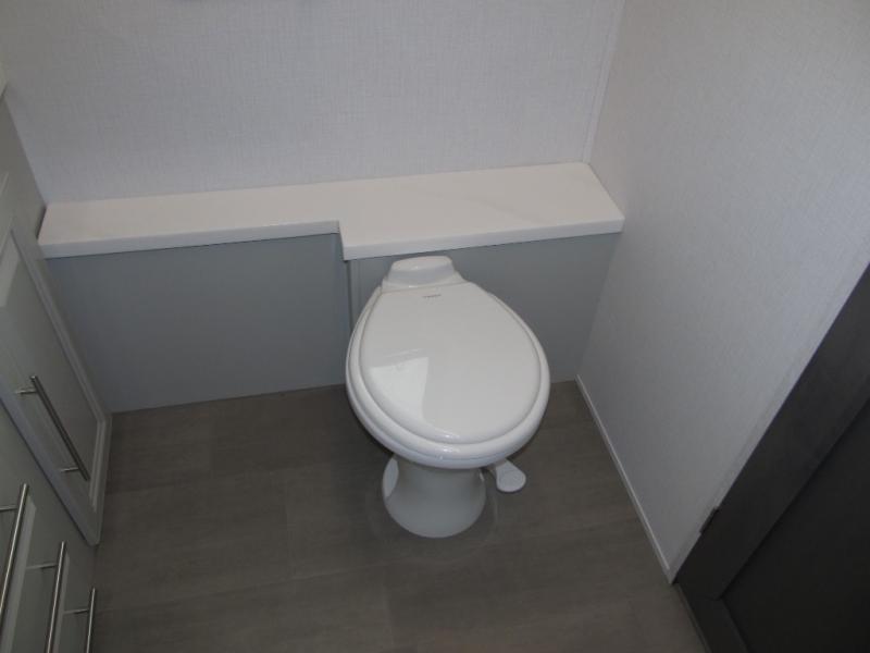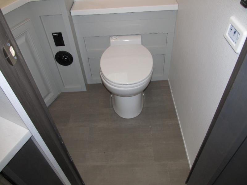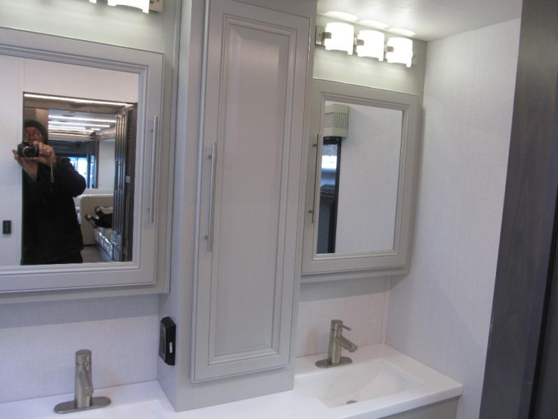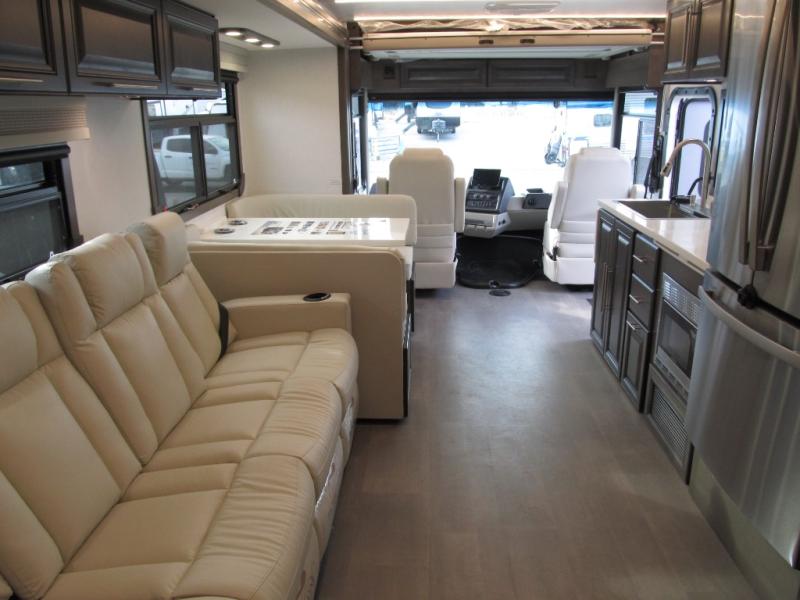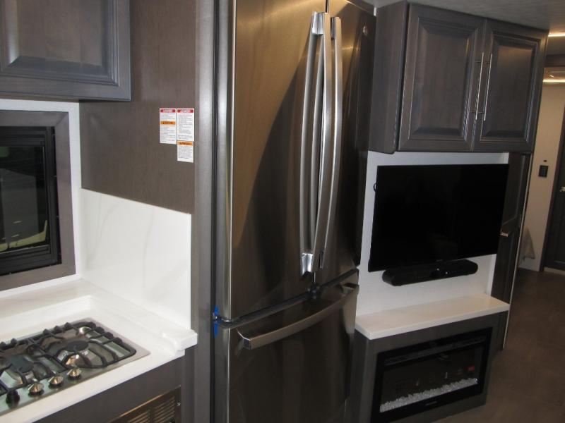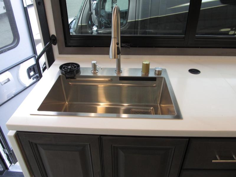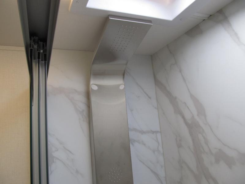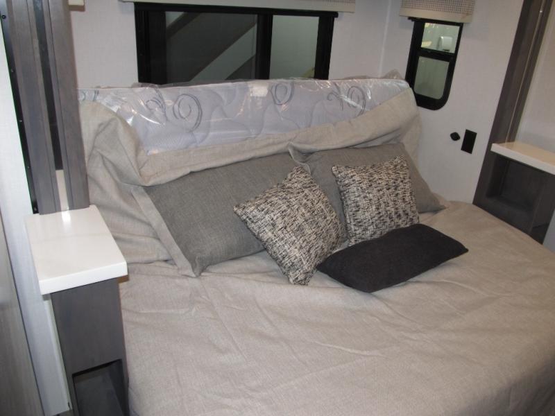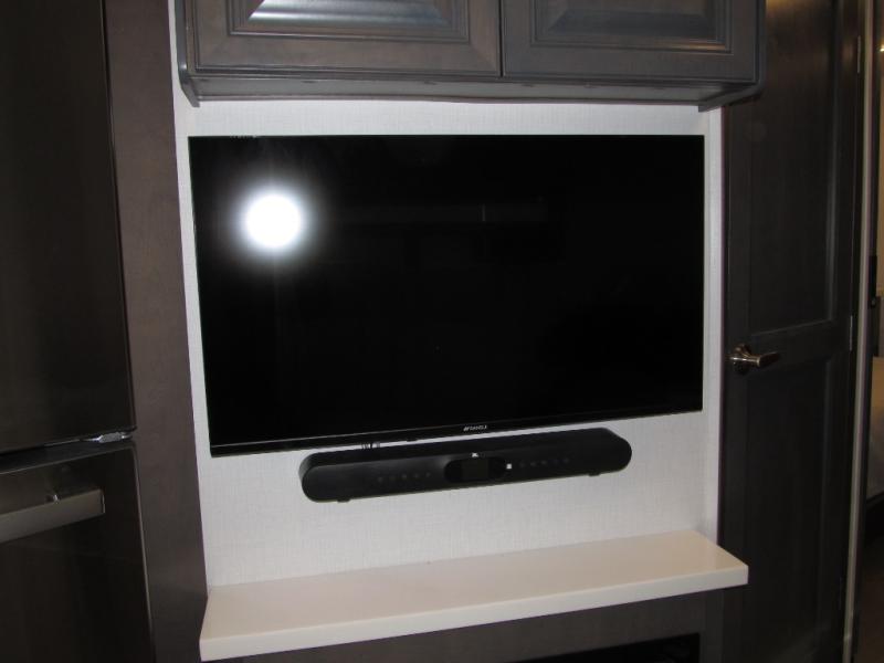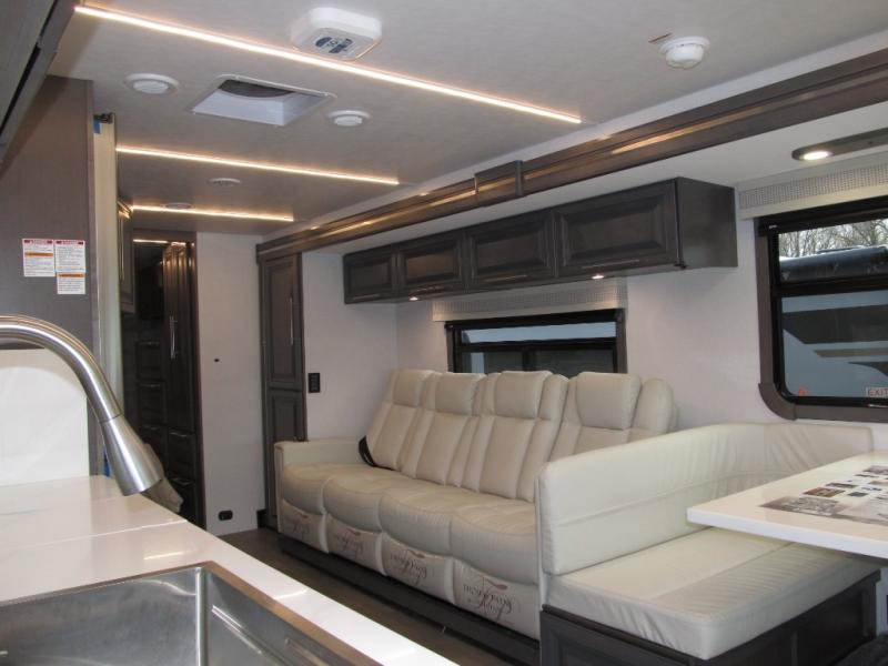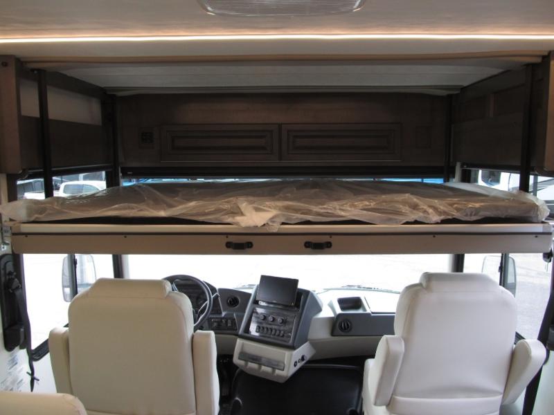 Comfort and convenience are found all throughout this motorhome! Starting with the full rear master bath that has a shower with a seat and a dual sink vanity, plus it leads into the private bedroom. Inside the bedroom is a 72" x 80" king bed slide with overhead cabinets across from a dresser with overhead cabinets and a 32" LED TV, a wardrobe, and another wardrobe that is prepped to add an optional stackable washer and dryer. The half bathroom is conveniently near the fully equipped kitchen so you can get back to creating your best home cooked meals fast. Relax in true comfort each night by either playing games at the booth dinette or on the theater seating that comes with power recline, heat, and massage!