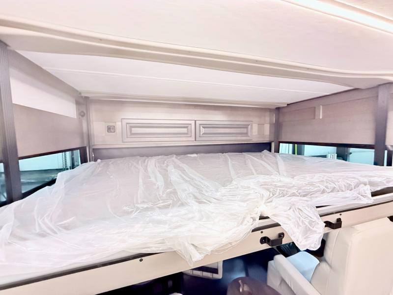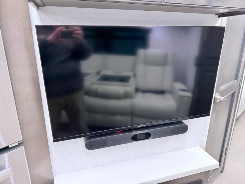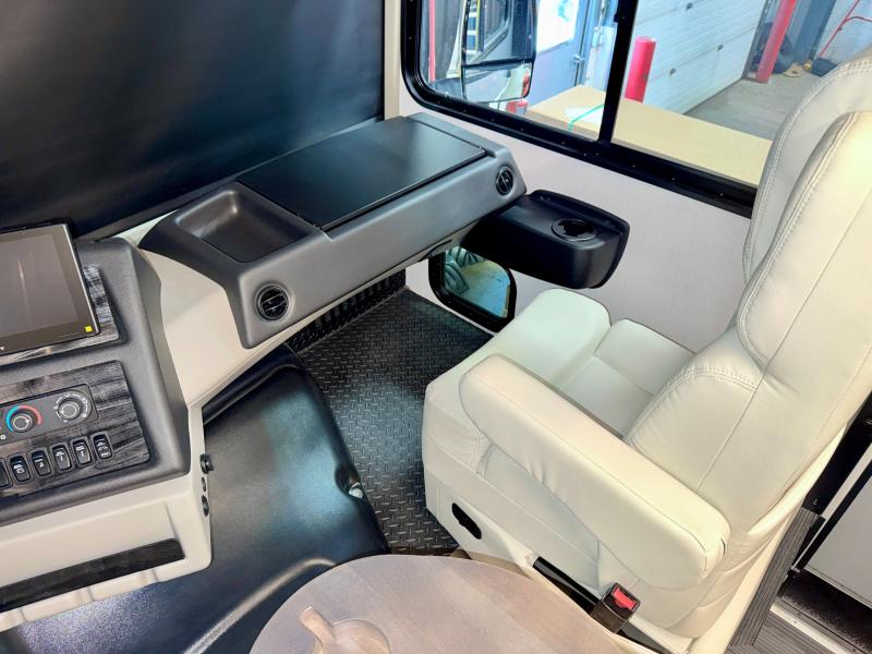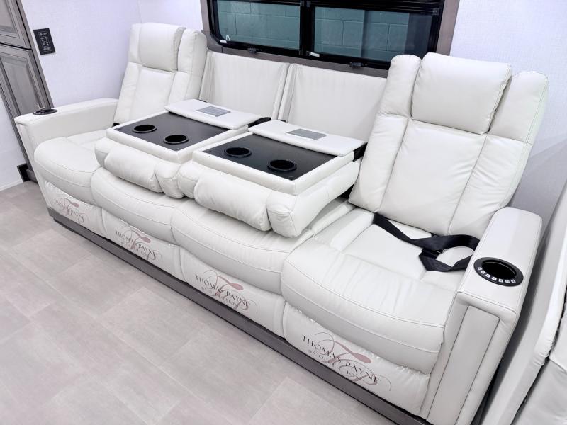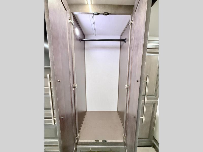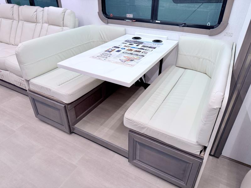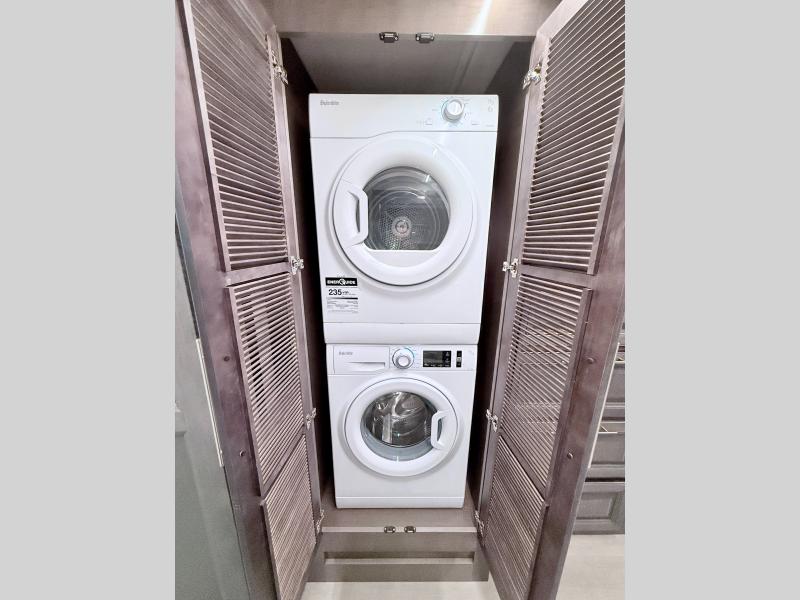 Comfort and convenience are found all throughout this motorhome! Starting with the full rear master bath that has a shower with a seat and a dual sink vanity, plus it leads into the private bedroom. Inside the bedroom is a 72" x 80" king bed slide with overhead cabinets across from a dresser with overhead cabinets and a 32" LED TV, a wardrobe, and another wardrobe that is prepped to add an optional stackable washer and dryer. The half bathroom is conveniently near the fully equipped kitchen so you can get back to creating your best home cooked meals fast. Relax in true comfort each night by either playing games at the booth dinette or on the theater seating that comes with power recline, heat, and massage!