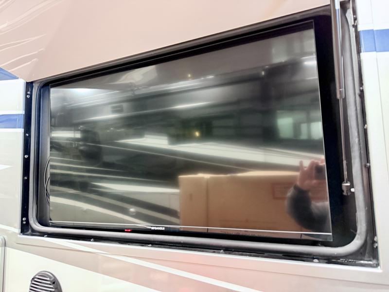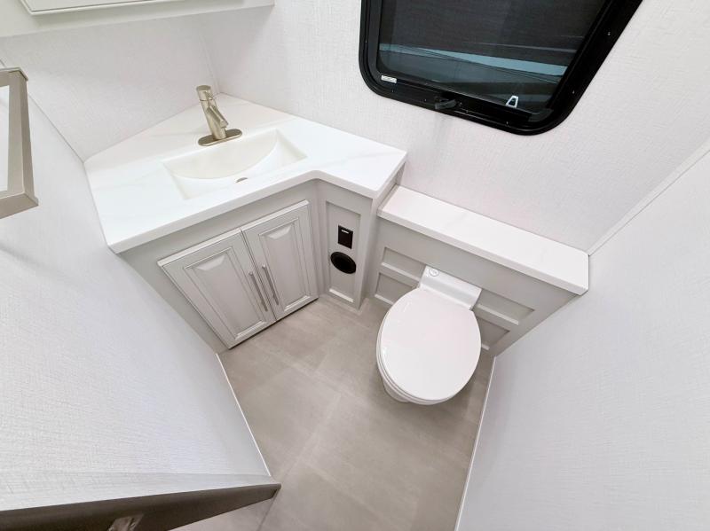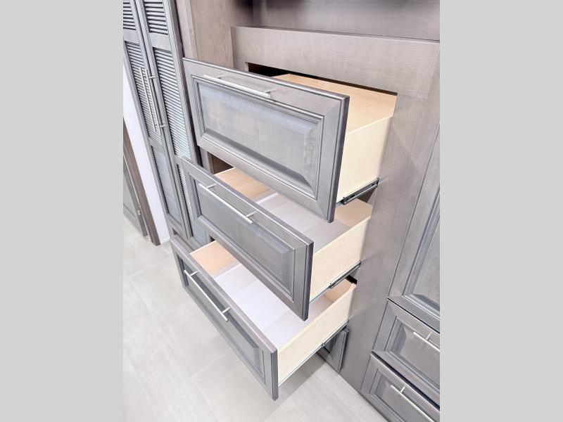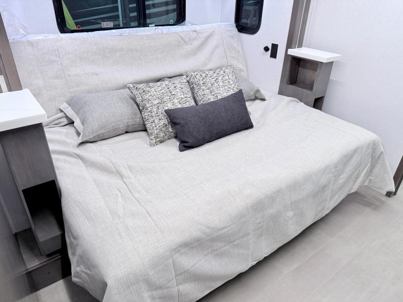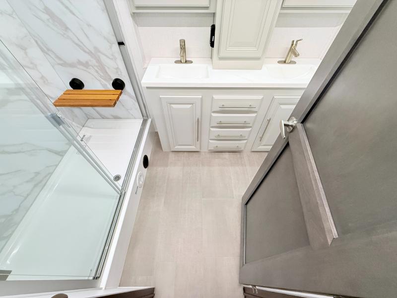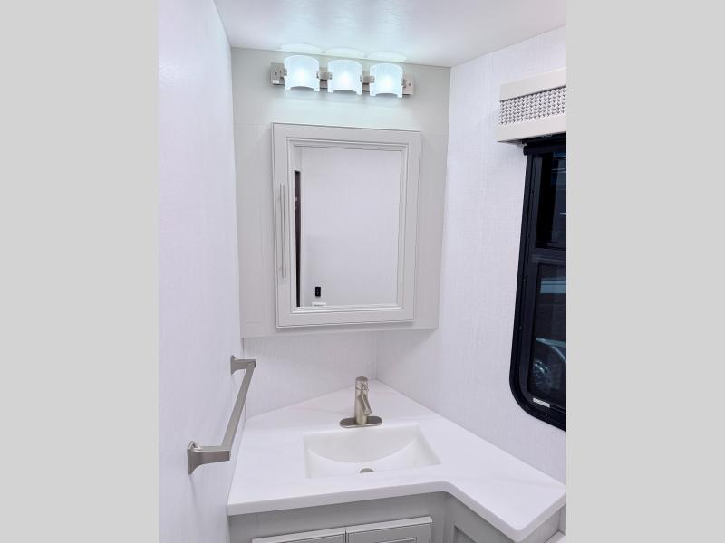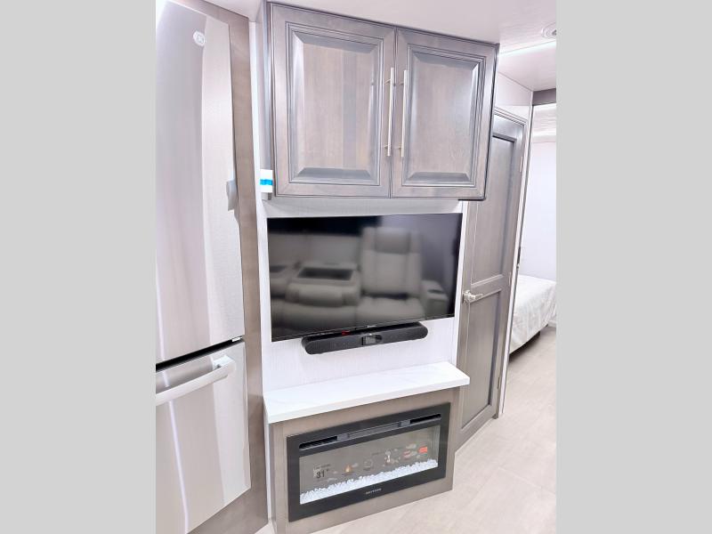 Comfort and convenience are found all throughout this motorhome! Starting with the full rear master bath that has a shower with a seat and a dual sink vanity, plus it leads into the private bedroom. Inside the bedroom is a 72" x 80" king bed slide with overhead cabinets across from a dresser with overhead cabinets and a 32" LED TV, a wardrobe, and another wardrobe that is prepped to add an optional stackable washer and dryer. The half bathroom is conveniently near the fully equipped kitchen so you can get back to creating your best home cooked meals fast. Relax in true comfort each night by either playing games at the booth dinette or on the theater seating that comes with power recline, heat, and massage!