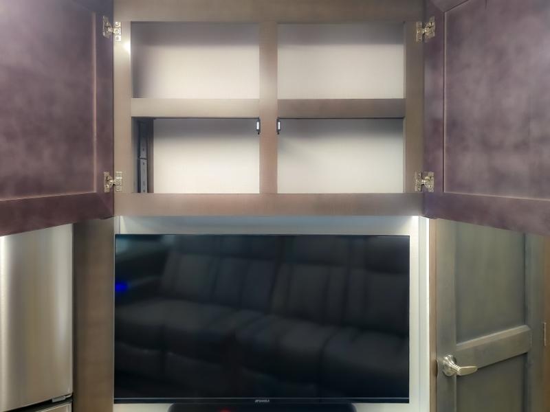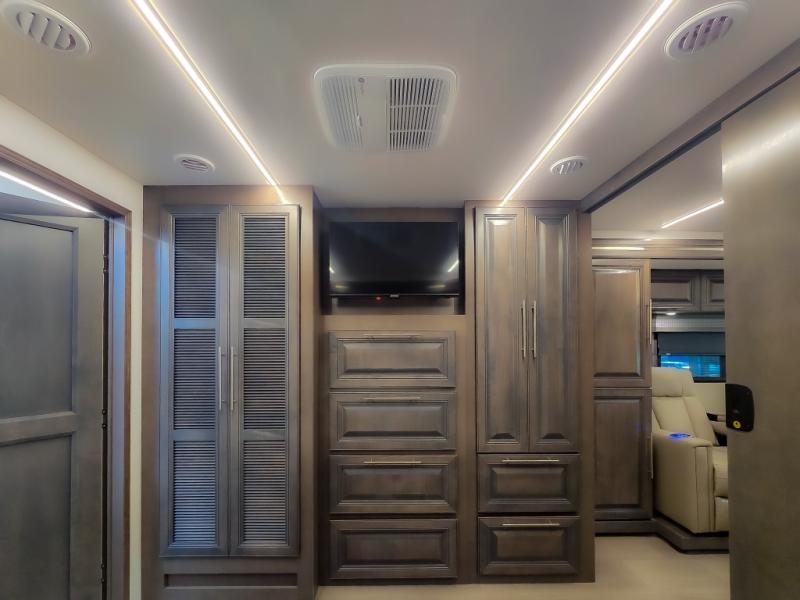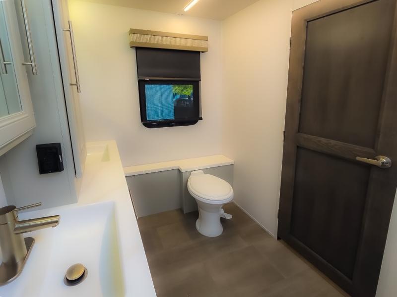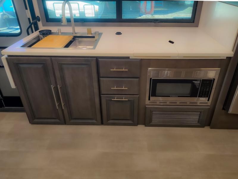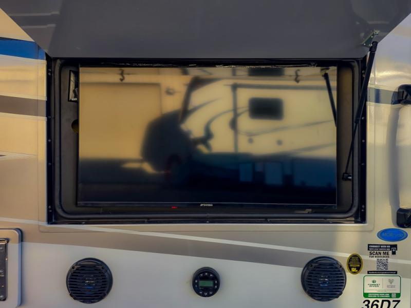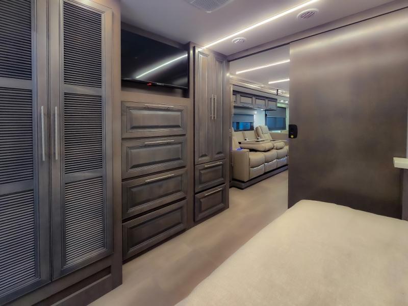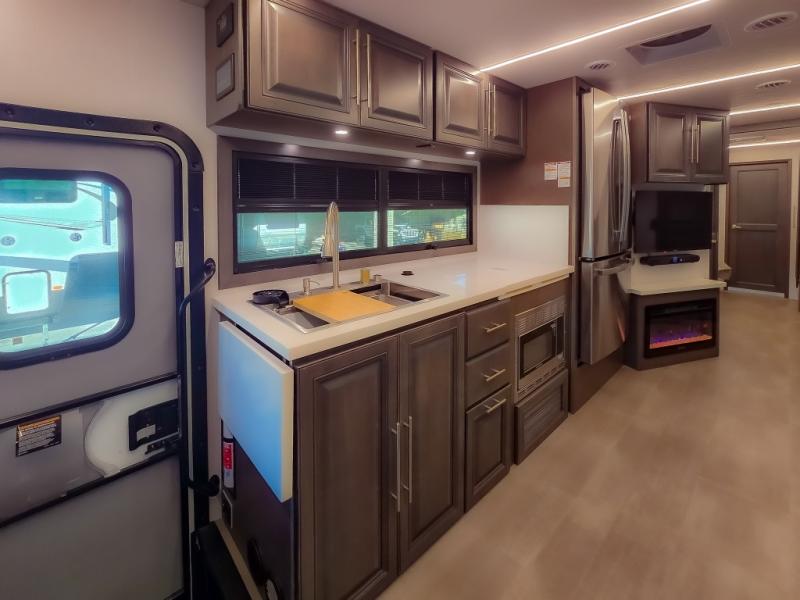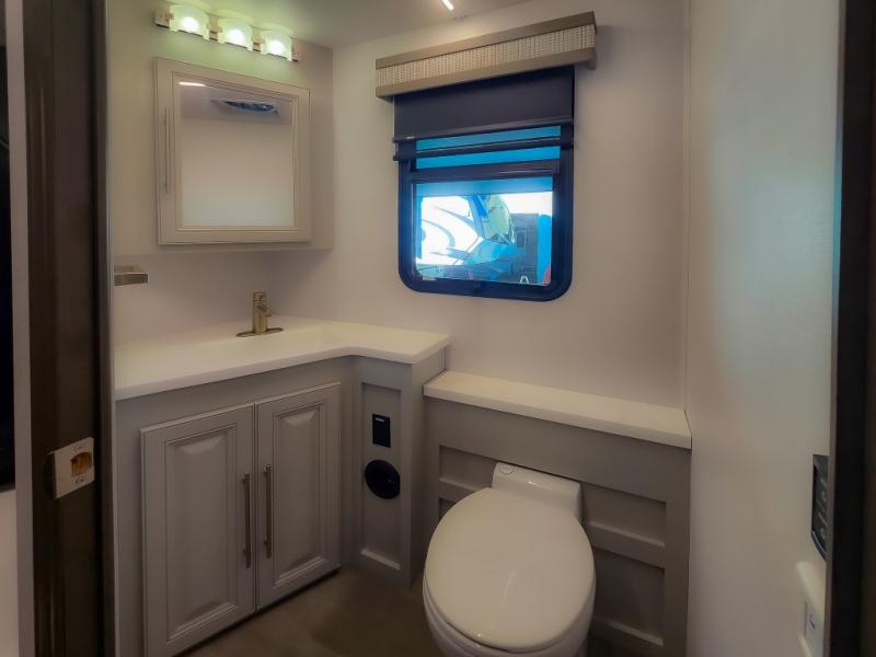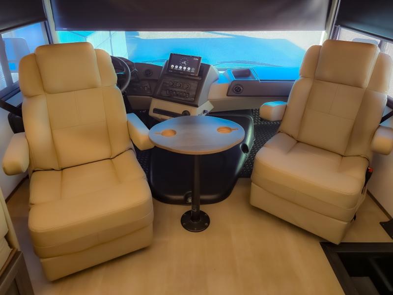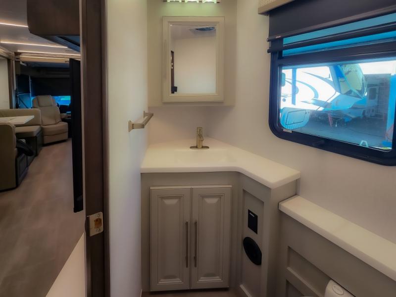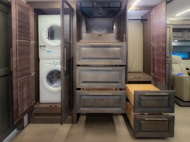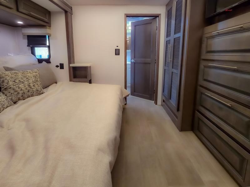 Comfort and convenience are found all throughout this motorhome! Starting with the full rear master bath that has a shower with a seat and a dual sink vanity, plus it leads into the private bedroom. Inside the bedroom is a 72" x 80" king bed slide with overhead cabinets across from a dresser with overhead cabinets and a 32" LED TV, a wardrobe, and another wardrobe that is prepped to add an optional stackable washer and dryer. The half bathroom is conveniently near the fully equipped kitchen so you can get back to creating your best home cooked meals fast. Relax in true comfort each night by either playing games at the booth dinette or on the theater seating that comes with power recline, heat, and massage!
