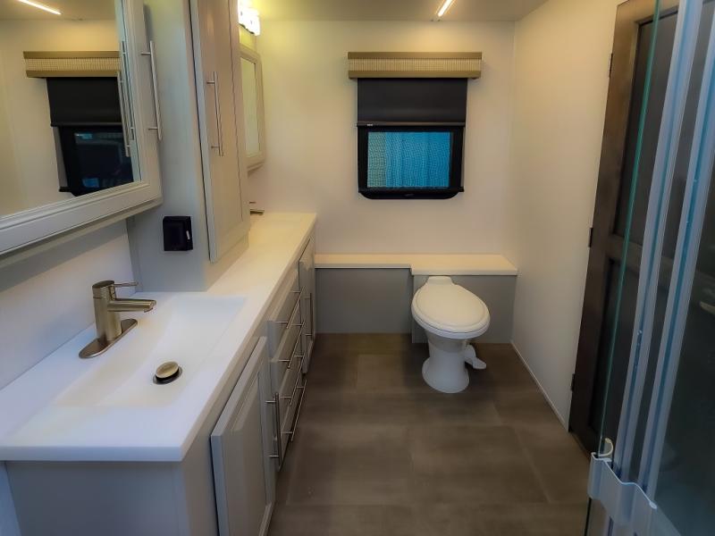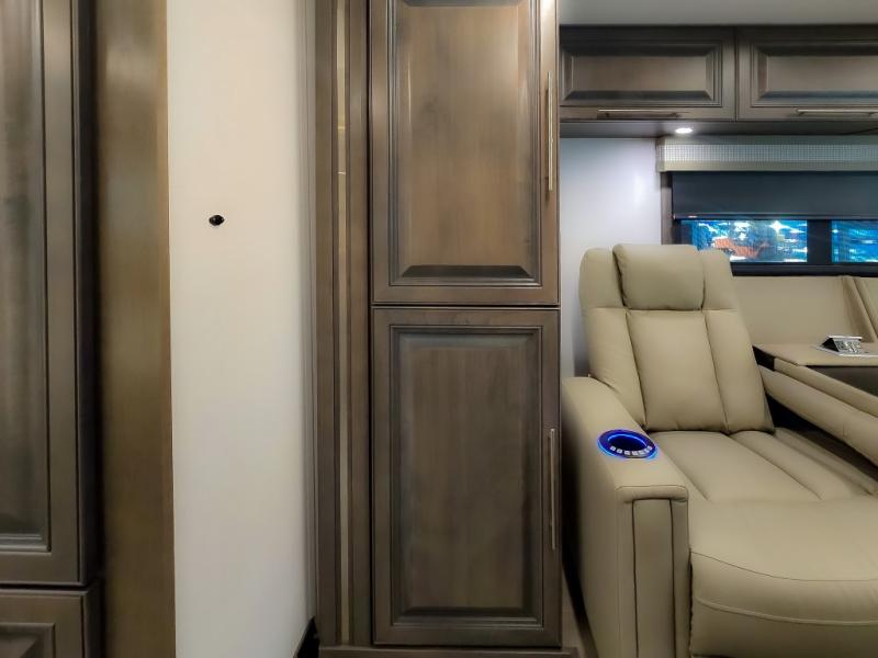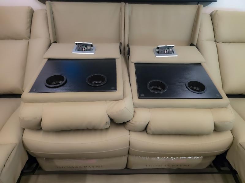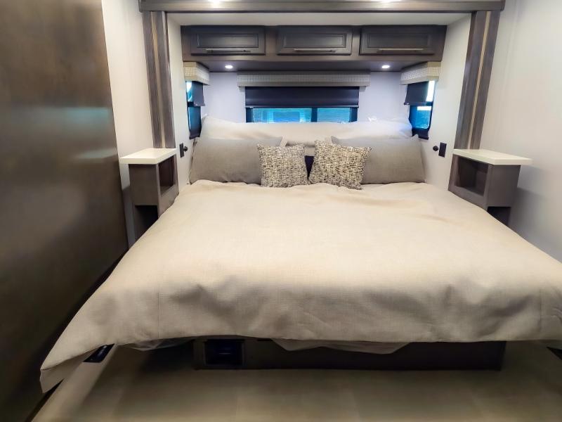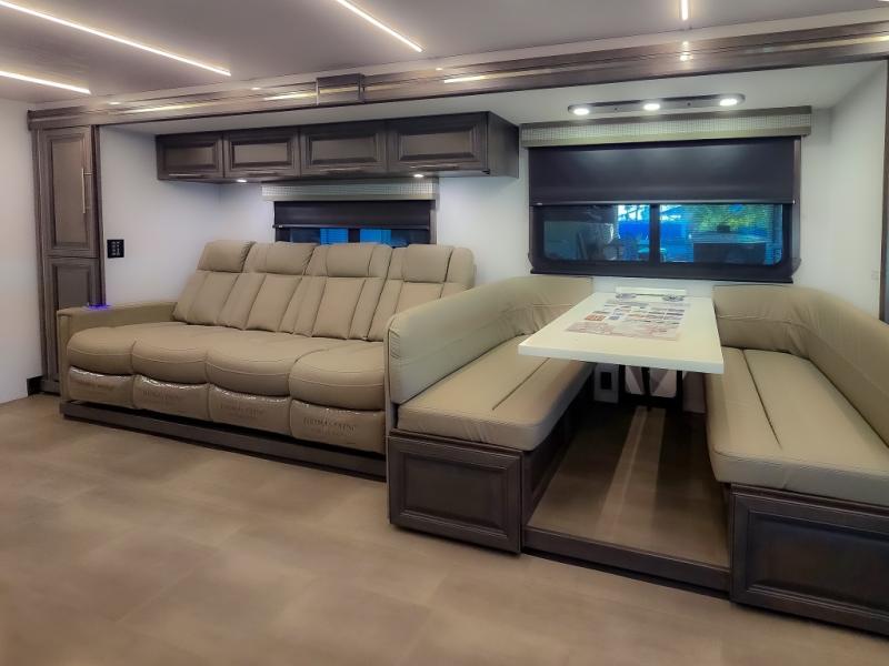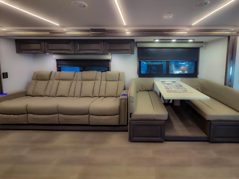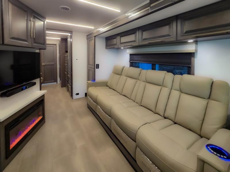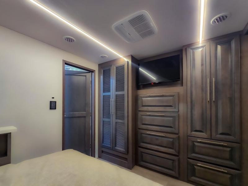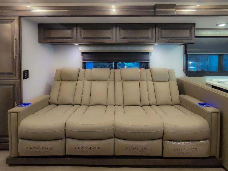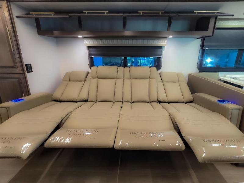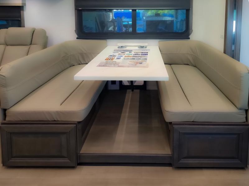 Comfort and convenience are found all throughout this motorhome! Starting with the full rear master bath that has a shower with a seat and a dual sink vanity, plus it leads into the private bedroom. Inside the bedroom is a 72" x 80" king bed slide with overhead cabinets across from a dresser with overhead cabinets and a 32" LED TV, a wardrobe, and another wardrobe that is prepped to add an optional stackable washer and dryer. The half bathroom is conveniently near the fully equipped kitchen so you can get back to creating your best home cooked meals fast. Relax in true comfort each night by either playing games at the booth dinette or on the theater seating that comes with power recline, heat, and massage!