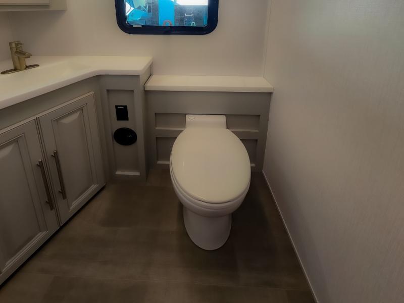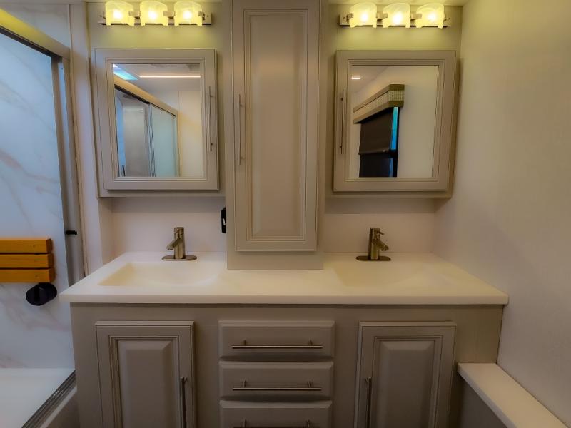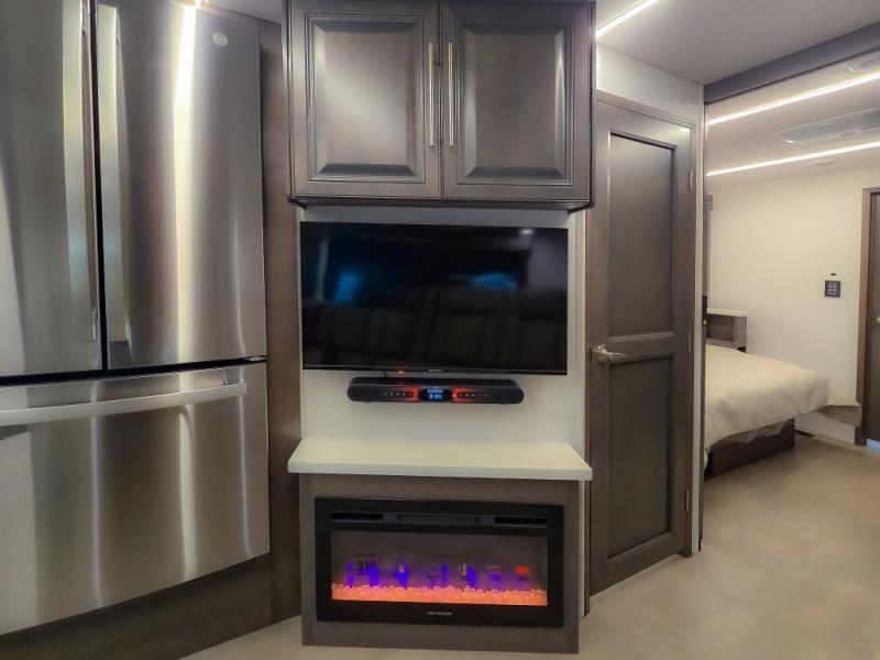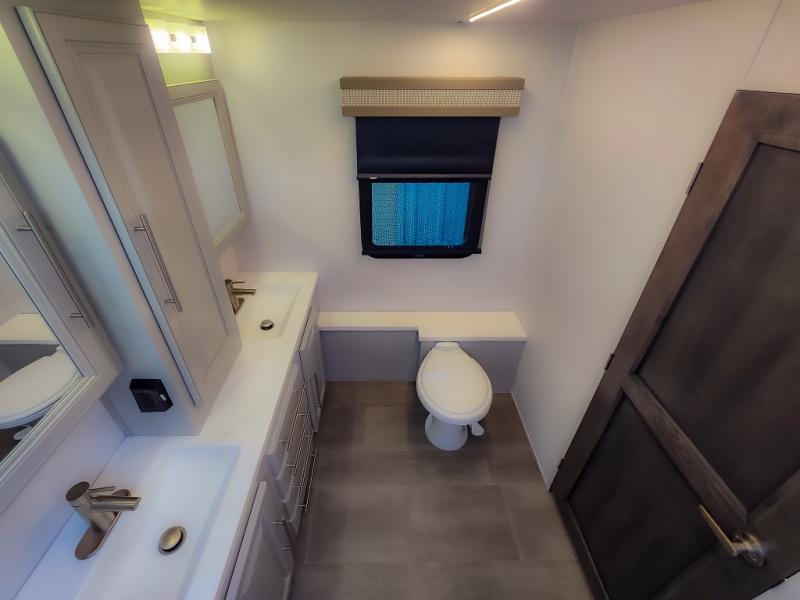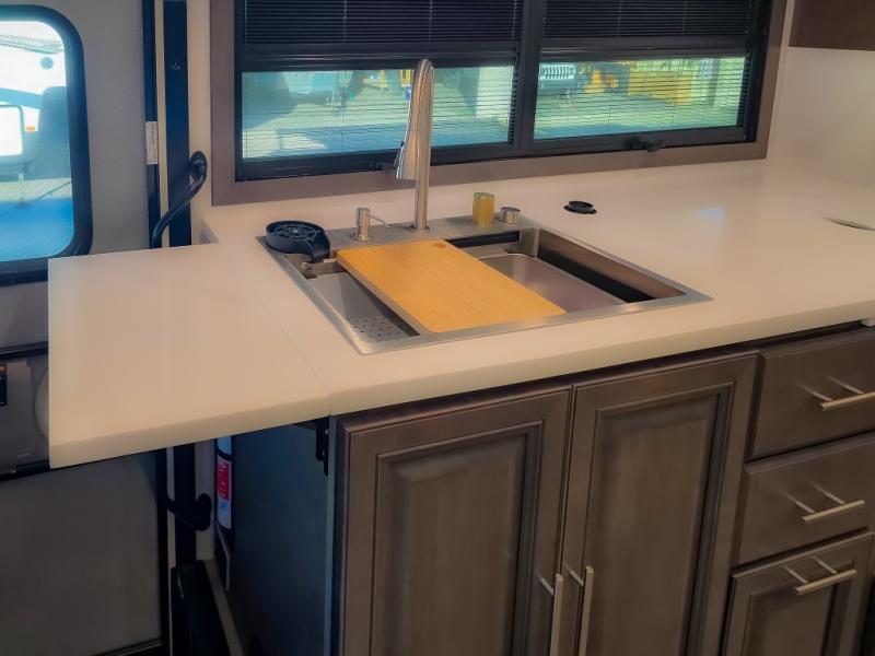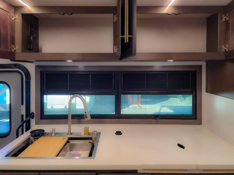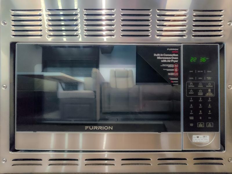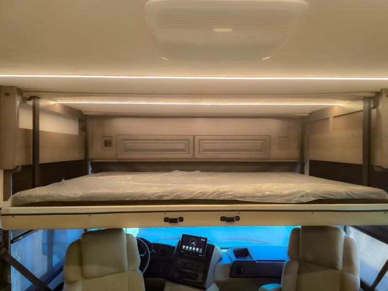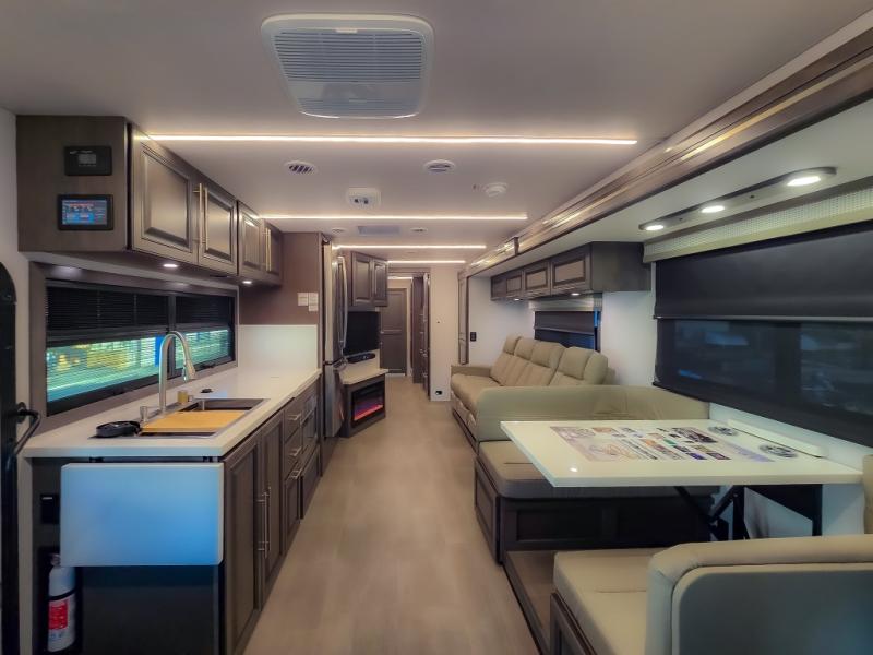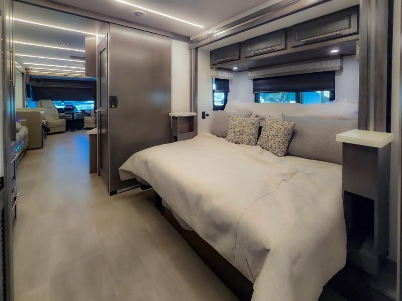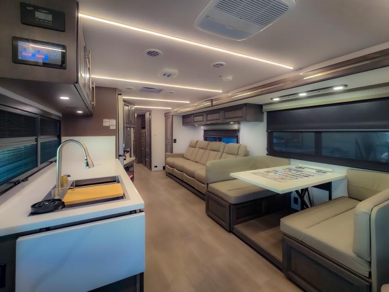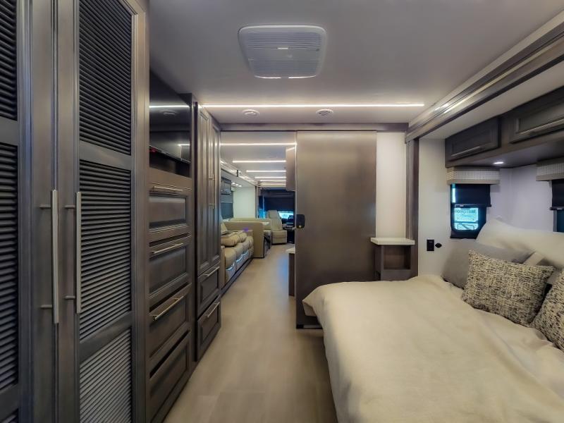 Comfort and convenience are found all throughout this motorhome! Starting with the full rear master bath that has a shower with a seat and a dual sink vanity, plus it leads into the private bedroom. Inside the bedroom is a 72" x 80" king bed slide with overhead cabinets across from a dresser with overhead cabinets and a 32" LED TV, a wardrobe, and another wardrobe that is prepped to add an optional stackable washer and dryer. The half bathroom is conveniently near the fully equipped kitchen so you can get back to creating your best home cooked meals fast. Relax in true comfort each night by either playing games at the booth dinette or on the theater seating that comes with power recline, heat, and massage!