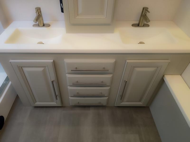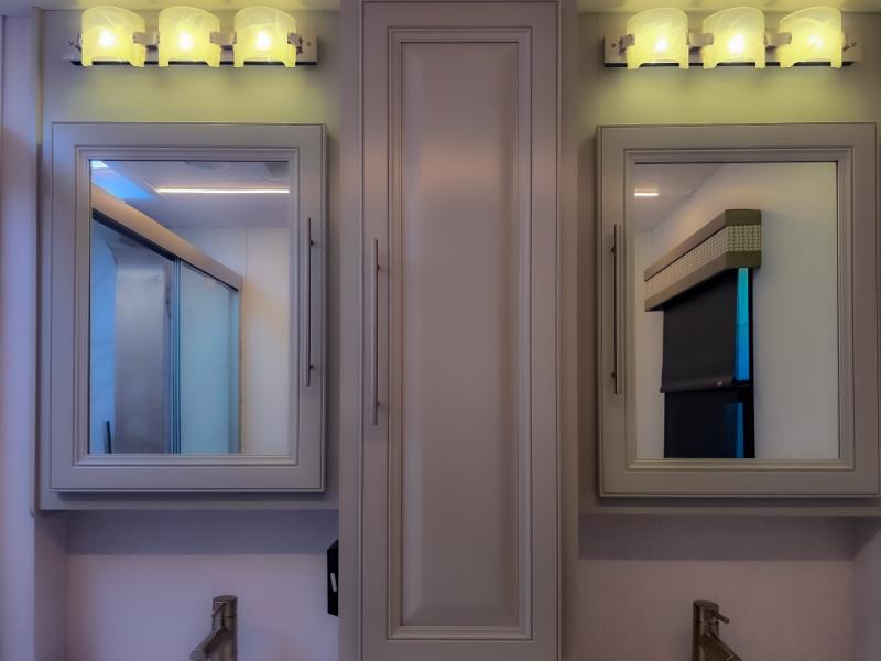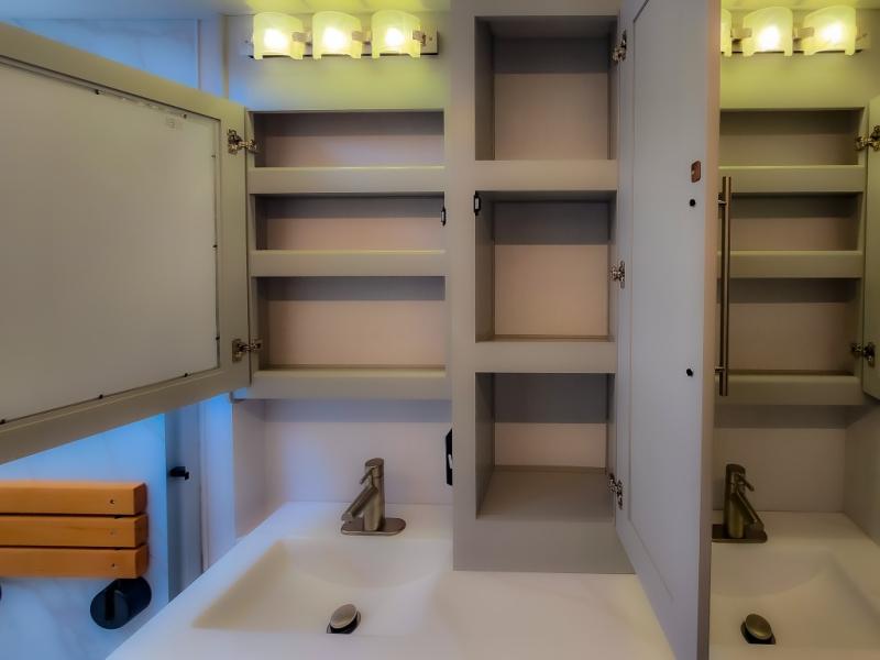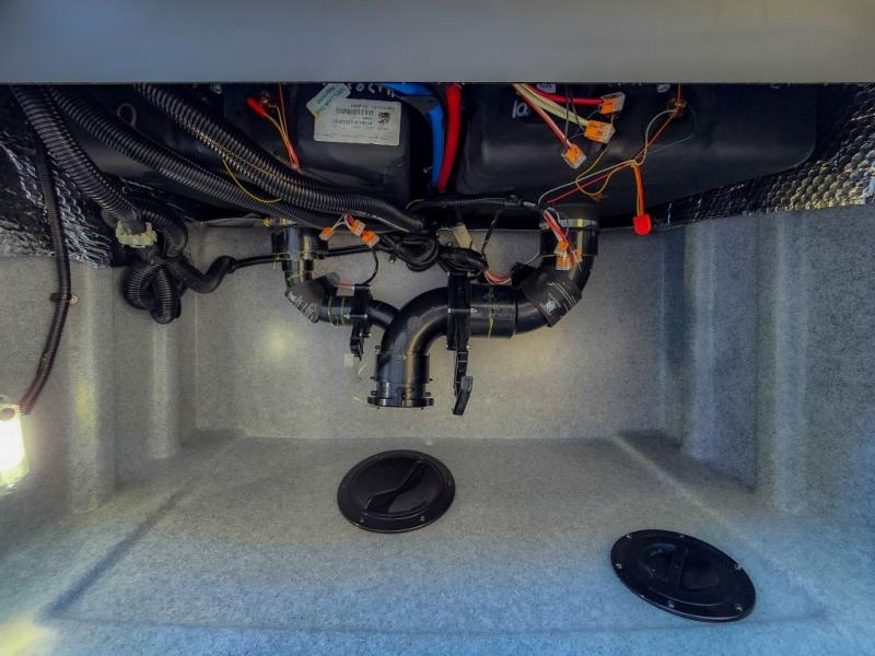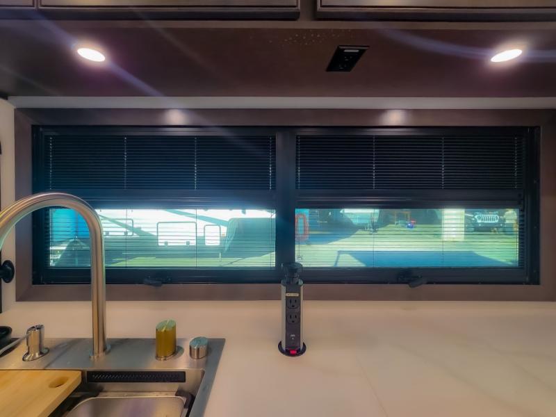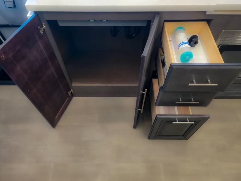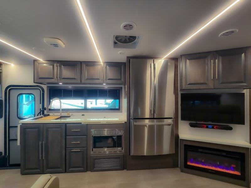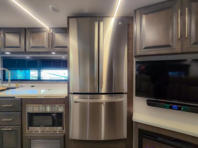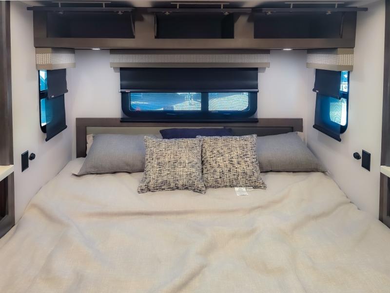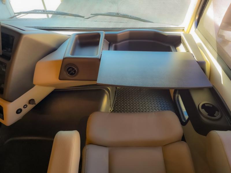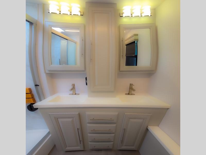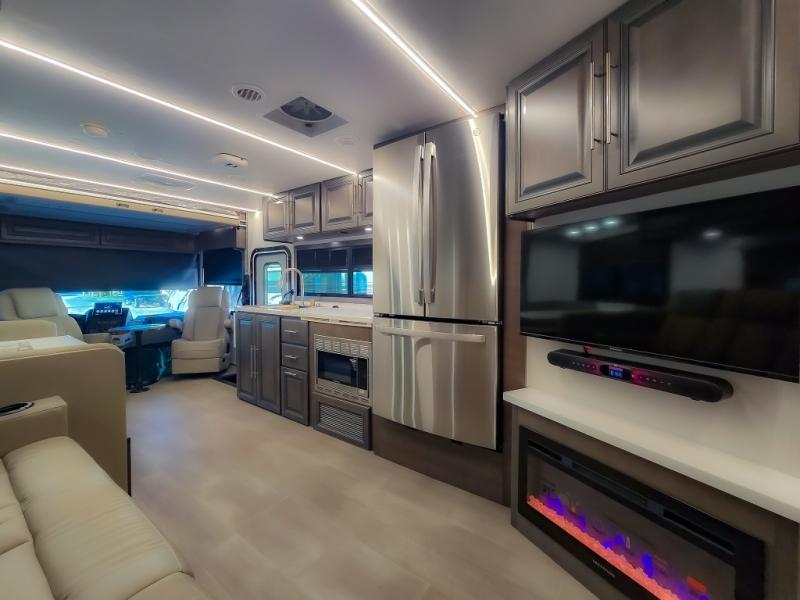 Comfort and convenience are found all throughout this motorhome! Starting with the full rear master bath that has a shower with a seat and a dual sink vanity, plus it leads into the private bedroom. Inside the bedroom is a 72" x 80" king bed slide with overhead cabinets across from a dresser with overhead cabinets and a 32" LED TV, a wardrobe, and another wardrobe that is prepped to add an optional stackable washer and dryer. The half bathroom is conveniently near the fully equipped kitchen so you can get back to creating your best home cooked meals fast. Relax in true comfort each night by either playing games at the booth dinette or on the theater seating that comes with power recline, heat, and massage!