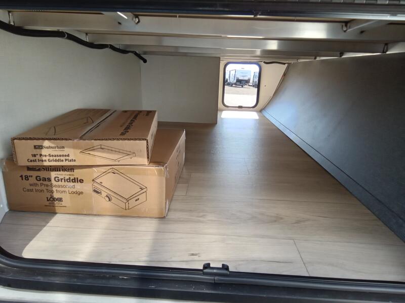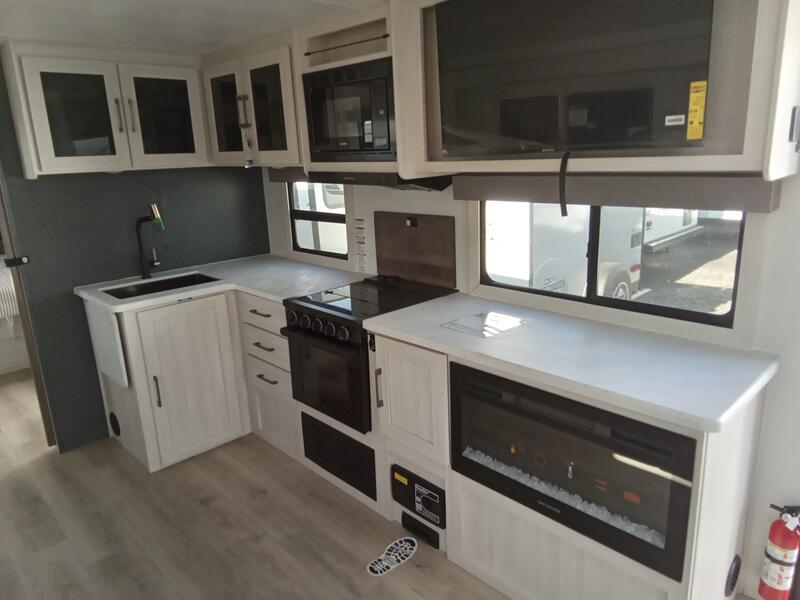 Camping your favorite site has never been more relaxing than in this travel trailer. You can comfortably sleep five to six each night with the custom king bed in the front master bedroom, plus the tri-fold sofa and booth dinette in the rear living area. There is also a walk-through bath that will easily accessible for everyone to use. Whip up your best meals on the residential range, or head outdoors to cook on the gas griddle included within the outdoor kitchen. You'll also find a sink and a refrigerator, and a 21' power awning with LED lights to create the perfect outdoor living space. After a day outdoors, you can relax by the fireplace or watch a movie on the HD TV, and there is a large kitchen pantry to stock up on snacks!