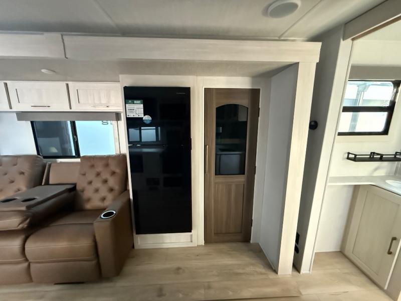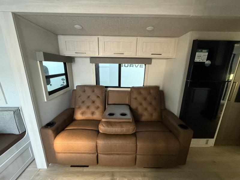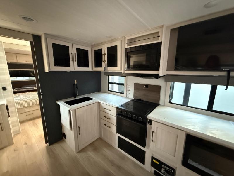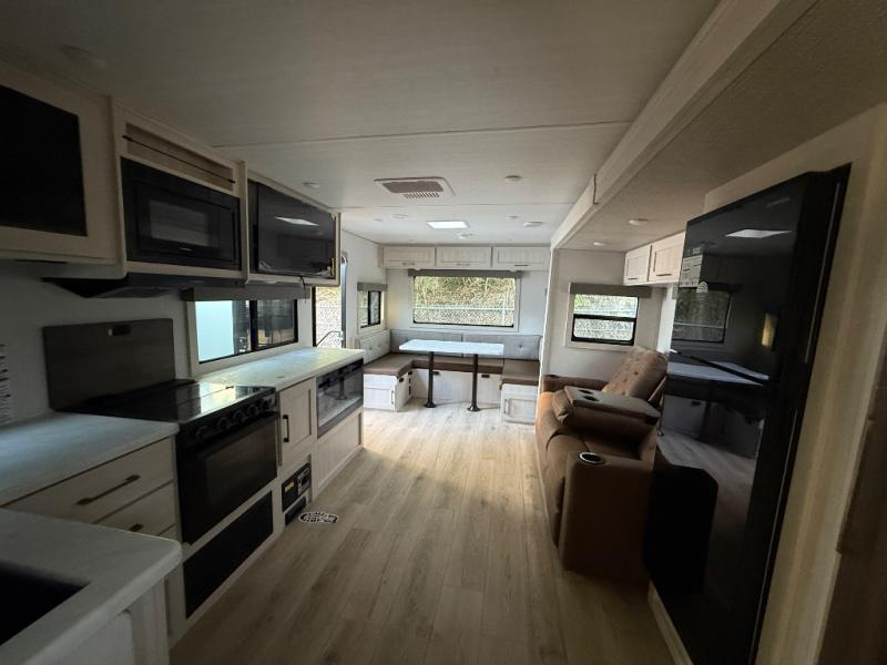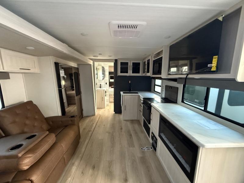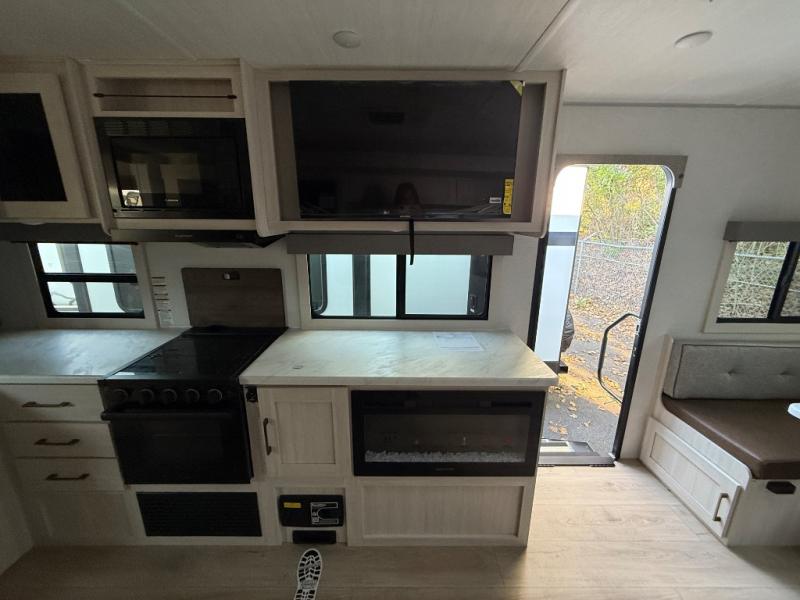 Camping your favorite site has never been more relaxing than in this travel trailer. You can comfortably sleep five to six each night with the custom king bed in the front master bedroom, plus the tri-fold sofa and booth dinette in the rear living area. There is also a walk-through bath that will easily accessible for everyone to use. Whip up your best meals on the residential range, or head outdoors to cook on the gas griddle included within the outdoor kitchen. You'll also find a sink and a refrigerator, and a 21' power awning with LED lights to create the perfect outdoor living space. After a day outdoors, you can relax by the fireplace or watch a movie on the HD TV, and there is a large kitchen pantry to stock up on snacks!