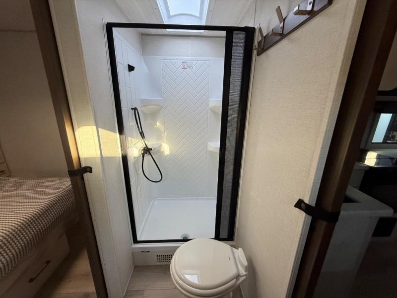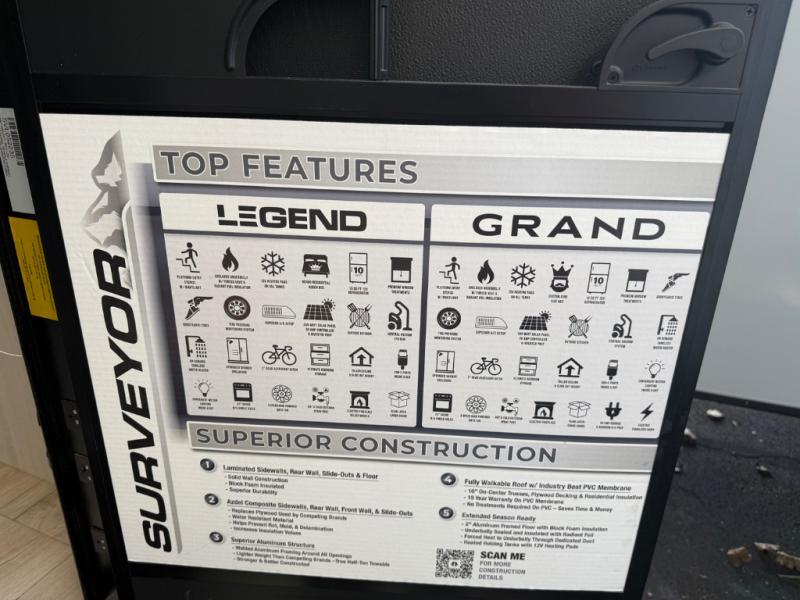 With any Grand Surveyor travel trailer by Forest River you will enjoy turn-key ready-to-go features and quality construction! Each model includes Azdel composite walls and a gel coated fiberglass front cap with an automotive style tinted windshield for a sleek look. There are friction hinge black glass entry door(s), an adjustable platform step with a night light, plus Goodyear tires and a power tongue jack for easy towing. The interior will have you feeling right at home with roller shades, residential faucets, sinks, and bathroom vanity, plus Surf(x) seamless countertops throughout. You can also plan for adventure with a 2" rear accessory and exterior spray port, and there are slam latch exterior baggage doors throughout to keep all your gear secure. Other stand-out features include a central vacuum system, a 200 watt solar panel with a 30 amp controller, a tankless water heater, carpet-free interiors, and the list goes on!