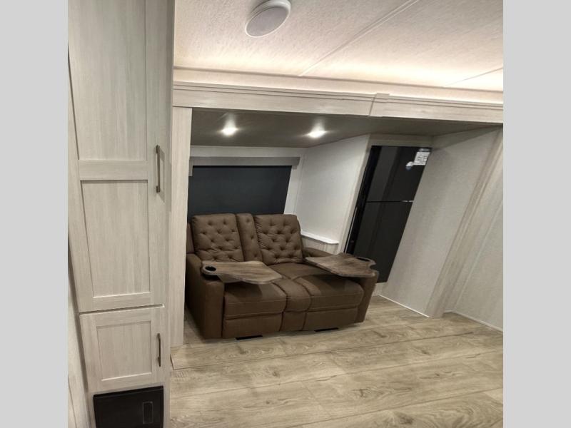 Camping your favorite site has never been more relaxing than in this travel trailer. You can comfortably sleep five to six each night with the custom king bed in the front master bedroom, plus the theater seat and u-dinette in the rear living area. There is also a walk-through bath that will easily accessible for everyone to use. Whip up your best meals on the residential range, or head outdoors to cook on the gas griddle included within the outdoor kitchen. You'll also find a sink and a refrigerator, and a 21' power awning with LED lights to create the perfect outdoor living space. After a day outdoors, you can relax by the fireplace or watch a movie on the HD TV, and there is a large kitchen pantry to stock up on snacks!