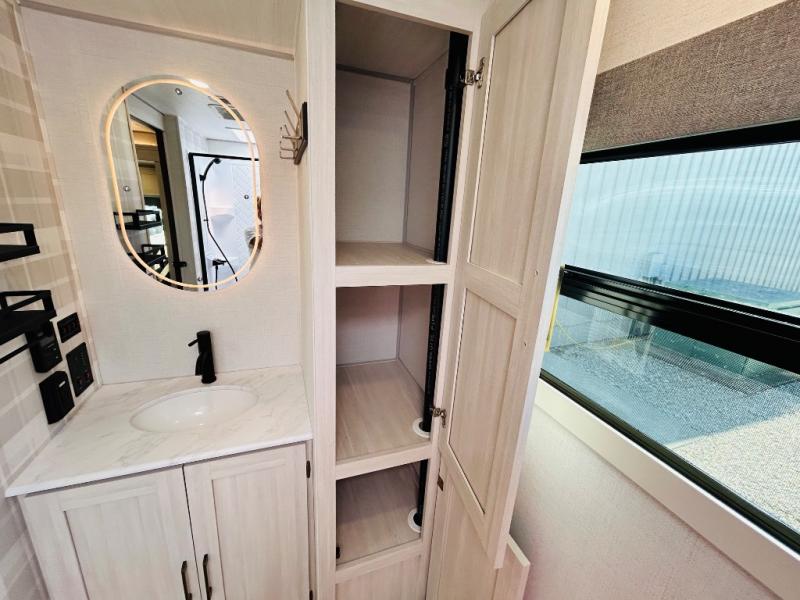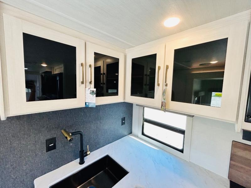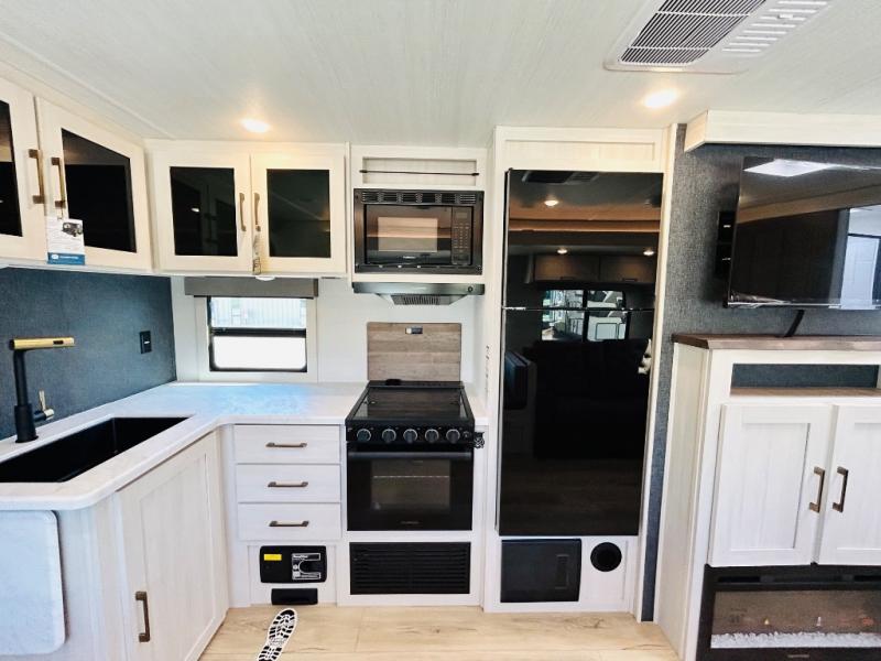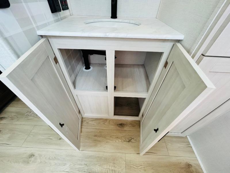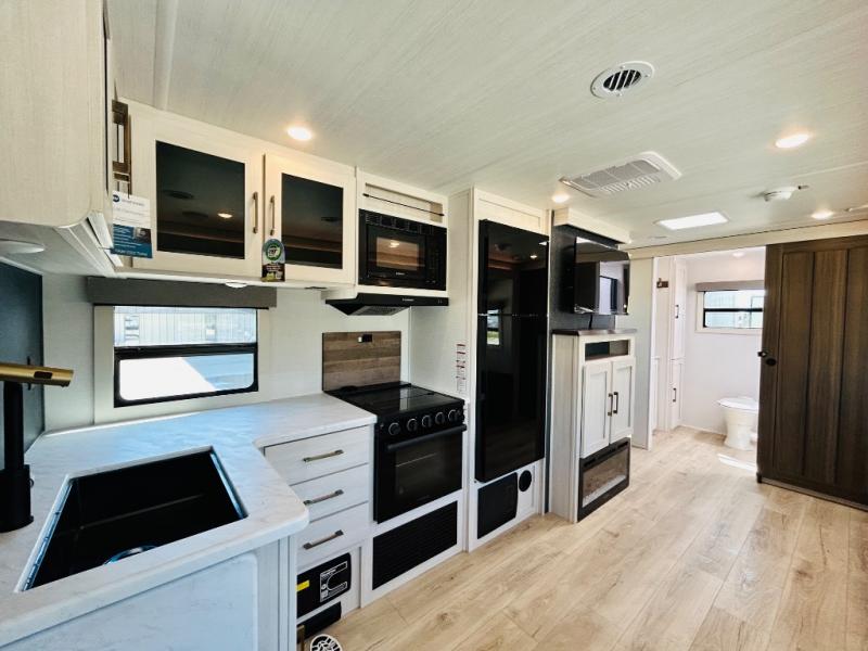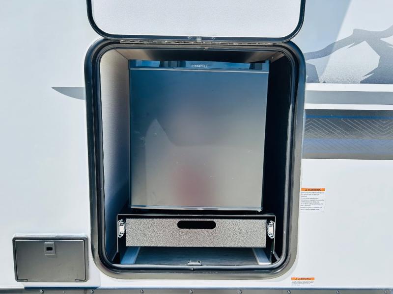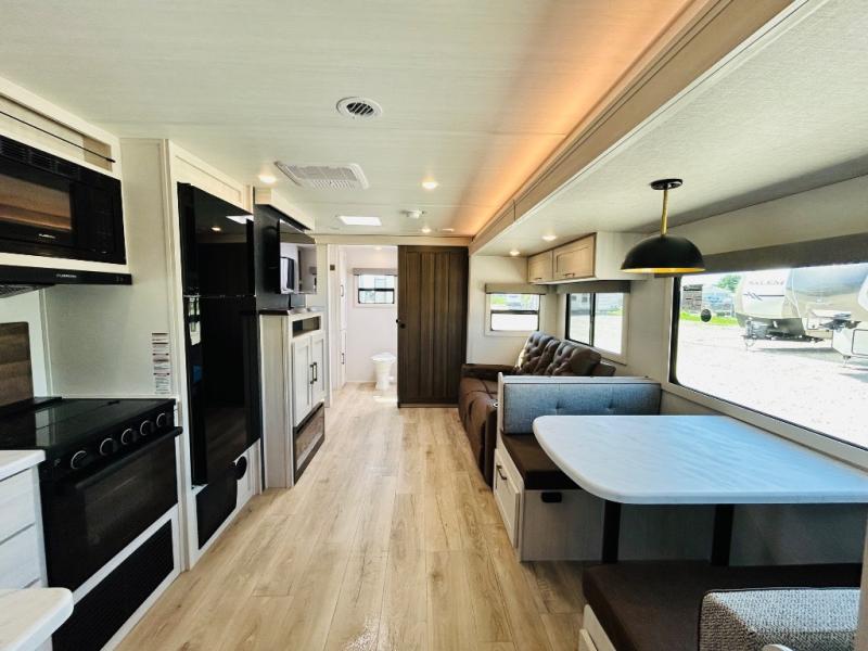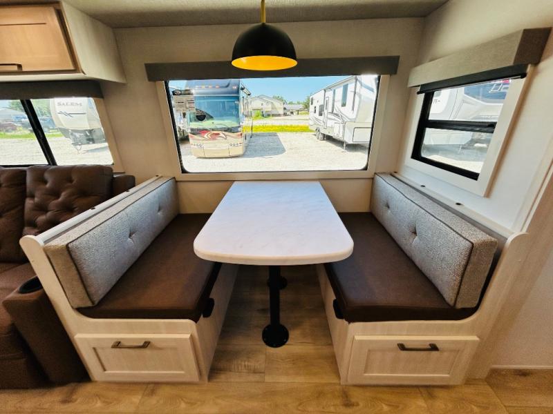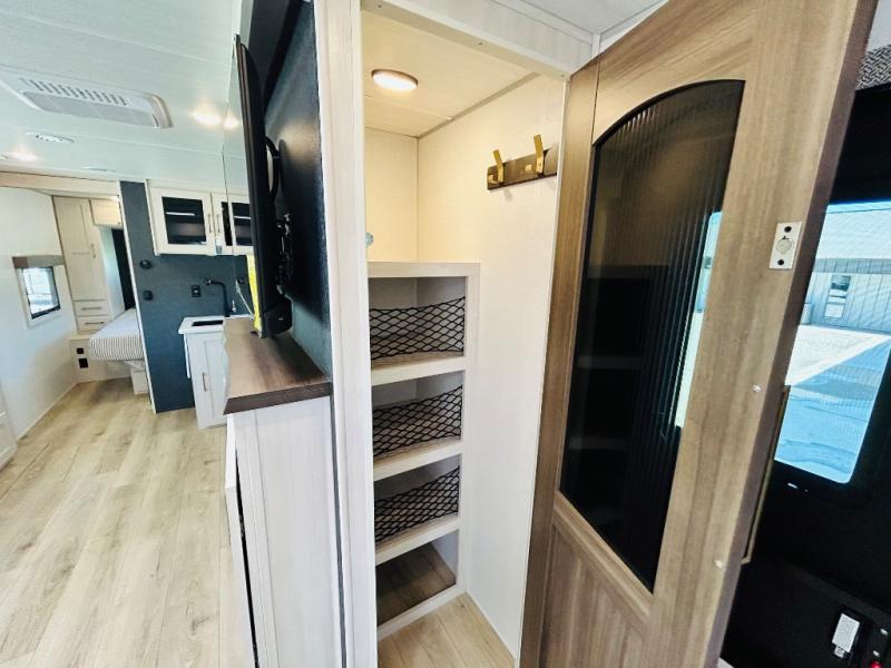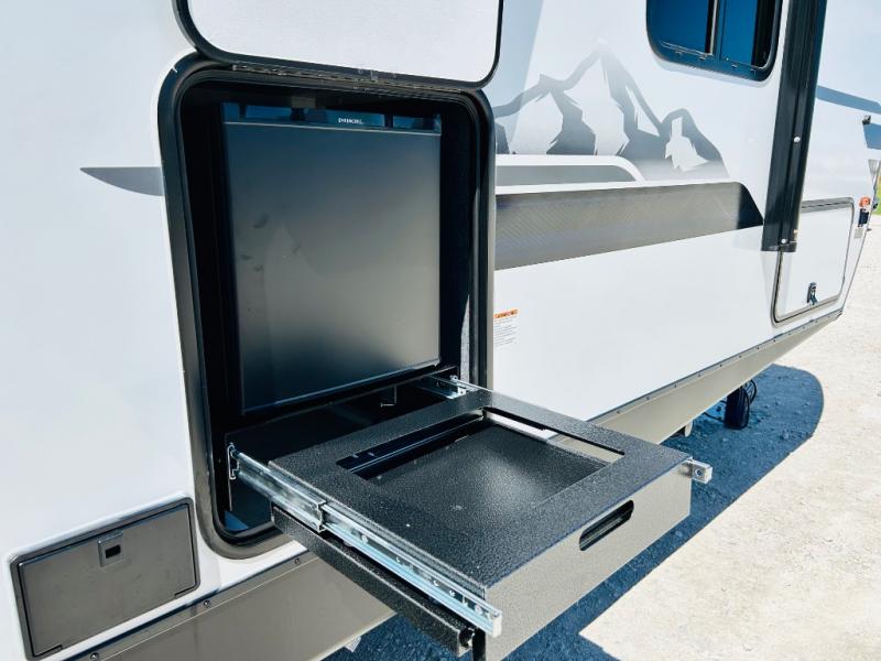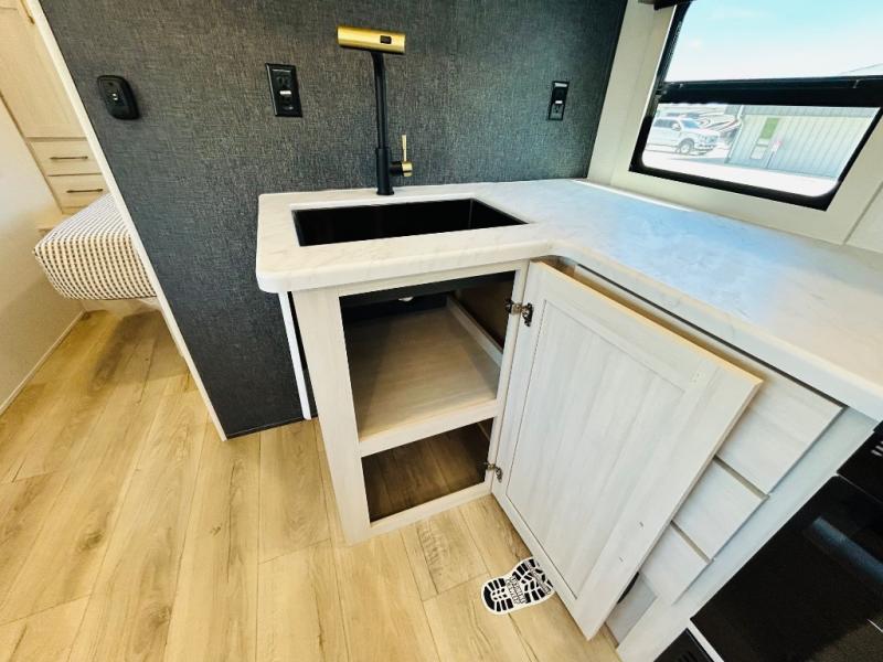 No need to rough it when you camp; this trailer offers amenities that allow you to "Glamp" if you want! The rear spacious bathroom is tucked away behind a beautiful barn door, and inside features a shower, wardrobe, and linen storage. The front master bedroom offers privacy, a walk-around custom king bed, dual wardrobes and underbed storage, plus TV prep if you want the option to watch movies in bed. The L-shaped counter in the kitchen provides enough space to have everything at your fingertips while you cook, plus there is a countertop extension for more prep and serving space if needed. A nice walk-in pantry just inside the entry door will be perfect for chips and snacks or canned goods for those longer camping trips. If dining inside, the booth dinette with pull-out dinette drawers will be comfortable plus you will enjoy the view provided by the panoramic windows within the slide out. An outside kitchen will be a favorite for anyone that cooks, and the 19' awning will provide some protection and offering an outdoor living area to enjoy with everyone.