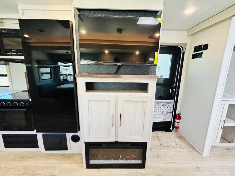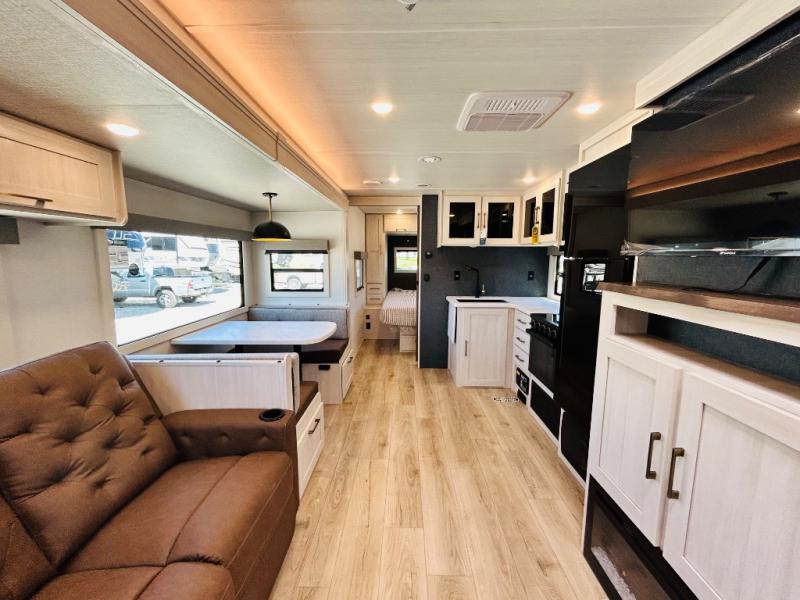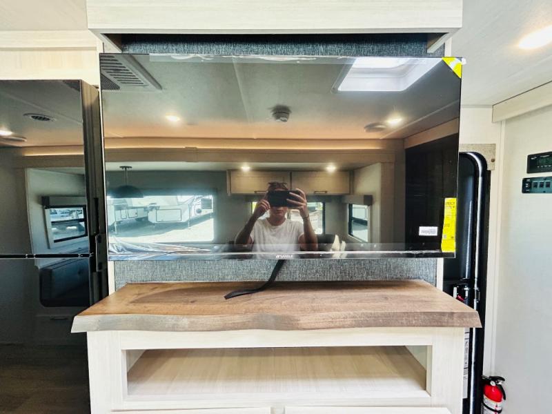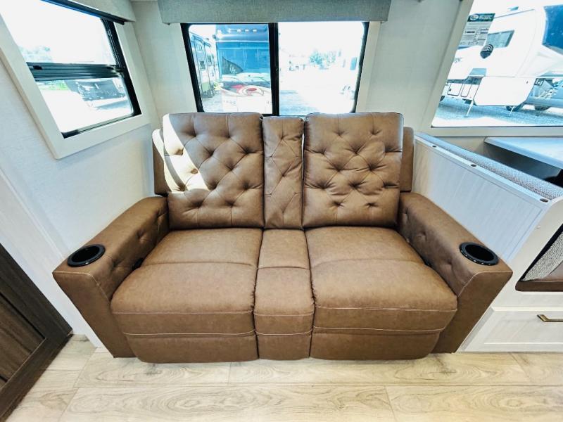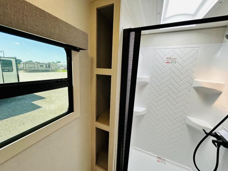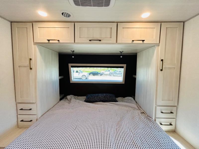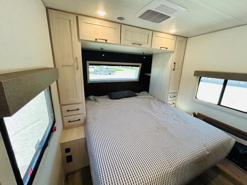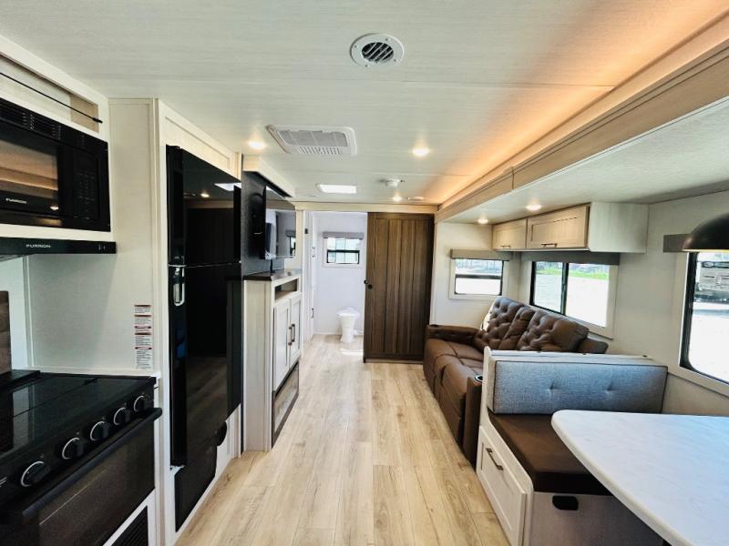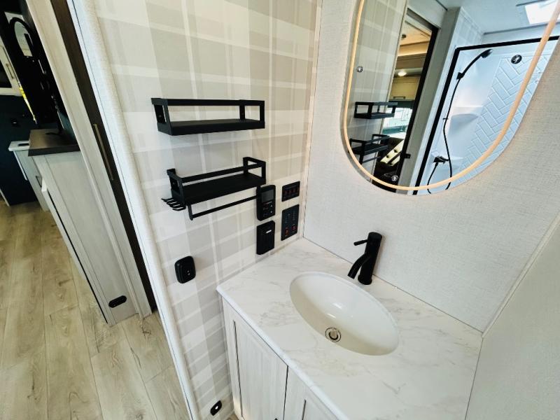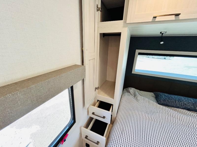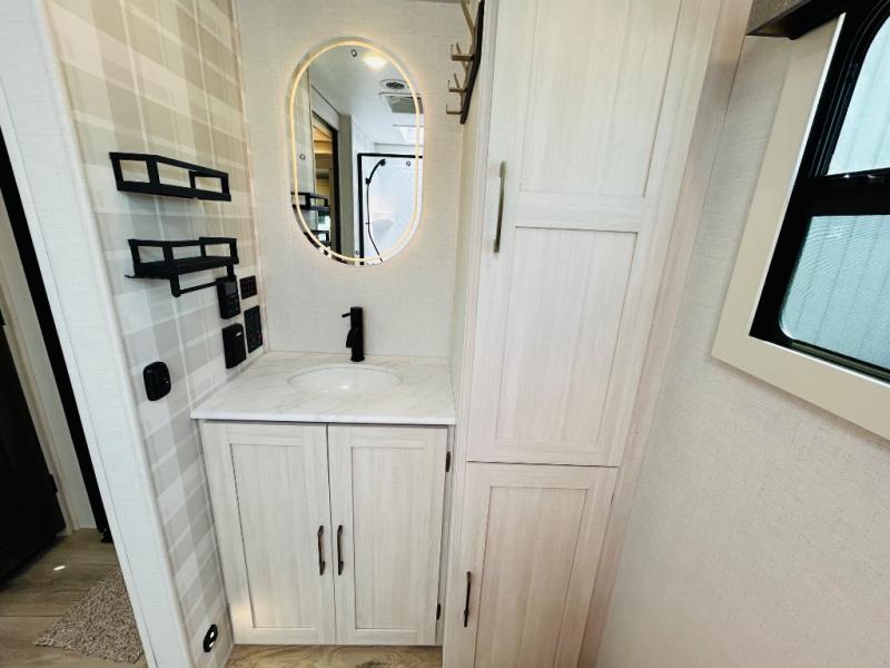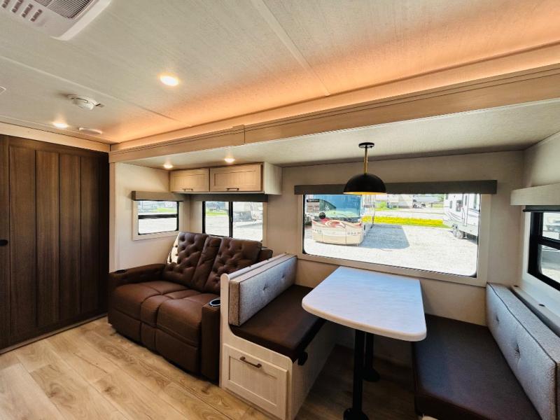 No need to rough it when you camp; this trailer offers amenities that allow you to "Glamp" if you want! The rear spacious bathroom is tucked away behind a beautiful barn door, and inside features a shower, wardrobe, and linen storage. The front master bedroom offers privacy, a walk-around custom king bed, dual wardrobes and underbed storage, plus TV prep if you want the option to watch movies in bed. The L-shaped counter in the kitchen provides enough space to have everything at your fingertips while you cook, plus there is a countertop extension for more prep and serving space if needed. A nice walk-in pantry just inside the entry door will be perfect for chips and snacks or canned goods for those longer camping trips. If dining inside, the booth dinette with pull-out dinette drawers will be comfortable plus you will enjoy the view provided by the panoramic windows within the slide out. An outside kitchen will be a favorite for anyone that cooks, and the 19' awning will provide some protection and offering an outdoor living area to enjoy with everyone.
