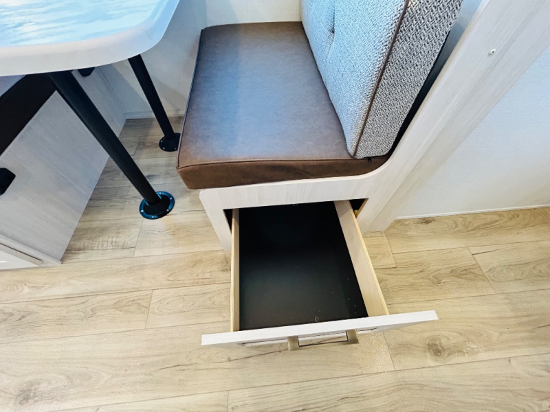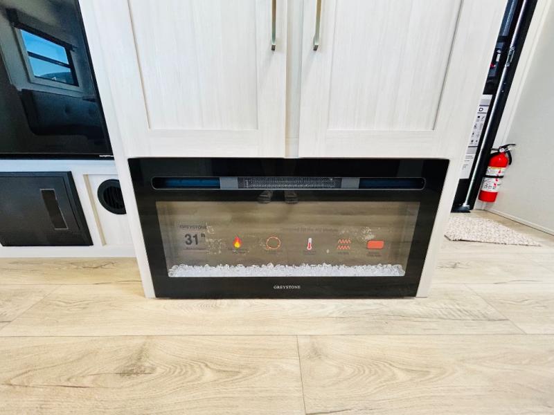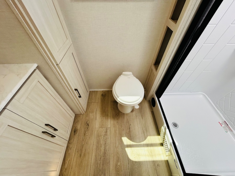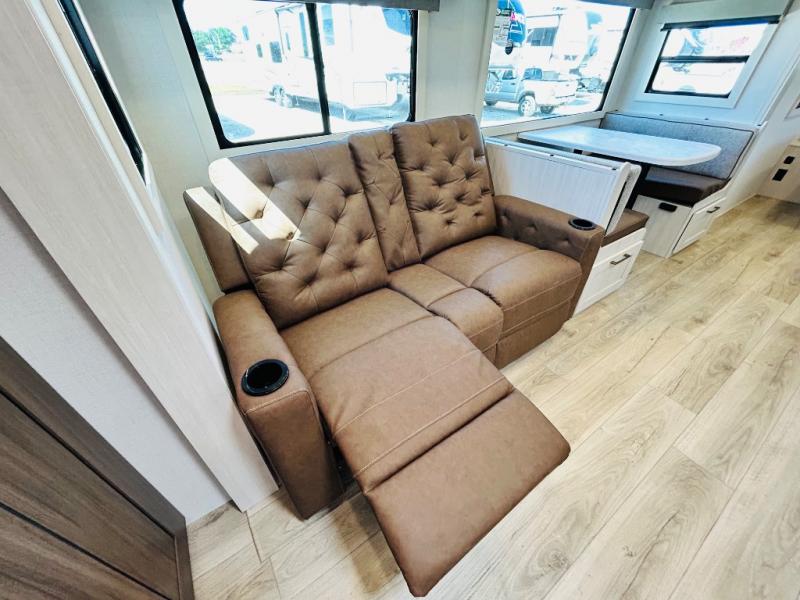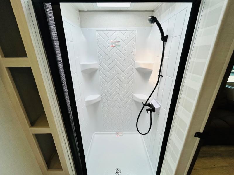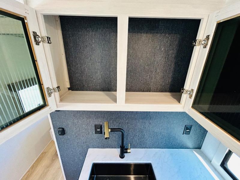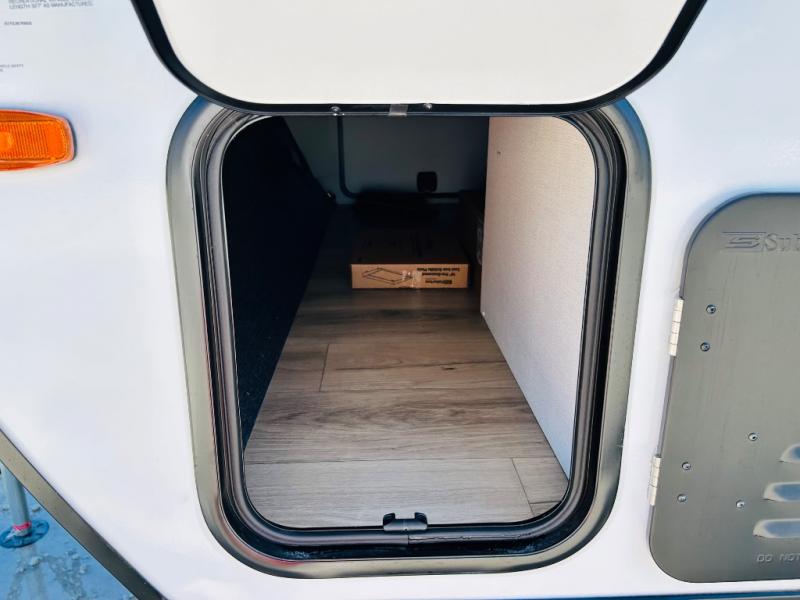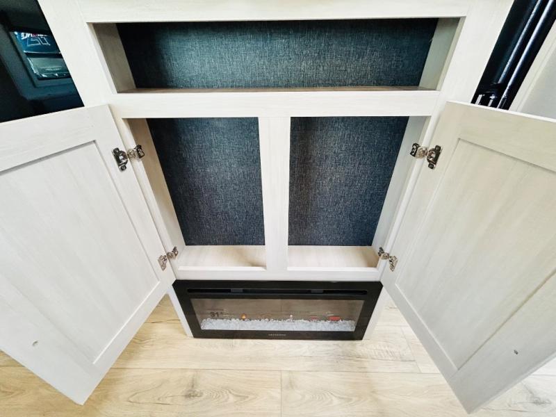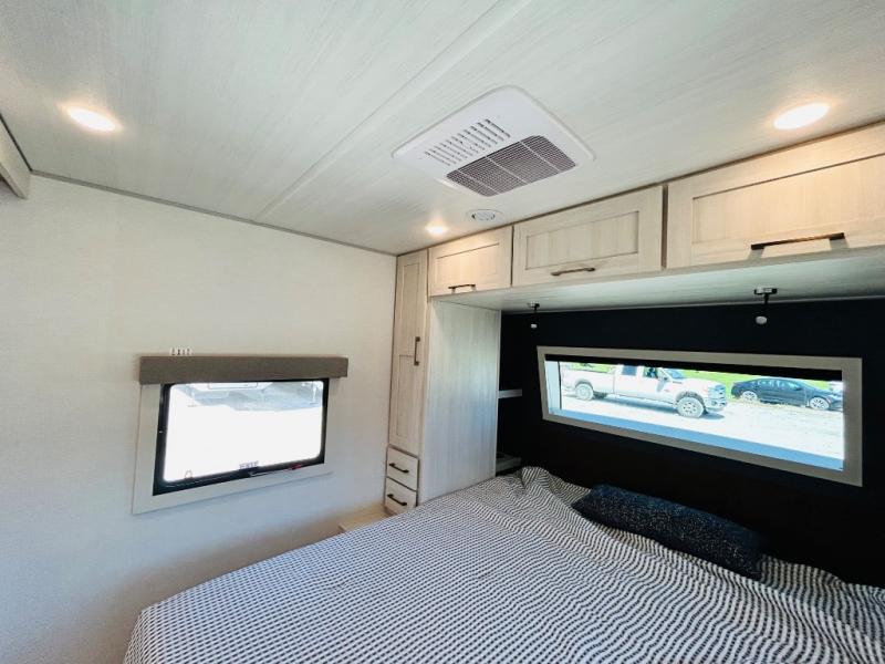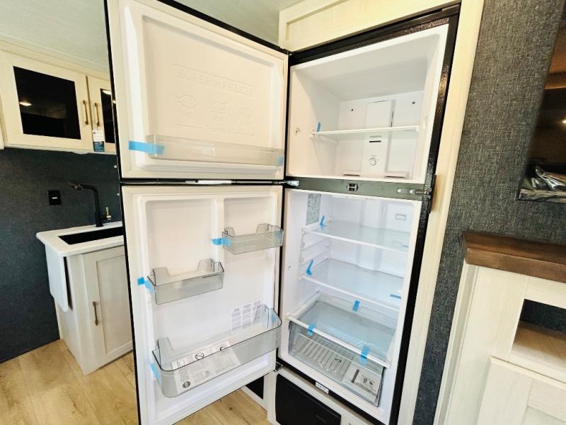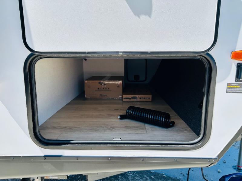No need to rough it when you camp; this trailer offers amenities that allow you to "Glamp" if you want! The rear spacious bathroom is tucked away behind a beautiful barn door, and inside features a shower, wardrobe, and linen storage. The front master bedroom offers privacy, a walk-around custom king bed, dual wardrobes and underbed storage, plus TV prep if you want the option to watch movies in bed. The L-shaped counter in the kitchen provides enough space to have everything at your fingertips while you cook, plus there is a countertop extension for more prep and serving space if needed. A nice walk-in pantry just inside the entry door will be perfect for chips and snacks or canned goods for those longer camping trips. If dining inside, the booth dinette with pull-out dinette drawers will be comfortable plus you will enjoy the view provided by the panoramic windows within the slide out. An outside kitchen will be a favorite for anyone that cooks, and the 19' awning will provide some protection and offering an outdoor living area to enjoy with everyone.