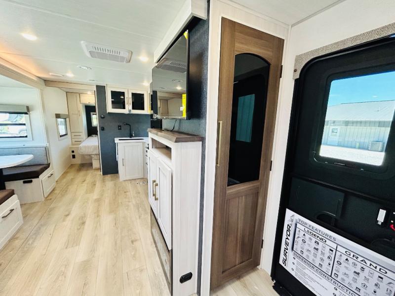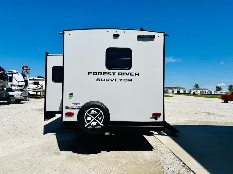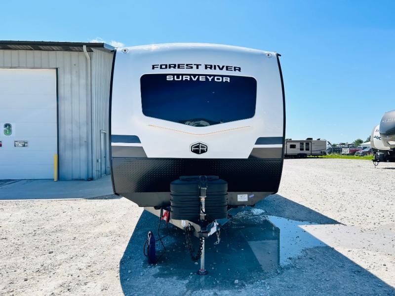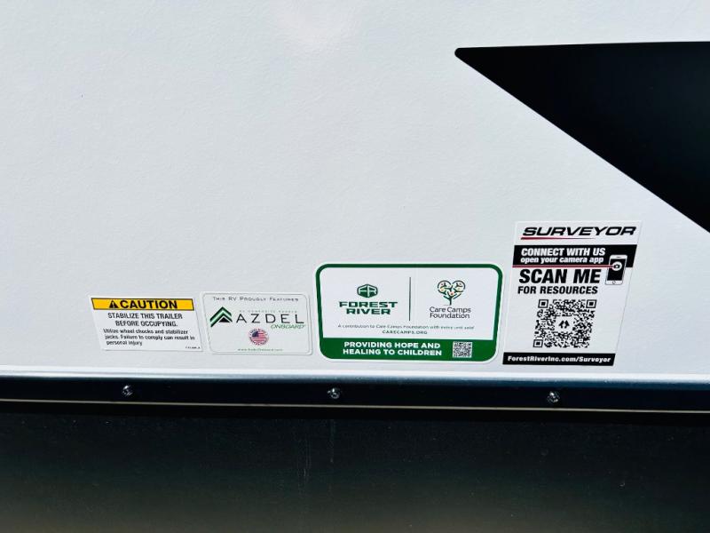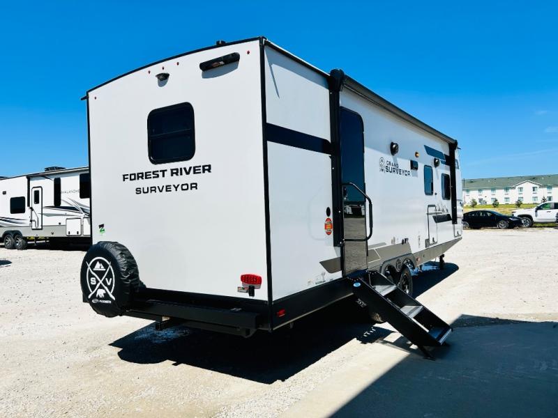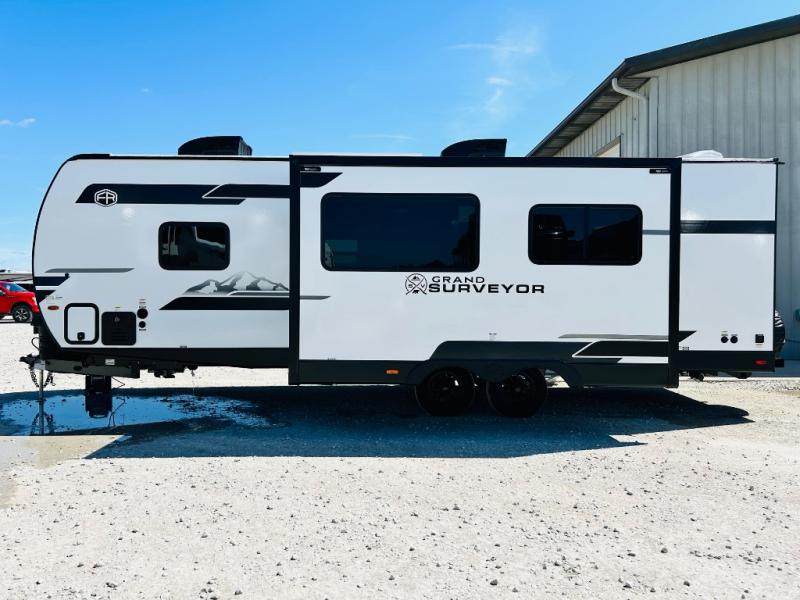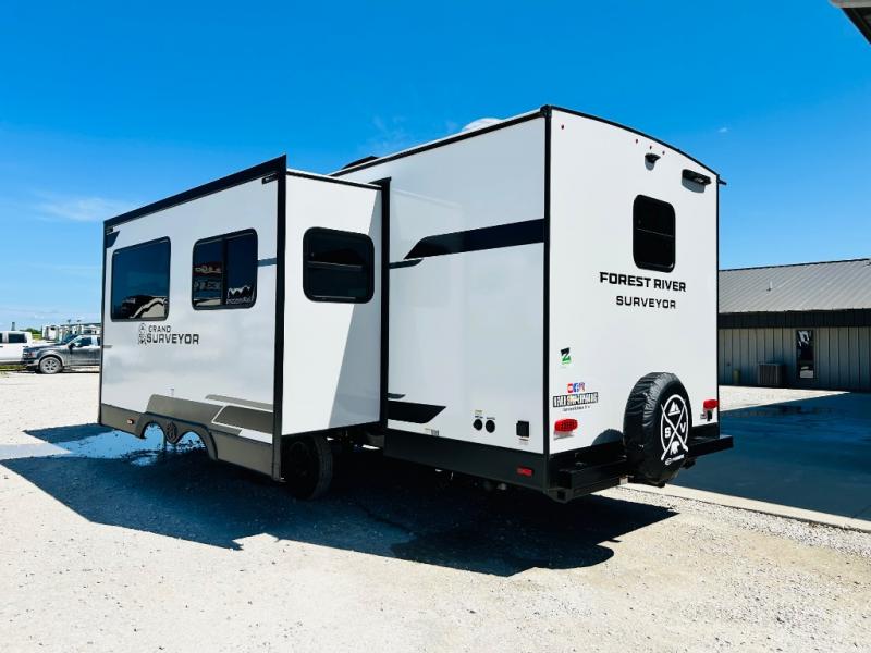 With any Grand Surveyor travel trailer by Forest River you will enjoy turn-key ready-to-go features and quality construction! Each model includes Azdel composite walls and a gel coated fiberglass front cap with an automotive style tinted windshield for a sleek look. There are friction hinge black glass entry door(s), an adjustable platform step with a night light, plus Goodyear tires and a power tongue jack for easy towing. The interior will have you feeling right at home with roller shades, residential faucets, sinks, and bathroom vanity, plus Surf(x) seamless countertops throughout. You can also plan for adventure with a 2" rear accessory and exterior spray port, and there are slam latch exterior baggage doors throughout to keep all your gear secure. Other stand-out features include a central vacuum system, a 200 watt solar panel with a 30 amp controller, a tankless water heater, carpet-free interiors, and the list goes on!