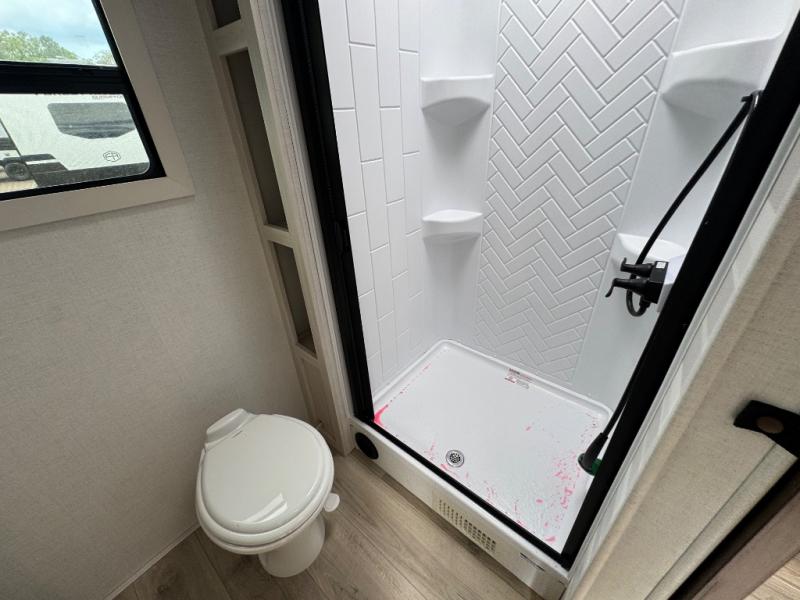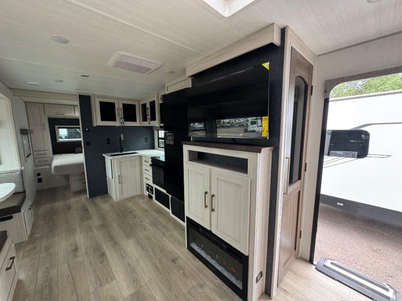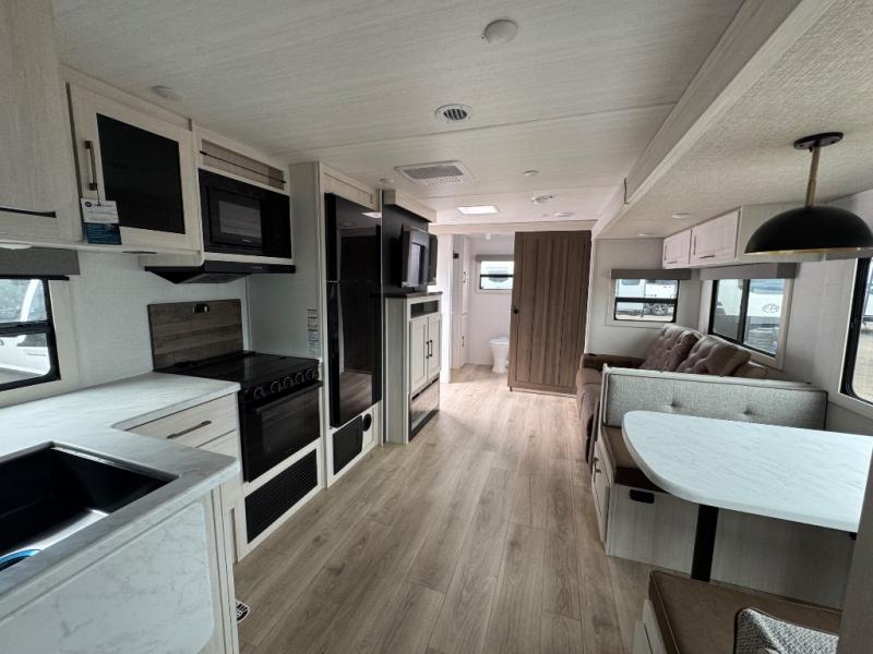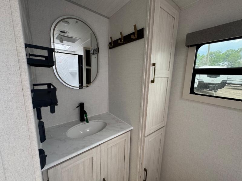 No need to rough it when you camp; this trailer offers amenities that allow you to "Glamp" if you want! The rear spacious bathroom is tucked away behind a beautiful barn door, and inside features a shower, wardrobe, and linen storage. The front master bedroom offers privacy, a walk-around custom king bed, dual wardrobes and underbed storage, plus TV prep if you want the option to watch movies in bed. The L-shaped counter in the kitchen provides enough space to have everything at your fingertips while you cook, plus there is a countertop extension for more prep and serving space if needed. A nice walk-in pantry just inside the entry door will be perfect for chips and snacks or canned goods for those longer camping trips. If dining inside, the booth dinette with pull-out dinette drawers will be comfortable plus you will enjoy the view provided by the panoramic windows within the slide out. An outside kitchen will be a favorite for anyone that cooks, and the 19' awning will provide some protection from the elements and offering an outdoor living area to enjoy with everyone.