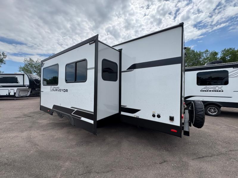With any Grand Surveyor travel trailer by Forest River you will enjoy turn-key ready-to-go features and quality construction! Each model includes Azdel composite walls and a gel coated fiberglass front cap with an automotive style tinted windshield for a sleek look. There are friction hinge black glass entry door(s), an adjustable platform step with a night light, plus Goodyear tires and a power tongue jack for easy towing. The interior will have you feeling right at home with roller shades, residential faucets, sinks, and bathroom vanity, plus Surf(x) seamless countertops throughout. You can also plan for adventure with a 2" rear accessory and exterior spray port, and there are slam latch exterior baggage doors throughout to keep all your gear secure. Other stand-out features include a central vacuum system, a 200 watt solar panel with a 30 amp controller, a tankless water heater, carpet-free interiors, and the list goes on!