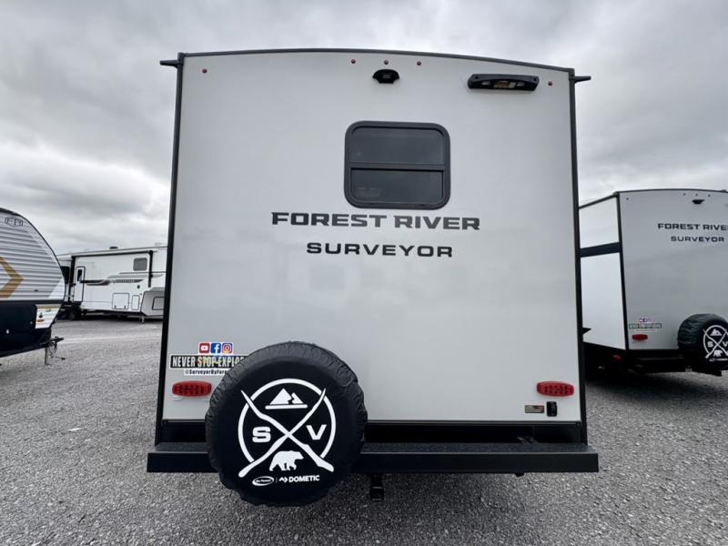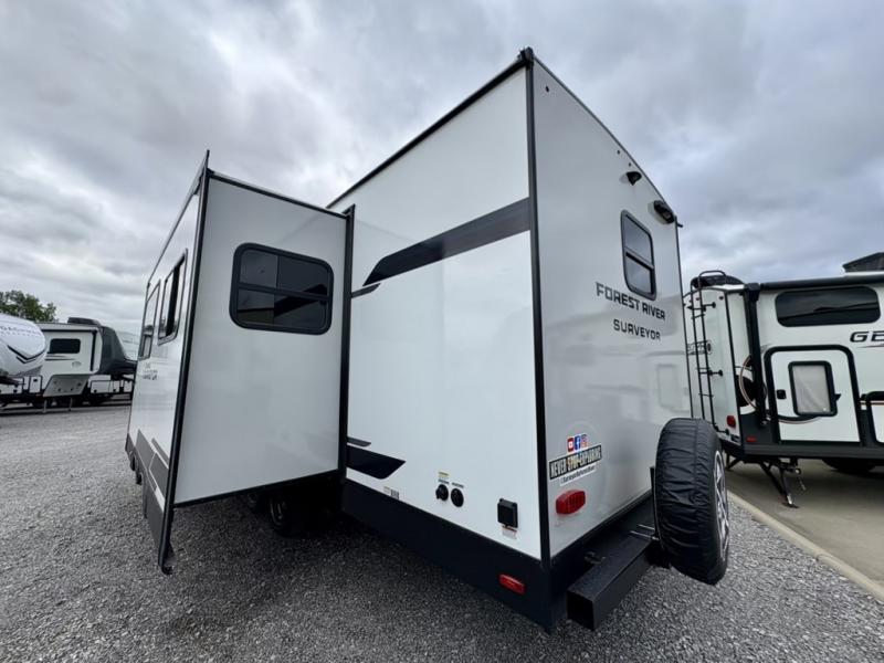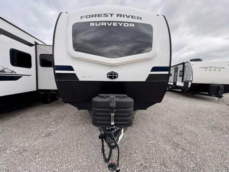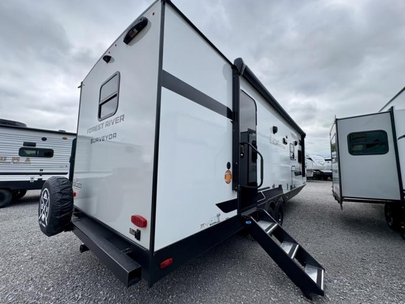 With any Grand Surveyor travel trailer by Forest River you will enjoy turn-key ready-to-go features and quality construction! Each model includes Azdel composite walls and a gel coated fiberglass front cap with an automotive style tinted windshield for a sleek look. There are friction hinge black glass entry door(s), an adjustable platform step with a night light, plus Goodyear tires and a power tongue jack for easy towing. The interior will have you feeling right at home with roller shades, residential faucets, sinks, and bathroom vanity, plus Surf(x) seamless countertops throughout. You can also plan for adventure with a 2" rear accessory and exterior spray port, and there are slam latch exterior baggage doors throughout to keep all your gear secure. Other stand-out features include a central vacuum system, a 200 watt solar panel with a 30 amp controller, a tankless water heater, carpet-free interiors, and the list goes on!