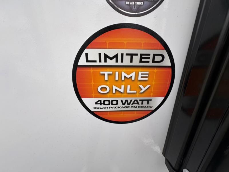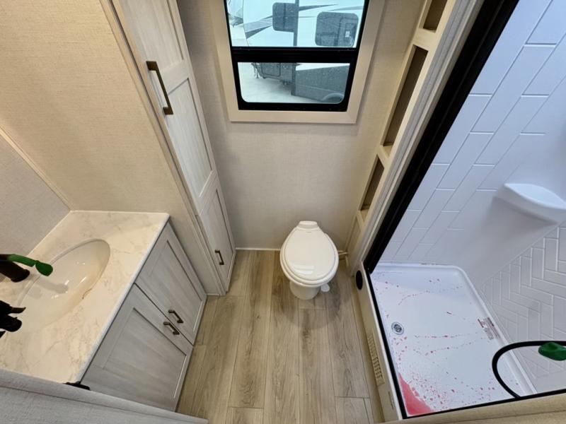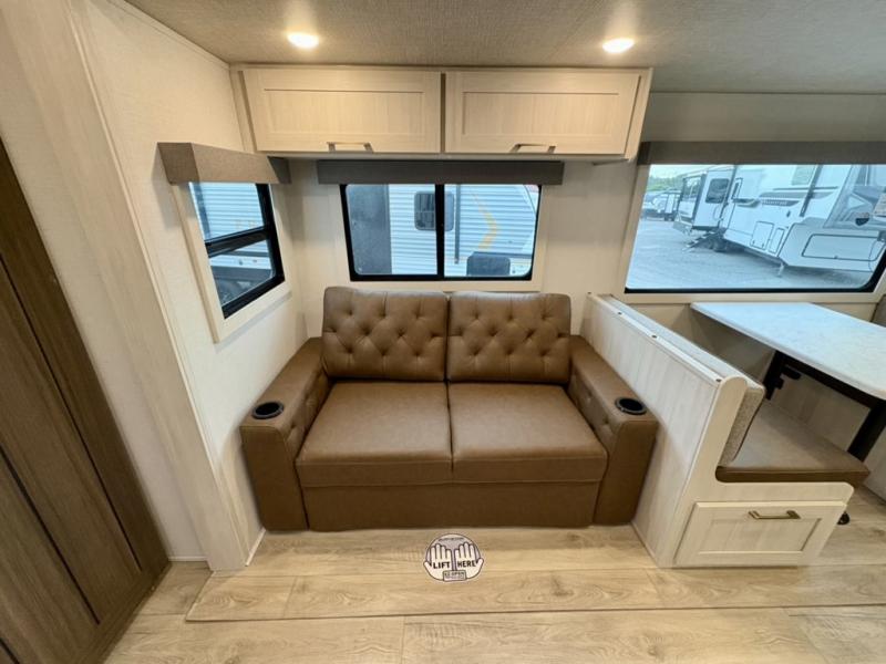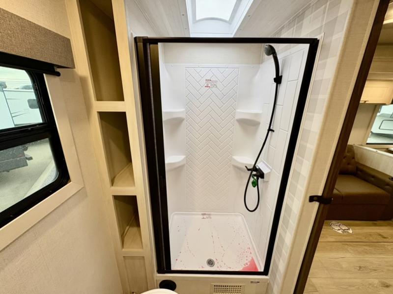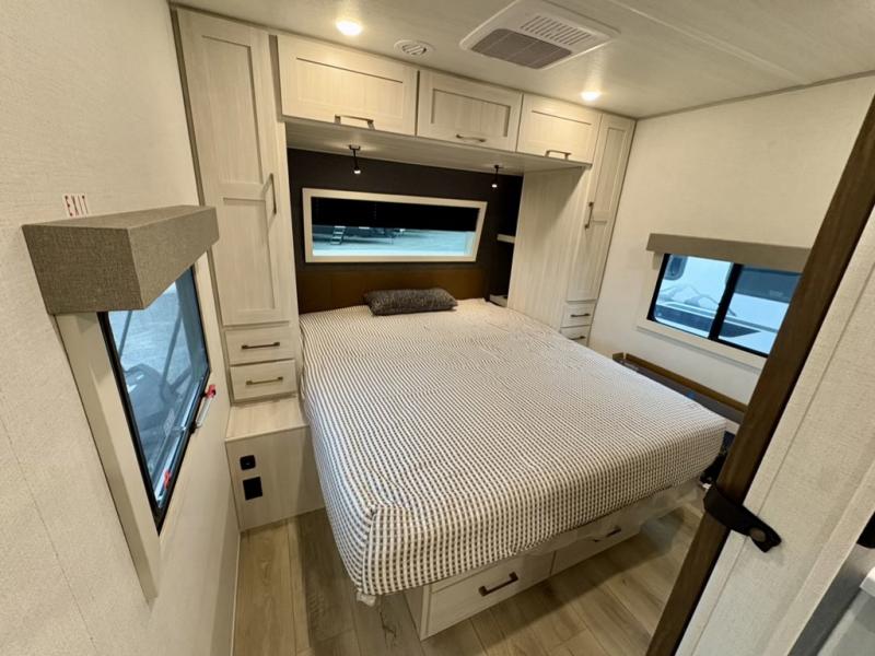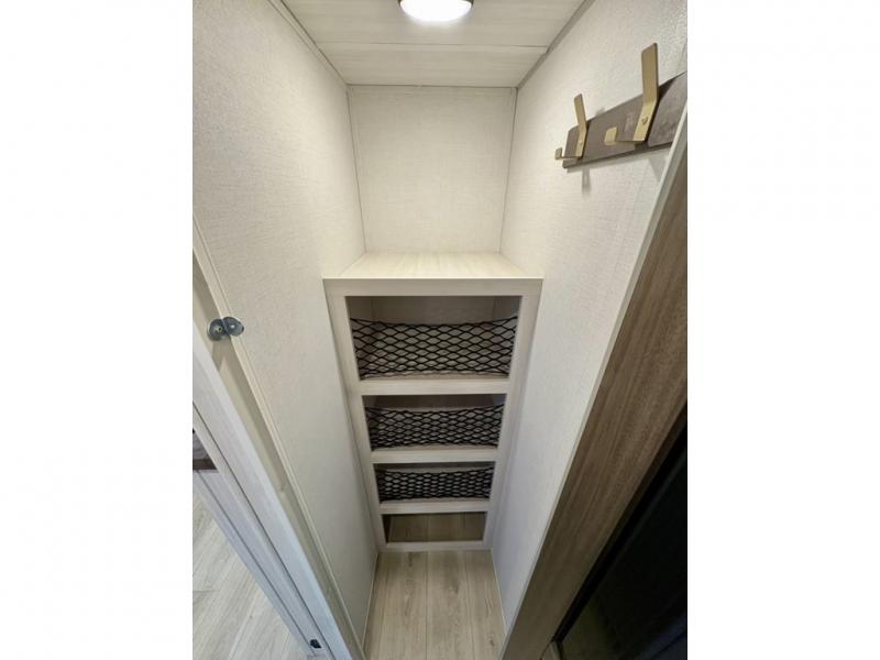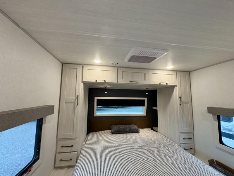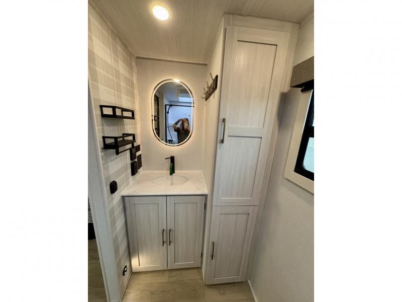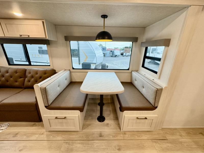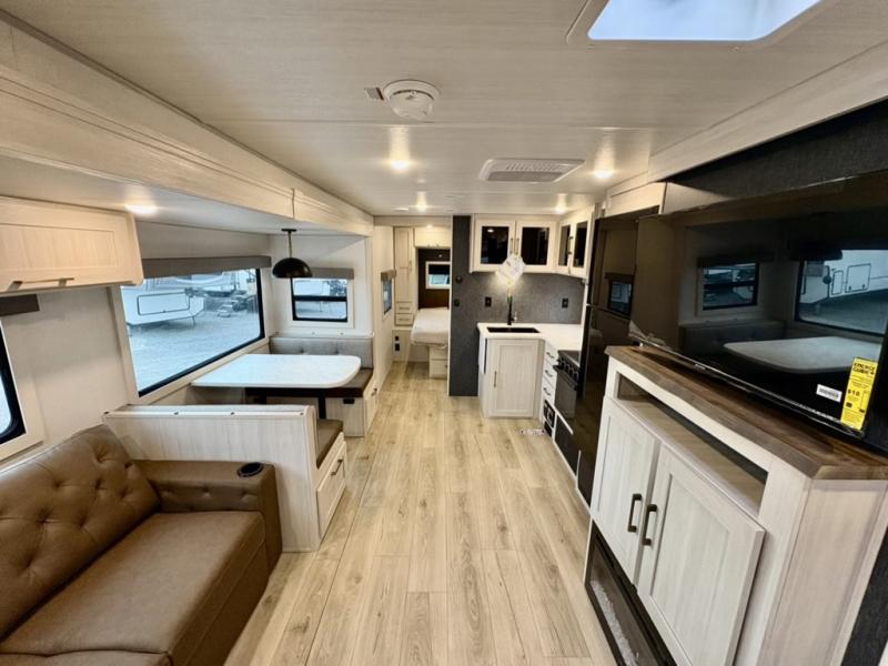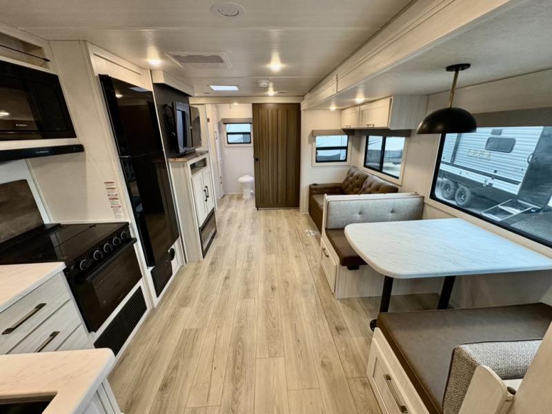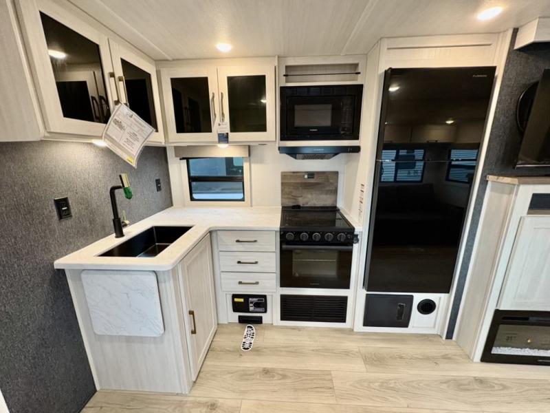 No need to rough it when you camp; this trailer offers amenities that allow you to "Glamp" if you want! The rear spacious bathroom is tucked away behind a beautiful barn door, and inside features a shower, wardrobe, and linen storage. The front master bedroom offers privacy, a walk-around custom king bed, dual wardrobes and underbed storage, plus TV prep if you want the option to watch movies in bed. The L-shaped counter in the kitchen provides enough space to have everything at your fingertips while you cook, plus there is a countertop extension for more prep and serving space if needed. A nice walk-in pantry just inside the entry door will be perfect for chips and snacks or canned goods for those longer camping trips. If dining inside, the booth dinette with pull-out dinette drawers will be comfortable plus you will enjoy the view provided by the panoramic windows within the slide out. An outside kitchen will be a favorite for anyone that cooks, and the 19' awning will provide some protection from the elements and offering an outdoor living area to enjoy with everyone.