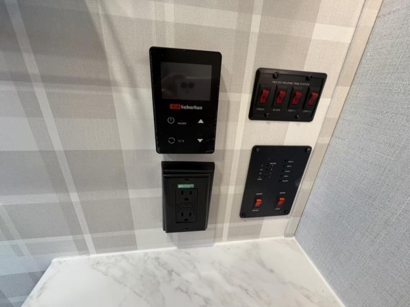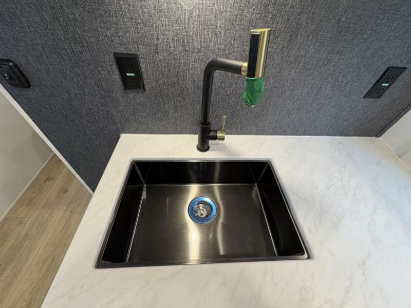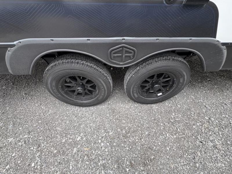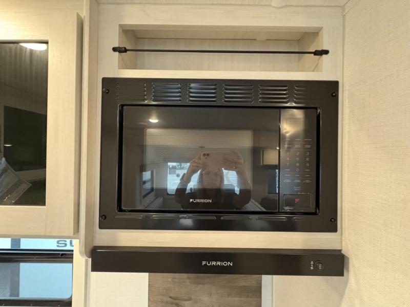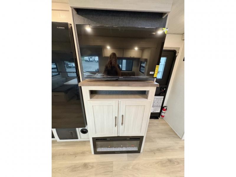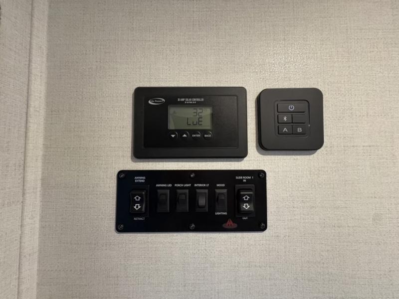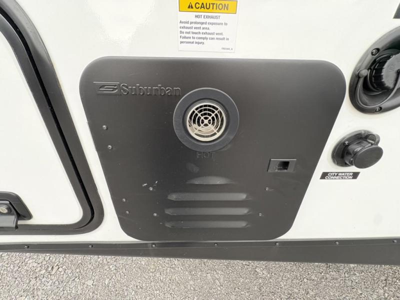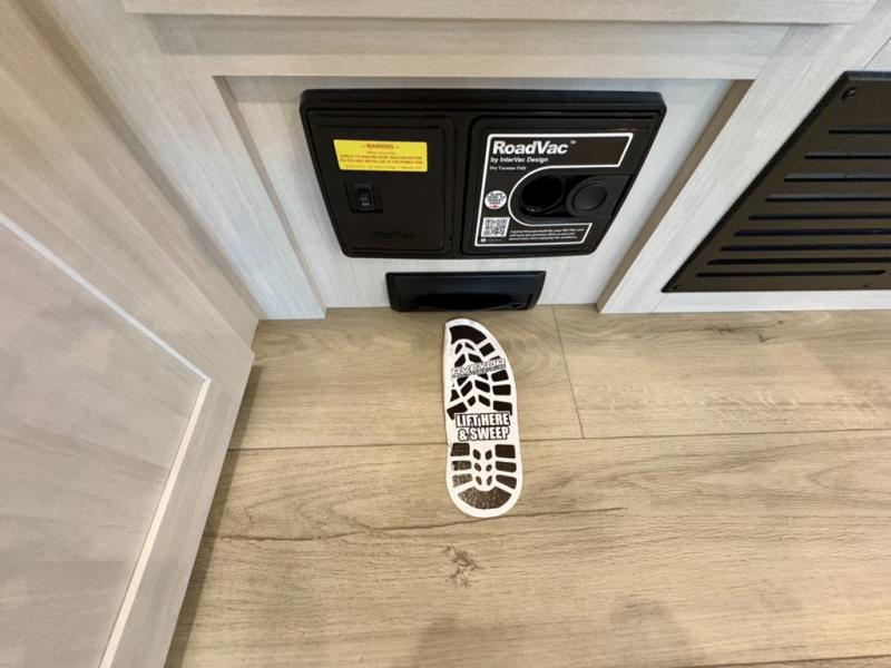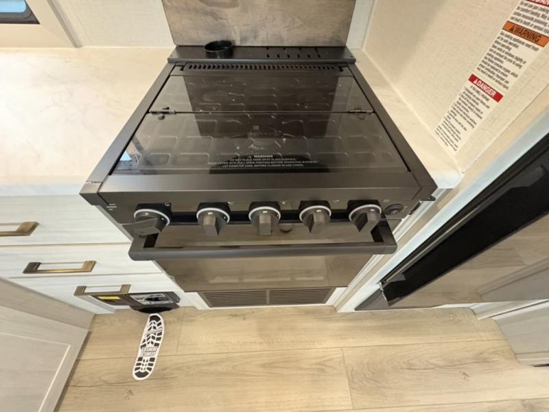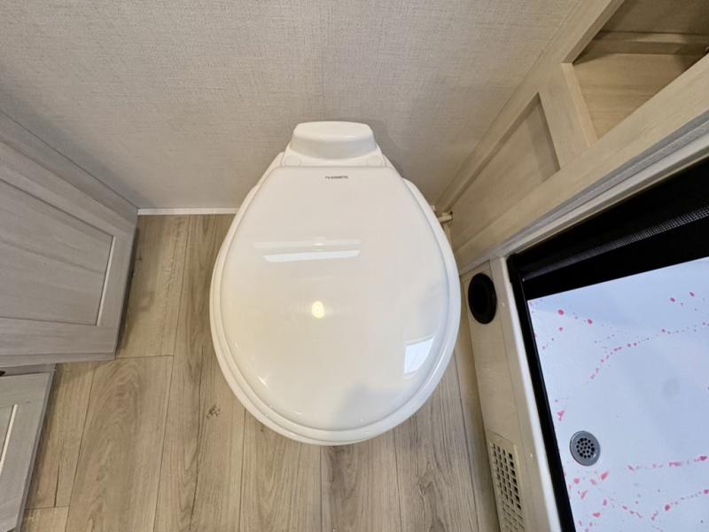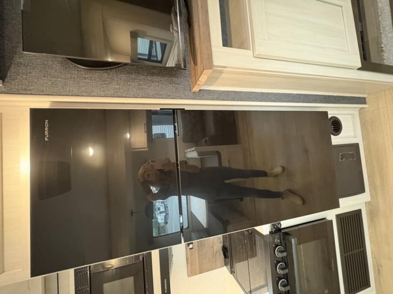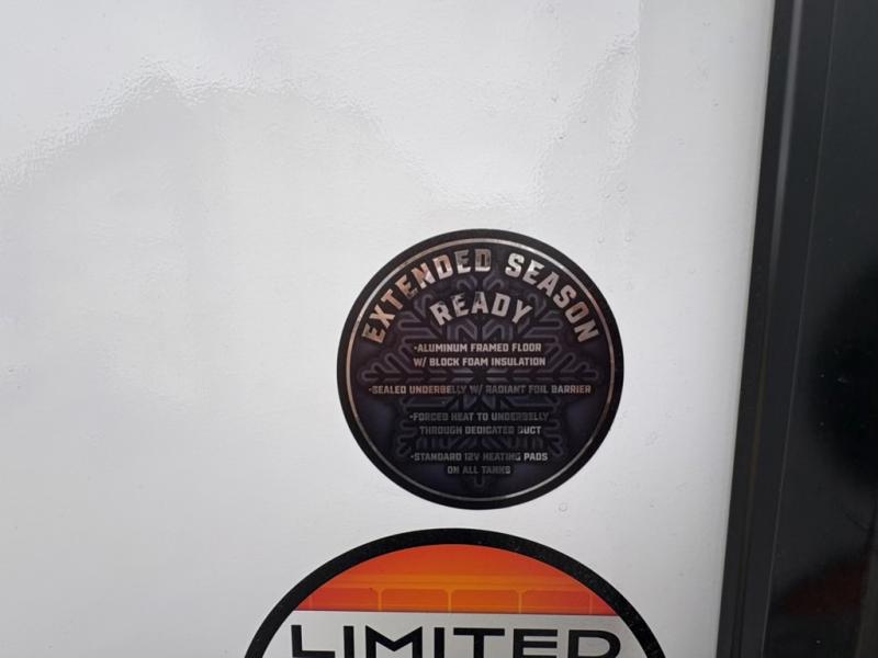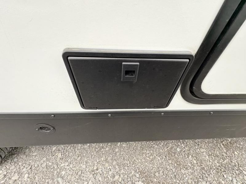 No need to rough it when you camp; this trailer offers amenities that allow you to "Glamp" if you want! The rear spacious bathroom is tucked away behind a beautiful barn door, and inside features a shower, wardrobe, and linen storage. The front master bedroom offers privacy, a walk-around custom king bed, dual wardrobes and underbed storage, plus TV prep if you want the option to watch movies in bed. The L-shaped counter in the kitchen provides enough space to have everything at your fingertips while you cook, plus there is a countertop extension for more prep and serving space if needed. A nice walk-in pantry just inside the entry door will be perfect for chips and snacks or canned goods for those longer camping trips. If dining inside, the booth dinette with pull-out dinette drawers will be comfortable plus you will enjoy the view provided by the panoramic windows within the slide out. An outside kitchen will be a favorite for anyone that cooks, and the 19' awning will provide some protection from the elements and offering an outdoor living area to enjoy with everyone.