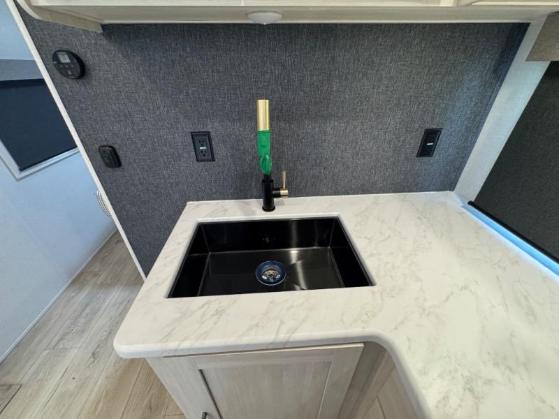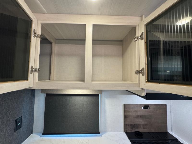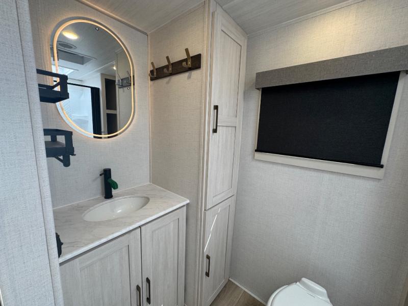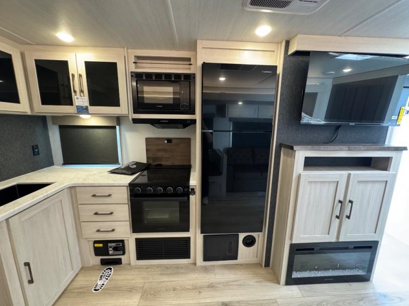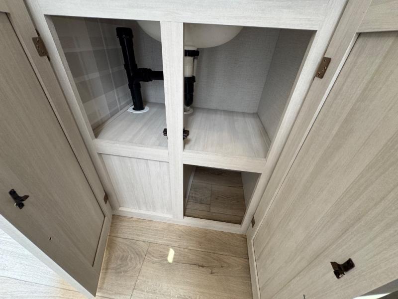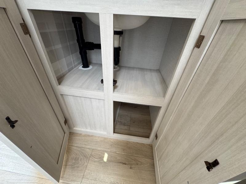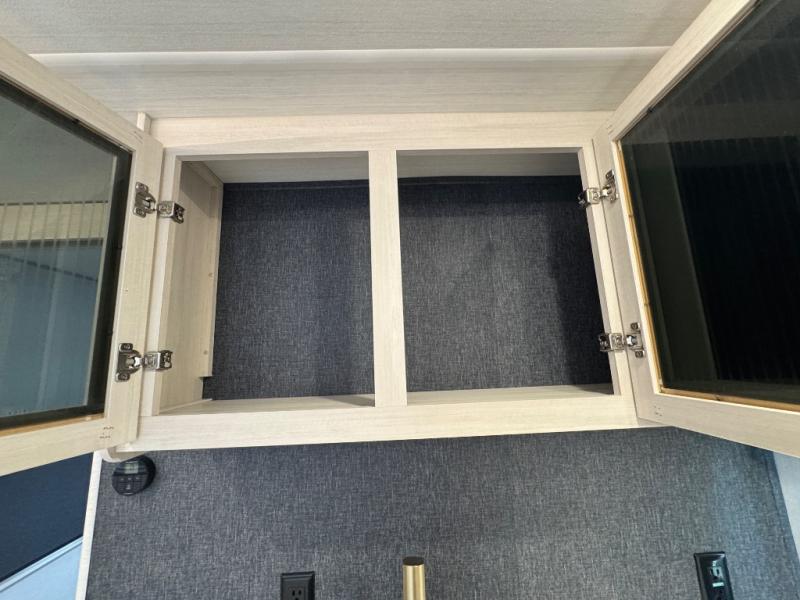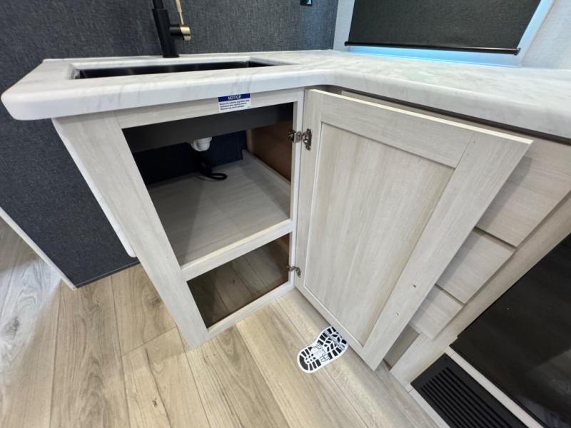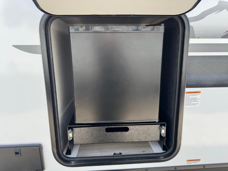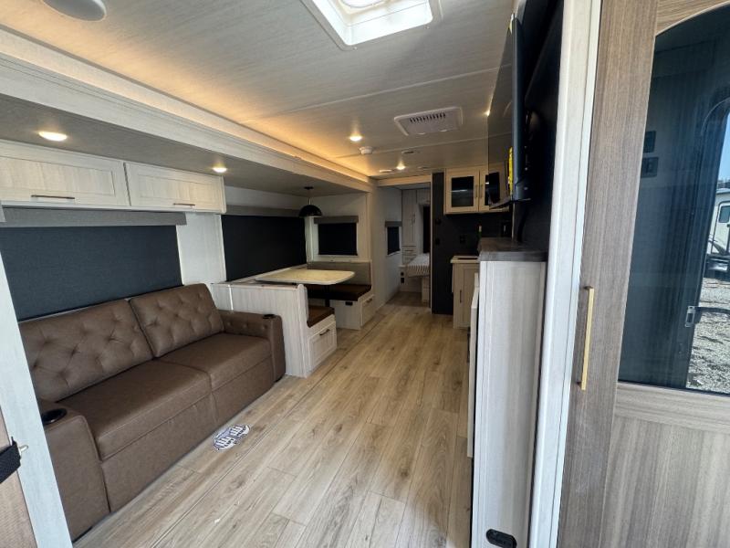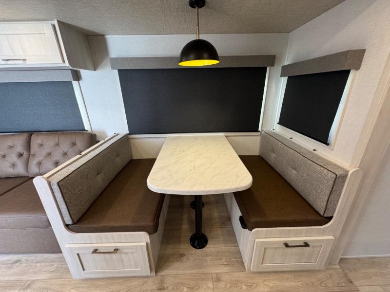 No need to rough it when you camp; this trailer offers amenities that allow you to "Glamp" if you want! The rear spacious bathroom is tucked away behind a beautiful barn door, and inside features a shower, wardrobe, and linen storage. The front master bedroom offers privacy, a walk-around custom king bed, dual wardrobes and underbed storage, plus TV prep if you want the option to watch movies in bed. The L-shaped counter in the kitchen provides enough space to have everything at your fingertips while you cook, plus there is a countertop extension for more prep and serving space if needed. A nice walk-in pantry just inside the entry door will be perfect for chips and snacks or canned goods for those longer camping trips. If dining inside, the booth dinette with pull-out dinette drawers will be comfortable plus you will enjoy the view provided by the panoramic windows within the slide out. An outside kitchen will be a favorite for anyone that cooks, and the 19' awning will provide some protection and offering an outdoor living area to enjoy with everyone.