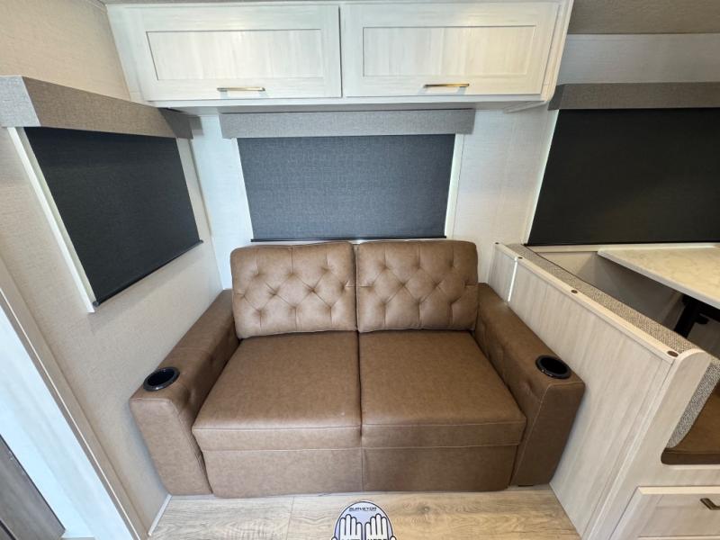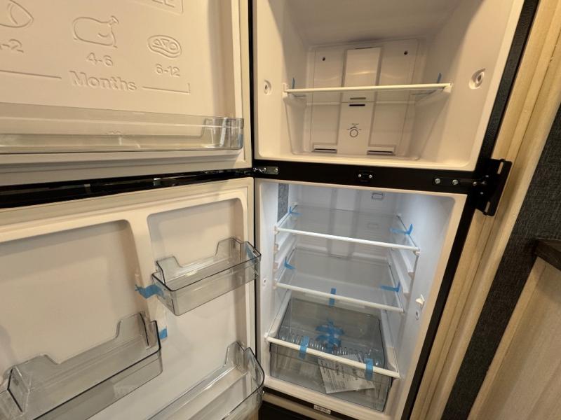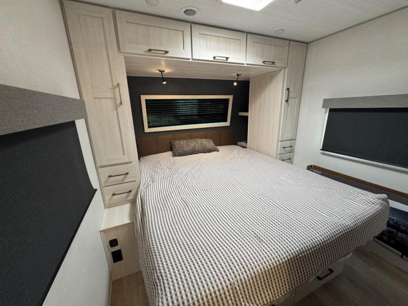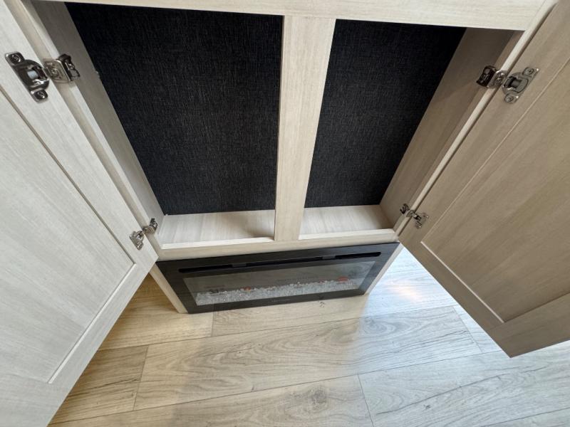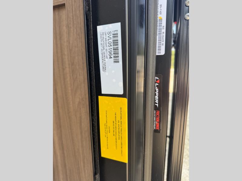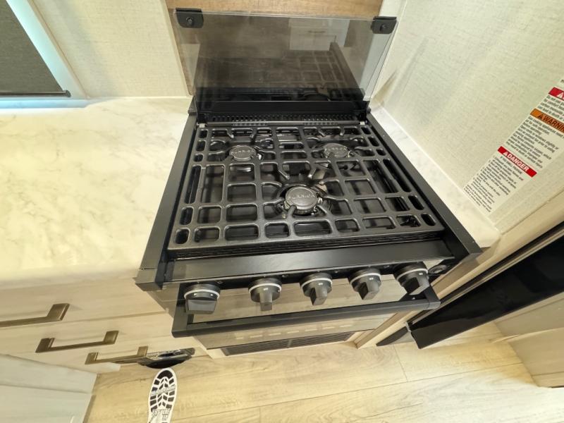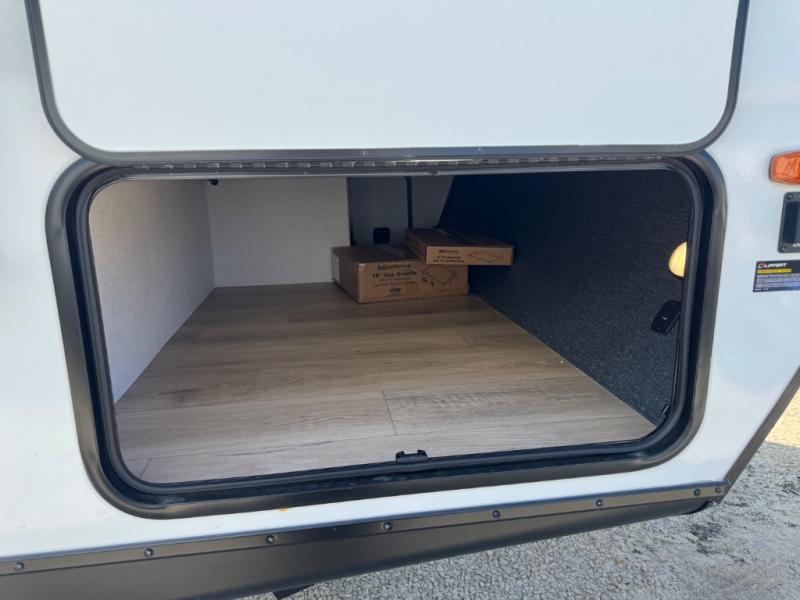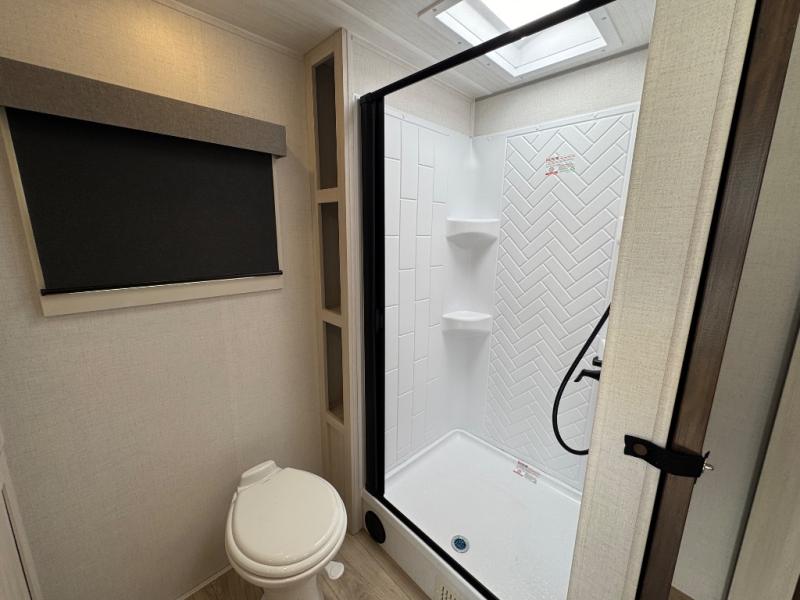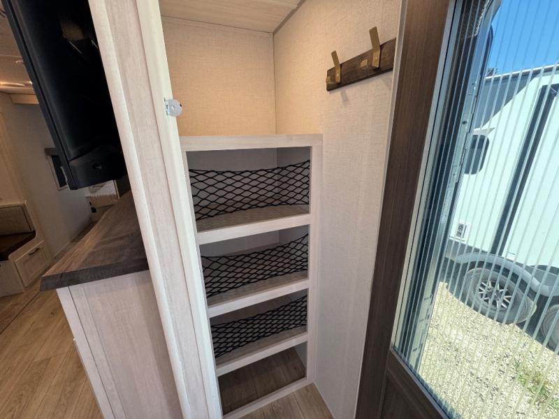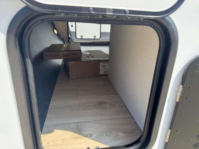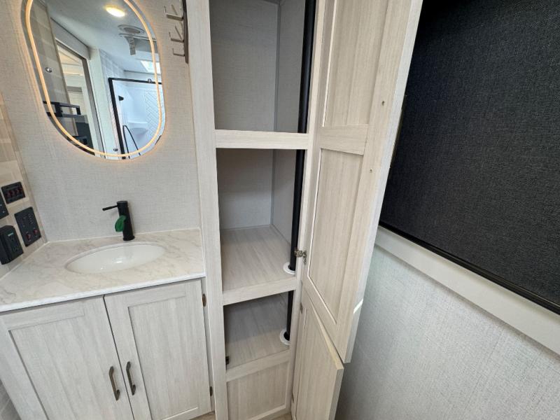 No need to rough it when you camp; this trailer offers amenities that allow you to "Glamp" if you want! The rear spacious bathroom is tucked away behind a beautiful barn door, and inside features a shower, wardrobe, and linen storage. The front master bedroom offers privacy, a walk-around custom king bed, dual wardrobes and underbed storage, plus TV prep if you want the option to watch movies in bed. The L-shaped counter in the kitchen provides enough space to have everything at your fingertips while you cook, plus there is a countertop extension for more prep and serving space if needed. A nice walk-in pantry just inside the entry door will be perfect for chips and snacks or canned goods for those longer camping trips. If dining inside, the booth dinette with pull-out dinette drawers will be comfortable plus you will enjoy the view provided by the panoramic windows within the slide out. An outside kitchen will be a favorite for anyone that cooks, and the 19' awning will provide some protection and offering an outdoor living area to enjoy with everyone.