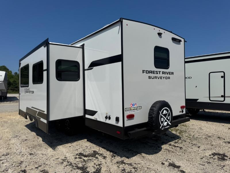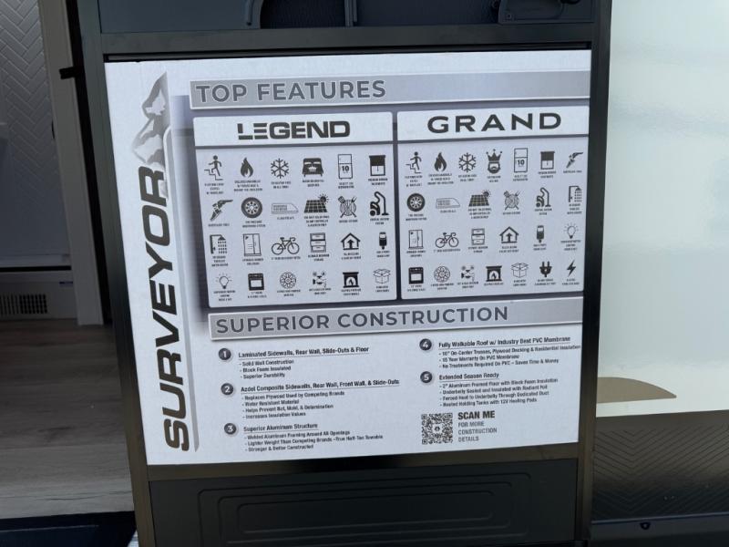 With any Grand Surveyor travel trailer by Forest River you will enjoy turn-key ready-to-go features and quality construction! Each model includes Azdel composite walls and a gel coated fiberglass front cap with an automotive style tinted windshield for a sleek look. There are friction hinge black glass entry door(s), an adjustable platform step with a night light, plus Goodyear tires and a power tongue jack for easy towing. The interior will have you feeling right at home with roller shades, residential faucets, sinks, and bathroom vanity, plus Surf(x) seamless countertops throughout. You can also plan for adventure with a 2" rear accessory and exterior spray port, and there are slam latch exterior baggage doors throughout to keep all your gear secure. Other stand-out features include a central vacuum system, a 200 watt solar panel with a 30 amp controller, a tankless water heater, carpet-free interiors, and the list goes on!