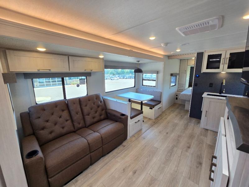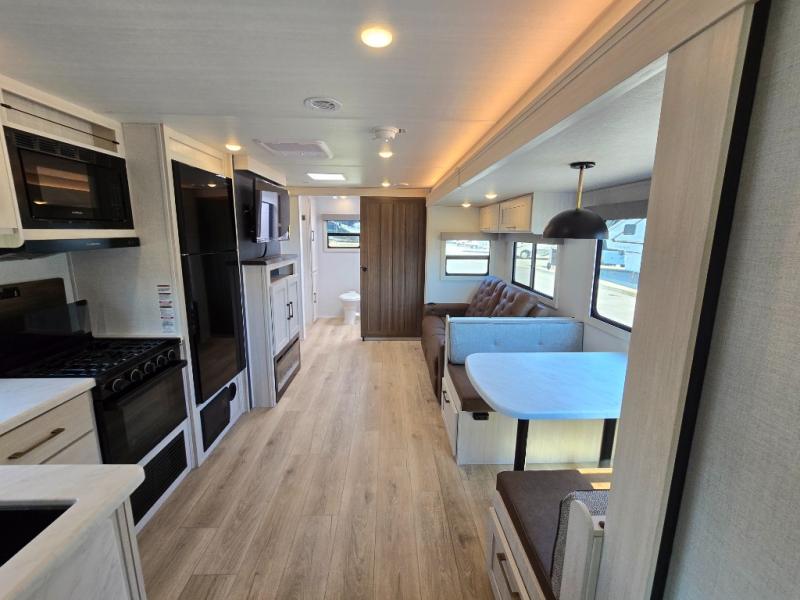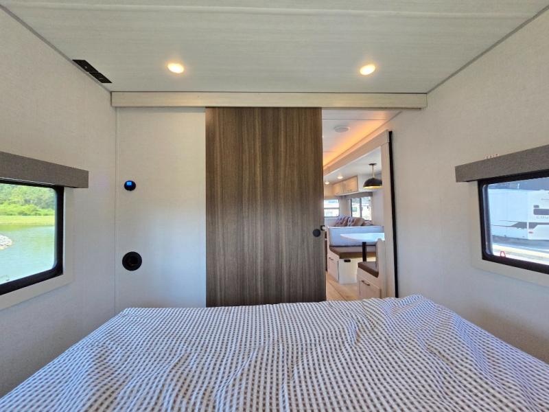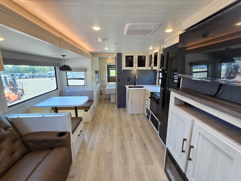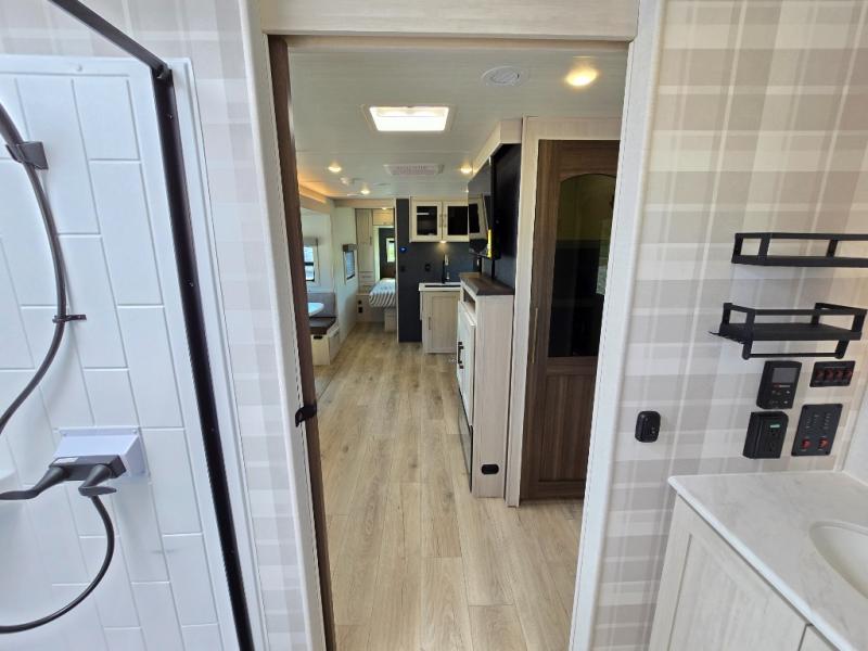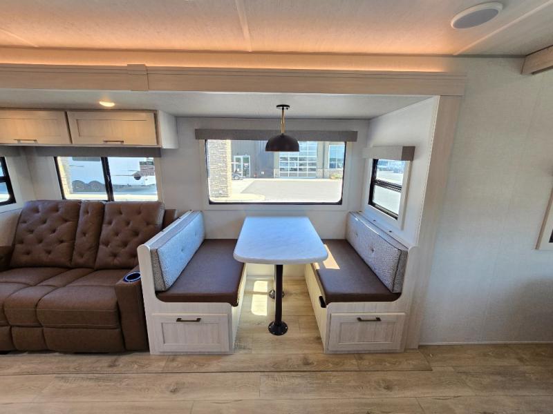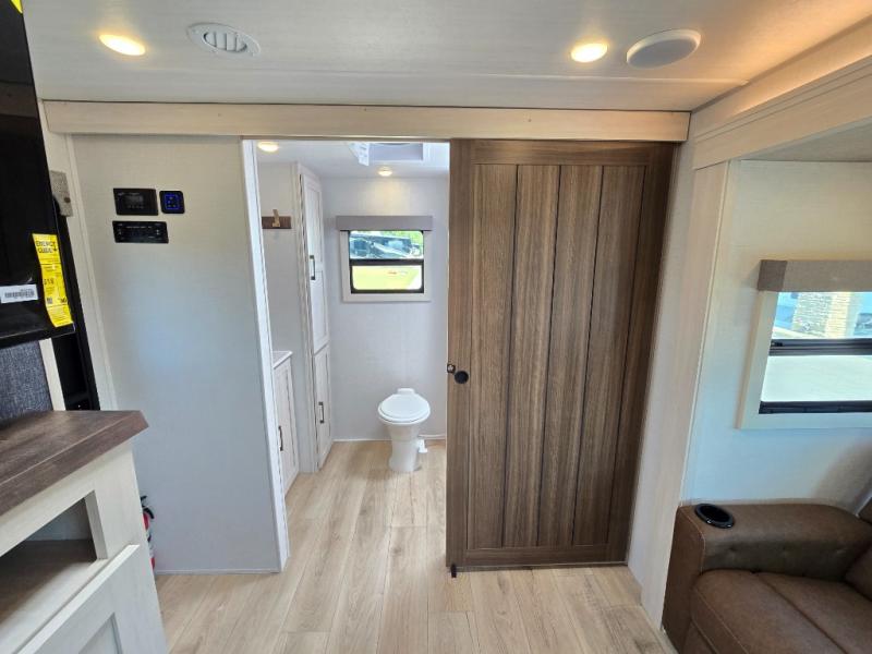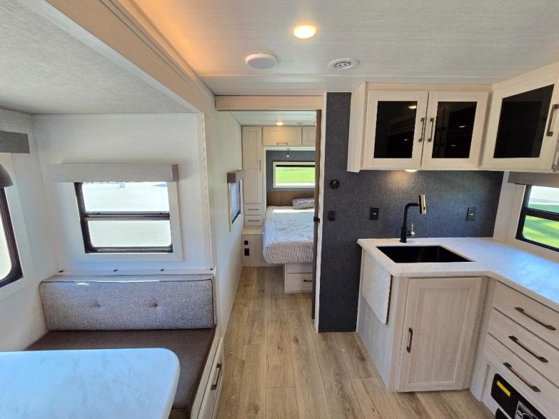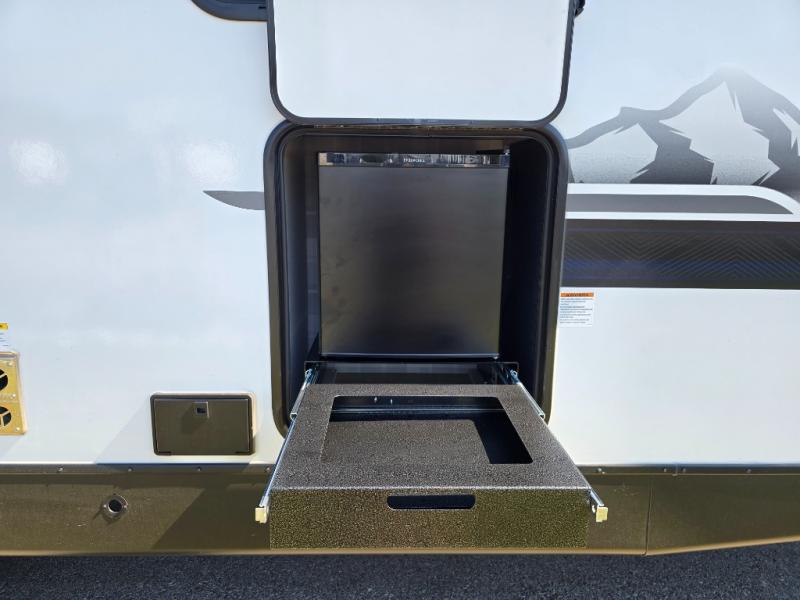 No need to rough it when you camp; this trailer offers amenities that allow you to "Glamp" if you want! The rear spacious bathroom is tucked away behind a beautiful barn door, and inside features a shower, wardrobe, and linen storage. The front master bedroom offers privacy, a walk-around custom king bed, dual wardrobes and underbed storage, plus TV prep if you want the option to watch movies in bed. The L-shaped counter in the kitchen provides enough space to have everything at your fingertips while you cook, plus there is a countertop extension for more prep and serving space if needed. A nice walk-in pantry just inside the entry door will be perfect for chips and snacks or canned goods for those longer camping trips. If dining inside, the booth dinette with pull-out dinette drawers will be comfortable plus you will enjoy the view provided by the panoramic windows within the slide out. An outside kitchen will be a favorite for anyone that cooks, and the 19' awning will provide some protection from the elements and offering an outdoor living area to enjoy with everyone.