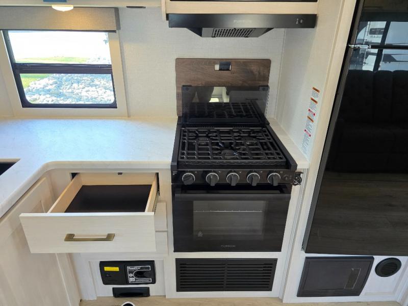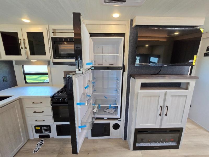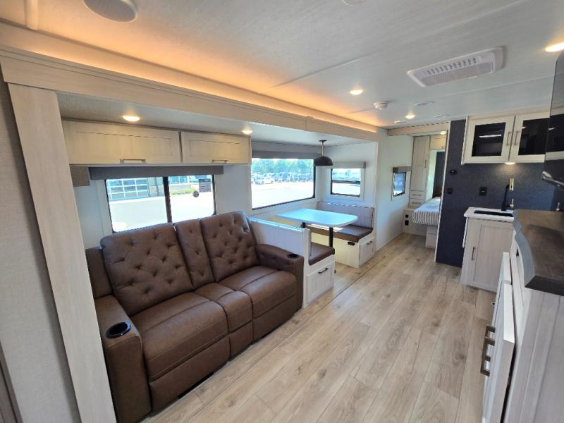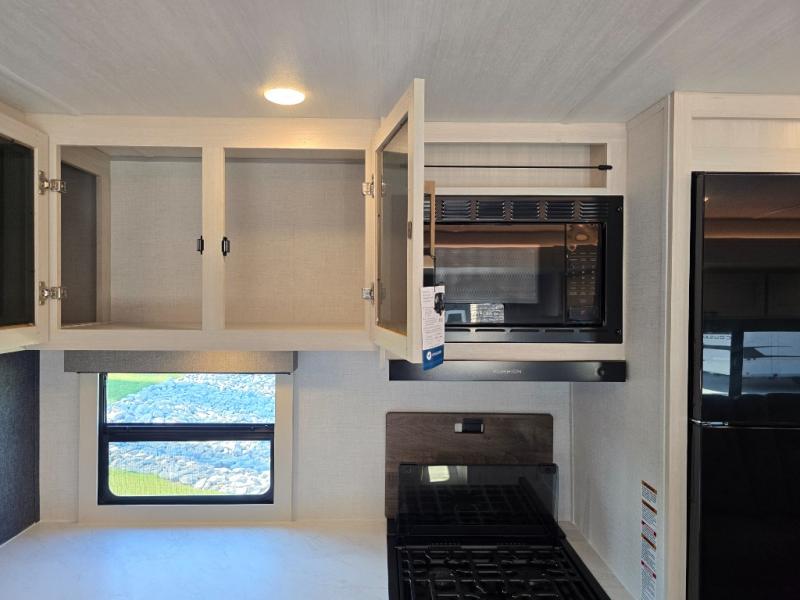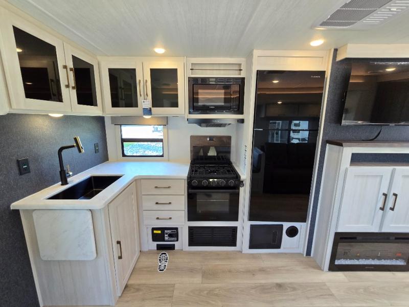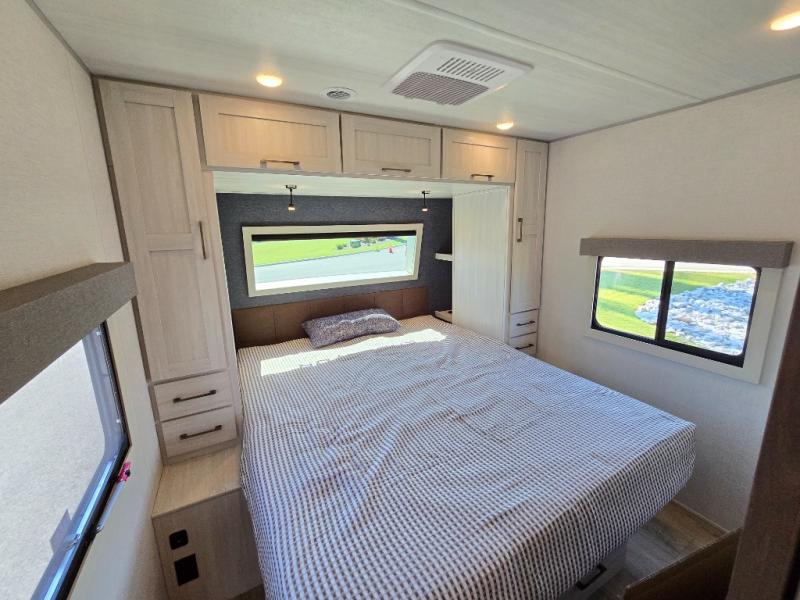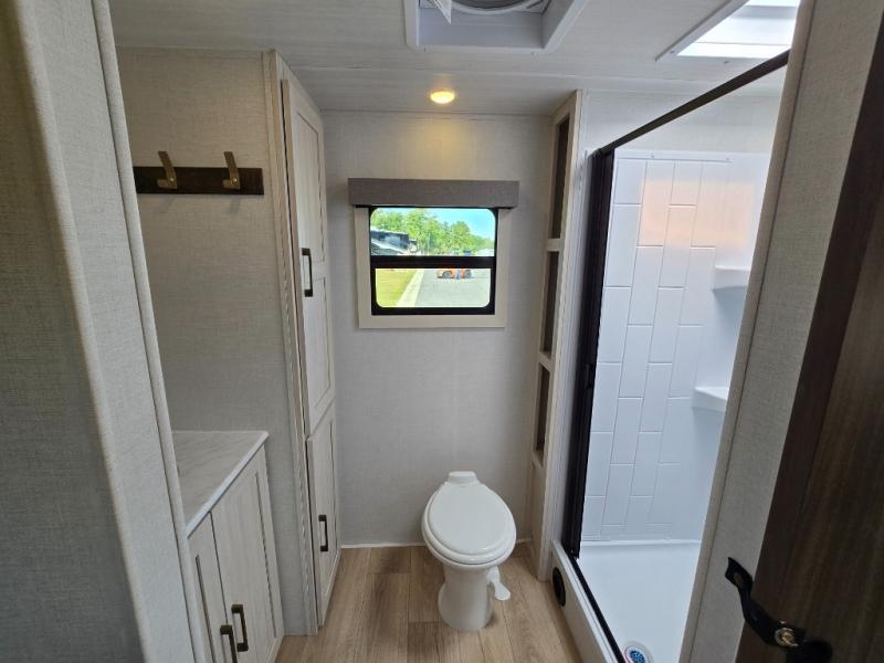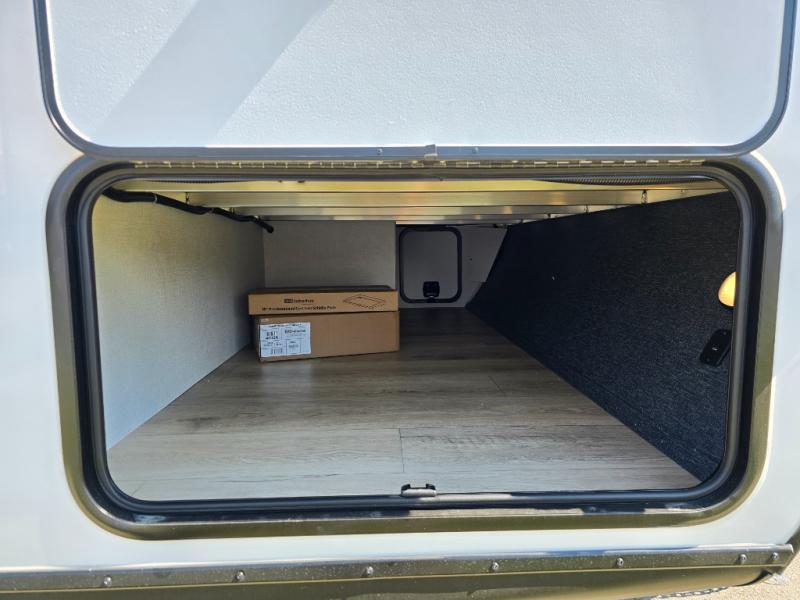 No need to rough it when you camp; this trailer offers amenities that allow you to "Glamp" if you want! The rear spacious bathroom is tucked away behind a beautiful barn door, and inside features a shower, wardrobe, and linen storage. The front master bedroom offers privacy, a walk-around custom king bed, dual wardrobes and underbed storage, plus TV prep if you want the option to watch movies in bed. The L-shaped counter in the kitchen provides enough space to have everything at your fingertips while you cook, plus there is a countertop extension for more prep and serving space if needed. A nice walk-in pantry just inside the entry door will be perfect for chips and snacks or canned goods for those longer camping trips. If dining inside, the booth dinette with pull-out dinette drawers will be comfortable plus you will enjoy the view provided by the panoramic windows within the slide out. An outside kitchen will be a favorite for anyone that cooks, and the 19' awning will provide some protection from the elements and offering an outdoor living area to enjoy with everyone.