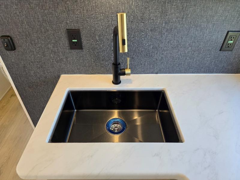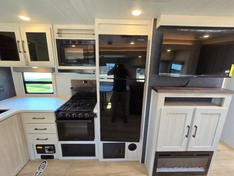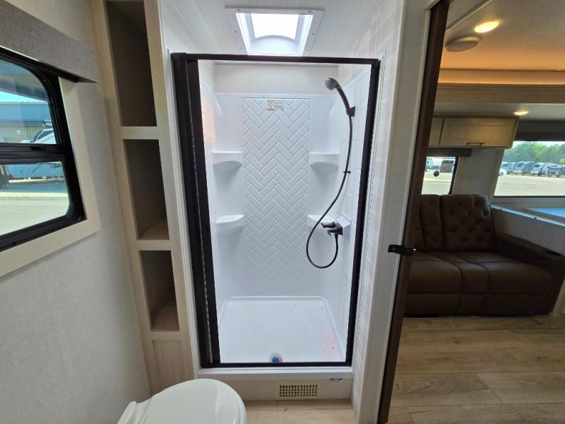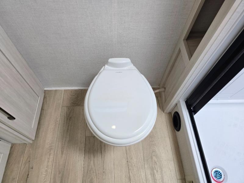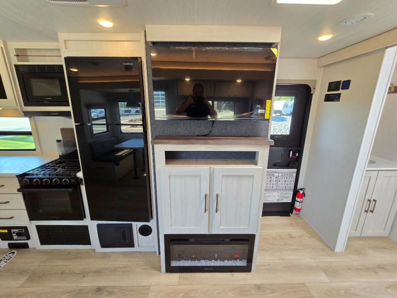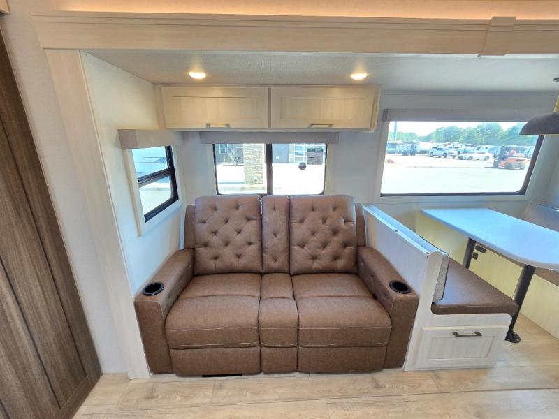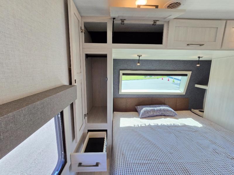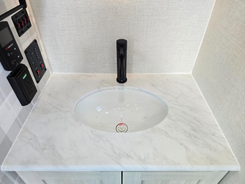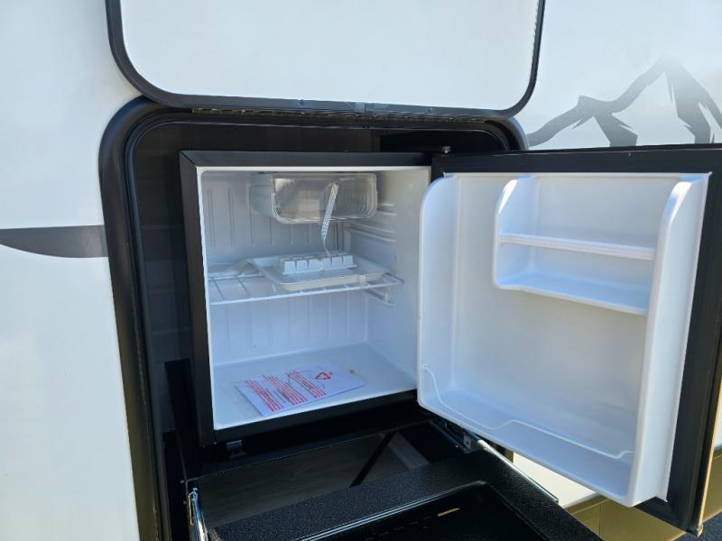 No need to rough it when you camp; this trailer offers amenities that allow you to "Glamp" if you want! The rear spacious bathroom is tucked away behind a beautiful barn door, and inside features a shower, wardrobe, and linen storage. The front master bedroom offers privacy, a walk-around custom king bed, dual wardrobes and underbed storage, plus TV prep if you want the option to watch movies in bed. The L-shaped counter in the kitchen provides enough space to have everything at your fingertips while you cook, plus there is a countertop extension for more prep and serving space if needed. A nice walk-in pantry just inside the entry door will be perfect for chips and snacks or canned goods for those longer camping trips. If dining inside, the booth dinette with pull-out dinette drawers will be comfortable plus you will enjoy the view provided by the panoramic windows within the slide out. An outside kitchen will be a favorite for anyone that cooks, and the 19' awning will provide some protection from the elements and offering an outdoor living area to enjoy with everyone.