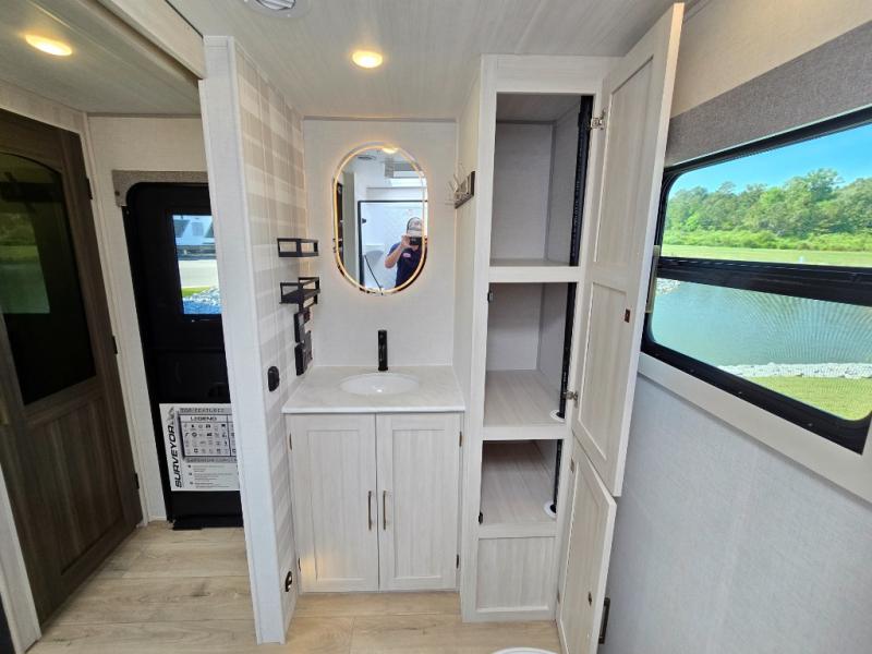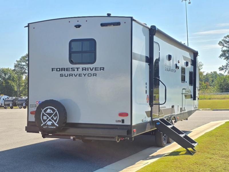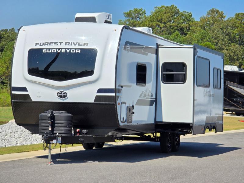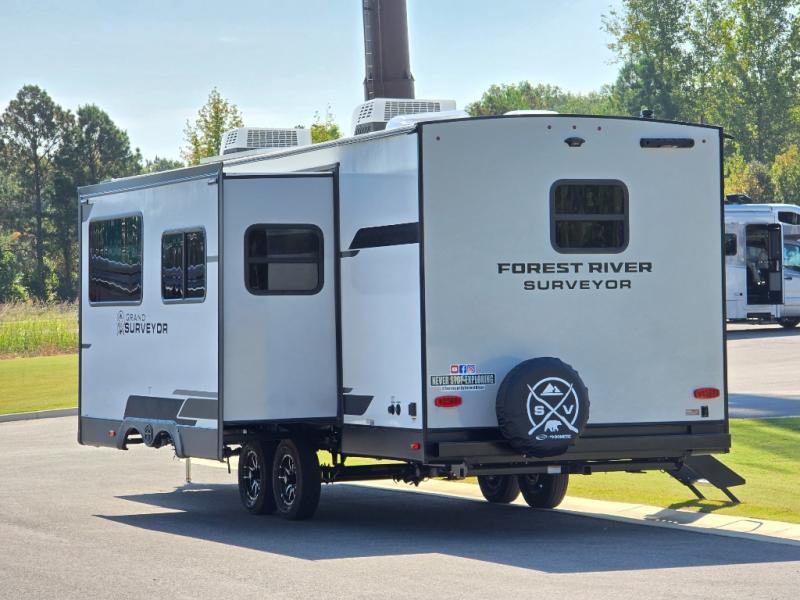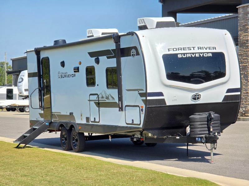 With any Grand Surveyor travel trailer by Forest River you will enjoy turn-key ready-to-go features and quality construction! Each model includes Azdel composite walls and a gel coated fiberglass front cap with an automotive style tinted windshield for a sleek look. There are friction hinge black glass entry door(s), an adjustable platform step with a night light, plus Goodyear tires and a power tongue jack for easy towing. The interior will have you feeling right at home with roller shades, residential faucets, sinks, and bathroom vanity, plus Surf(x) seamless countertops throughout. You can also plan for adventure with a 2" rear accessory and exterior spray port, and there are slam latch exterior baggage doors throughout to keep all your gear secure. Other stand-out features include a central vacuum system, a 200 watt solar panel with a 30 amp controller, a tankless water heater, carpet-free interiors, and the list goes on!