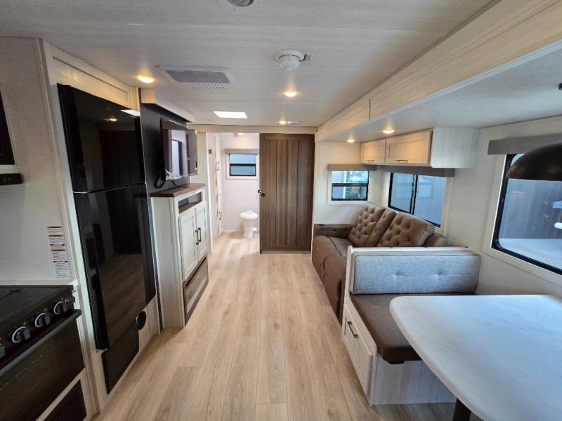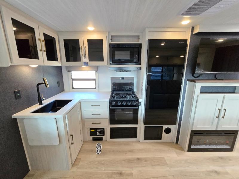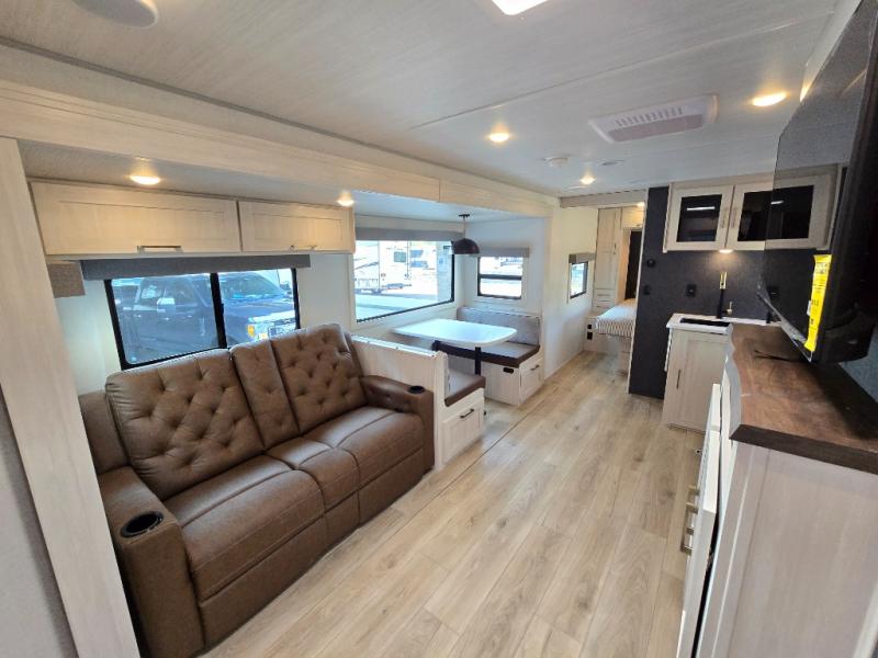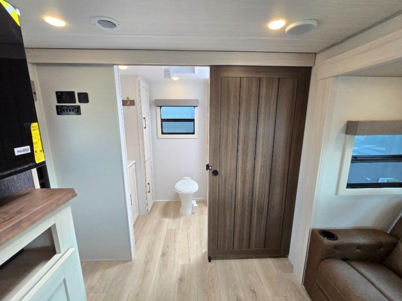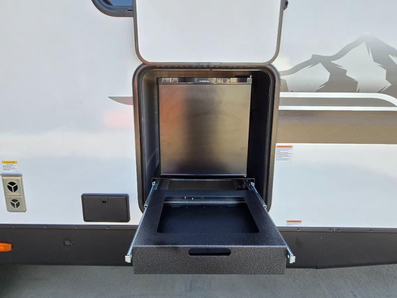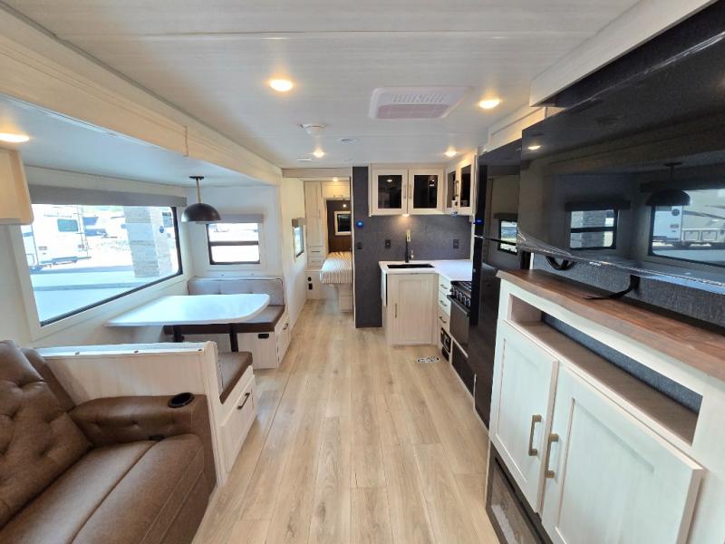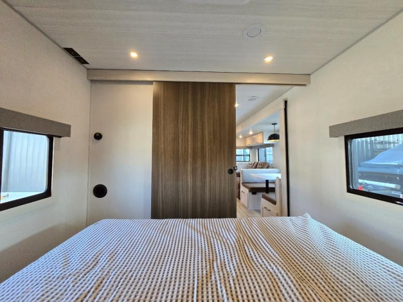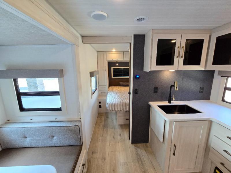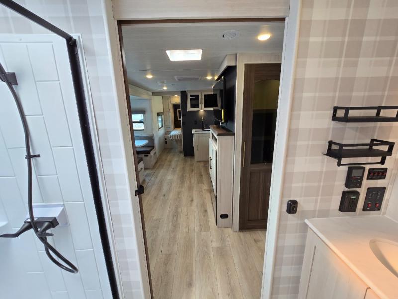 No need to rough it when you camp; this trailer offers amenities that allow you to "Glamp" if you want! The rear spacious bathroom is tucked away behind a beautiful barn door, and inside features a shower, wardrobe, and linen storage. The front master bedroom offers privacy, a walk-around custom king bed, dual wardrobes and underbed storage, plus TV prep if you want the option to watch movies in bed. The L-shaped counter in the kitchen provides enough space to have everything at your fingertips while you cook, plus there is a countertop extension for more prep and serving space if needed. A nice walk-in pantry just inside the entry door will be perfect for chips and snacks or canned goods for those longer camping trips. If dining inside, the booth dinette with pull-out dinette drawers will be comfortable plus you will enjoy the view provided by the panoramic windows within the slide out. An outside kitchen will be a favorite for anyone that cooks, and the 19' awning will provide some protection from the elements and offering an outdoor living area to enjoy with everyone.