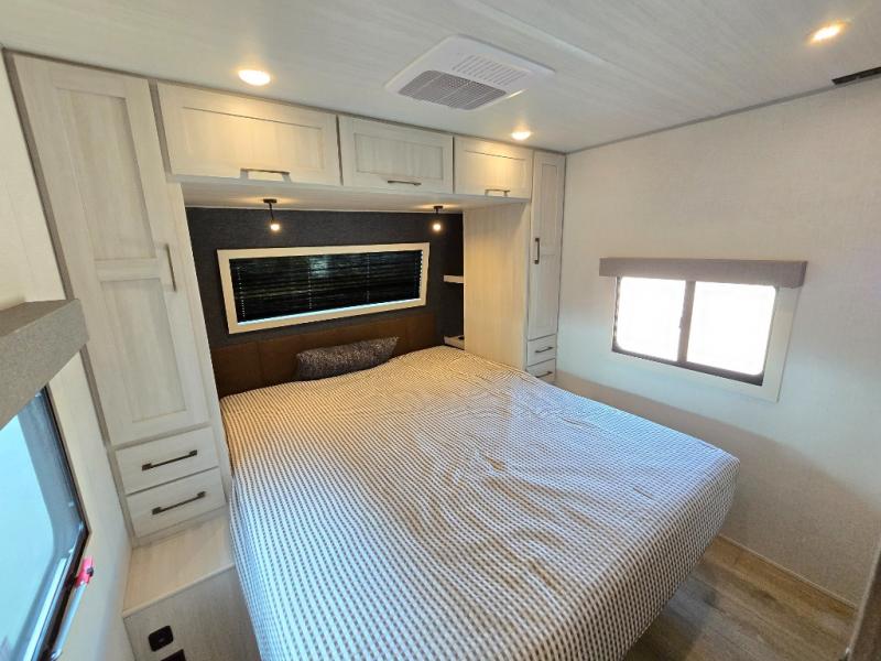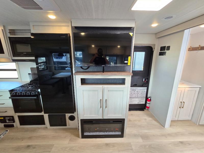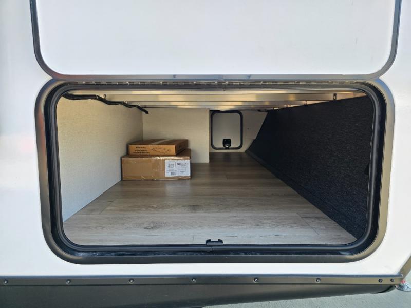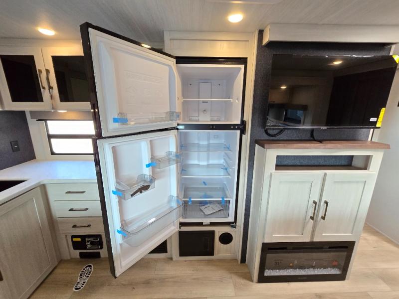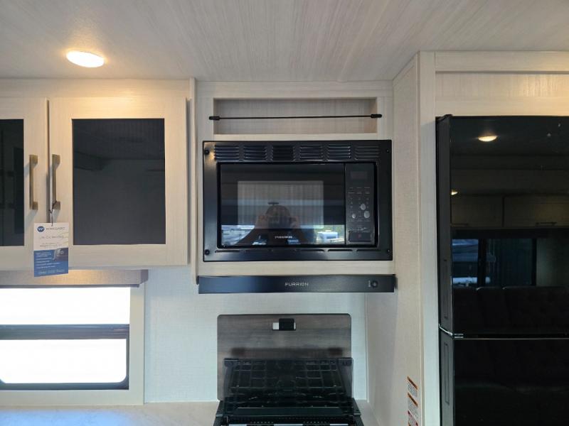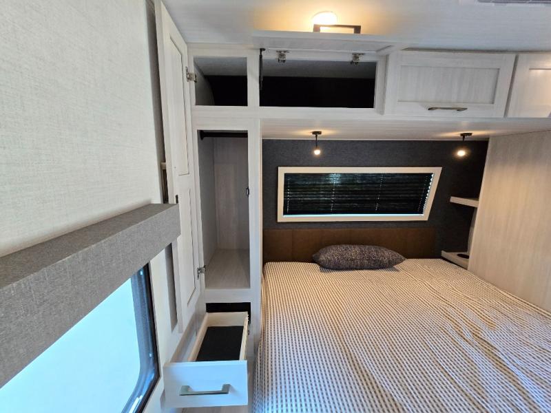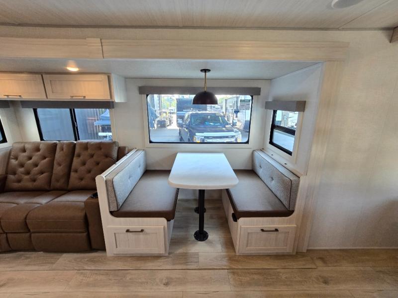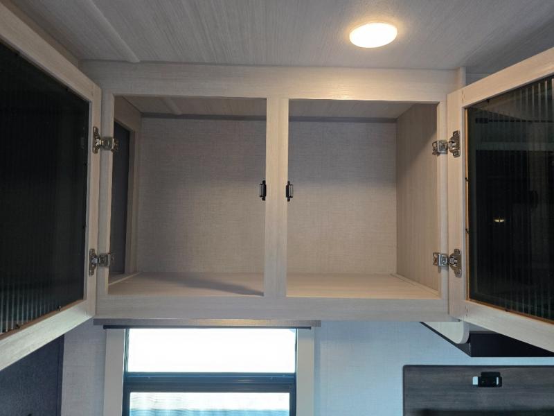 No need to rough it when you camp; this trailer offers amenities that allow you to "Glamp" if you want! The rear spacious bathroom is tucked away behind a beautiful barn door, and inside features a shower, wardrobe, and linen storage. The front master bedroom offers privacy, a walk-around custom king bed, dual wardrobes and underbed storage, plus TV prep if you want the option to watch movies in bed. The L-shaped counter in the kitchen provides enough space to have everything at your fingertips while you cook, plus there is a countertop extension for more prep and serving space if needed. A nice walk-in pantry just inside the entry door will be perfect for chips and snacks or canned goods for those longer camping trips. If dining inside, the booth dinette with pull-out dinette drawers will be comfortable plus you will enjoy the view provided by the panoramic windows within the slide out. An outside kitchen will be a favorite for anyone that cooks, and the 19' awning will provide some protection from the elements and offering an outdoor living area to enjoy with everyone.