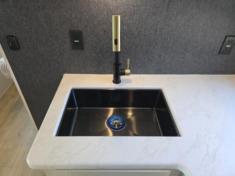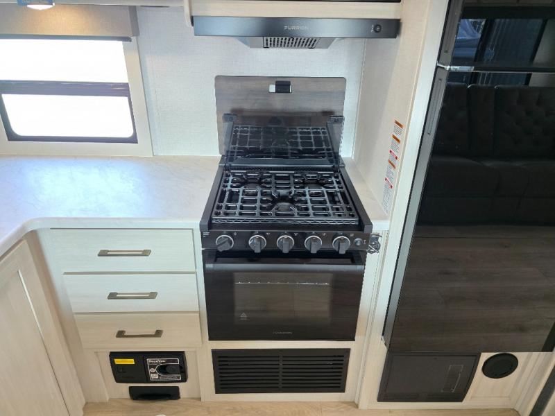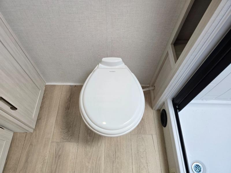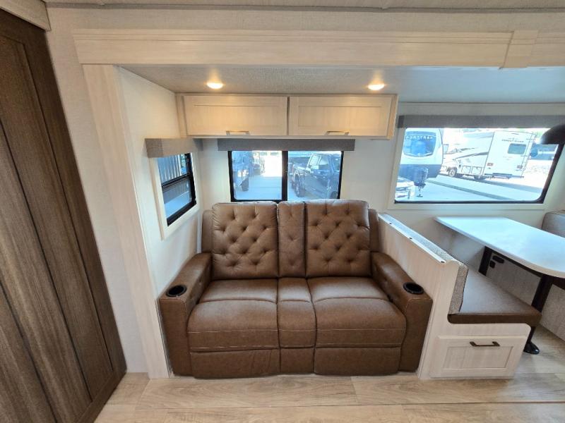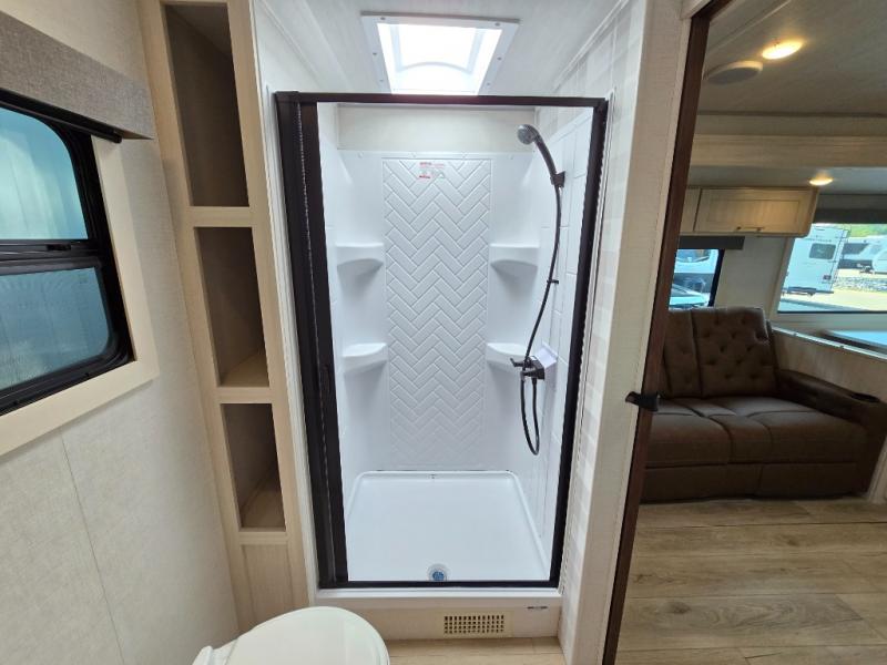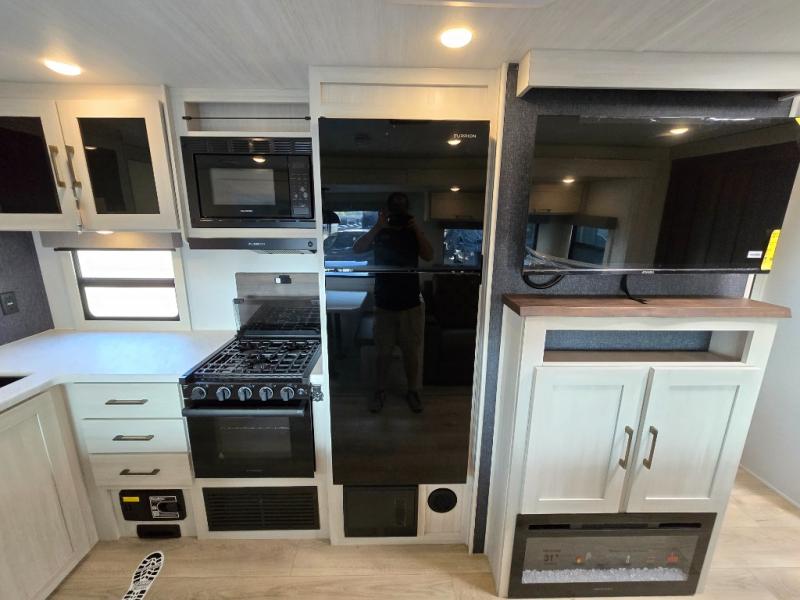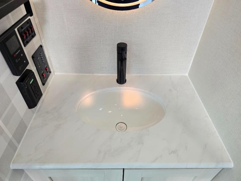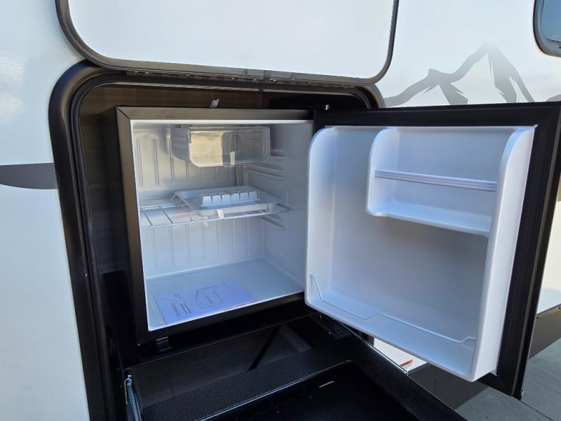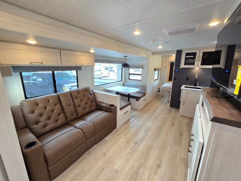 No need to rough it when you camp; this trailer offers amenities that allow you to "Glamp" if you want! The rear spacious bathroom is tucked away behind a beautiful barn door, and inside features a shower, wardrobe, and linen storage. The front master bedroom offers privacy, a walk-around custom king bed, dual wardrobes and underbed storage, plus TV prep if you want the option to watch movies in bed. The L-shaped counter in the kitchen provides enough space to have everything at your fingertips while you cook, plus there is a countertop extension for more prep and serving space if needed. A nice walk-in pantry just inside the entry door will be perfect for chips and snacks or canned goods for those longer camping trips. If dining inside, the booth dinette with pull-out dinette drawers will be comfortable plus you will enjoy the view provided by the panoramic windows within the slide out. An outside kitchen will be a favorite for anyone that cooks, and the 19' awning will provide some protection from the elements and offering an outdoor living area to enjoy with everyone.