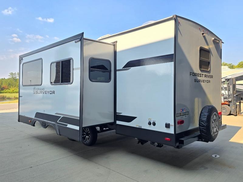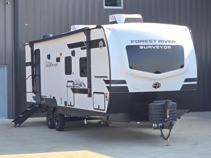 With any Grand Surveyor travel trailer by Forest River you will enjoy turn-key ready-to-go features and quality construction! Each model includes Azdel composite walls and a gel coated fiberglass front cap with an automotive style tinted windshield for a sleek look. There are friction hinge black glass entry door(s), an adjustable platform step with a night light, plus Goodyear tires and a power tongue jack for easy towing. The interior will have you feeling right at home with roller shades, residential faucets, sinks, and bathroom vanity, plus Surf(x) seamless countertops throughout. You can also plan for adventure with a 2" rear accessory and exterior spray port, and there are slam latch exterior baggage doors throughout to keep all your gear secure. Other stand-out features include a central vacuum system, a 200 watt solar panel with a 30 amp controller, a tankless water heater, carpet-free interiors, and the list goes on!